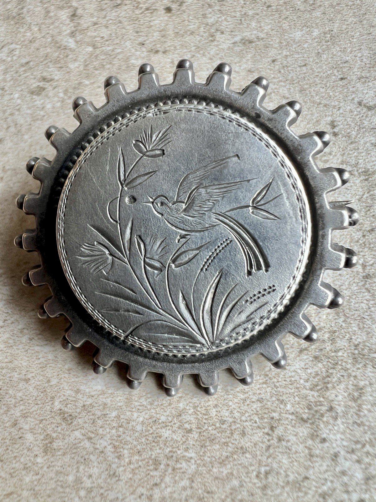 Round silver brooch, solid tested with the stone, touched with the appropriate acid for silver, period, Napoleon III, original patina. Subsequent restoration of the fastening system, the old restoration as was often customary, is solid. Dimensions of the brooch approximately 4 cm in diameter. Its weight 6.4 g. Condition: Used: Item has been worn. ...Used: Item has been worn. any potential imperfections. Type: Brooch Brand: Antique Country of origin: France Dominant color: Silver Material: Solid silver Metal: Sterling silver Theme: Bird