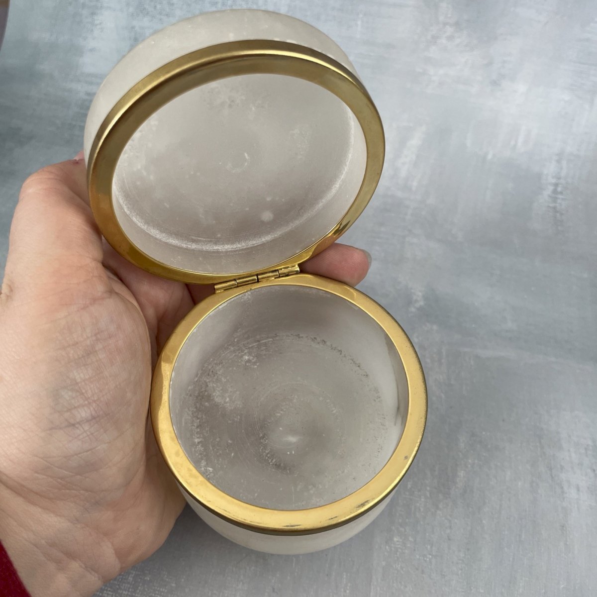 Small vintage round box in alabaster jewelry box or other Diameter ~ 8 cm Height ~ 5.5 cm Weight ~ 0.32 kg Very good condition, with some light signs of age (scratches, chips, etc.), see photos Consider grouping your purchases to reduce shipping costs! Subtype: Box Material: alabaster