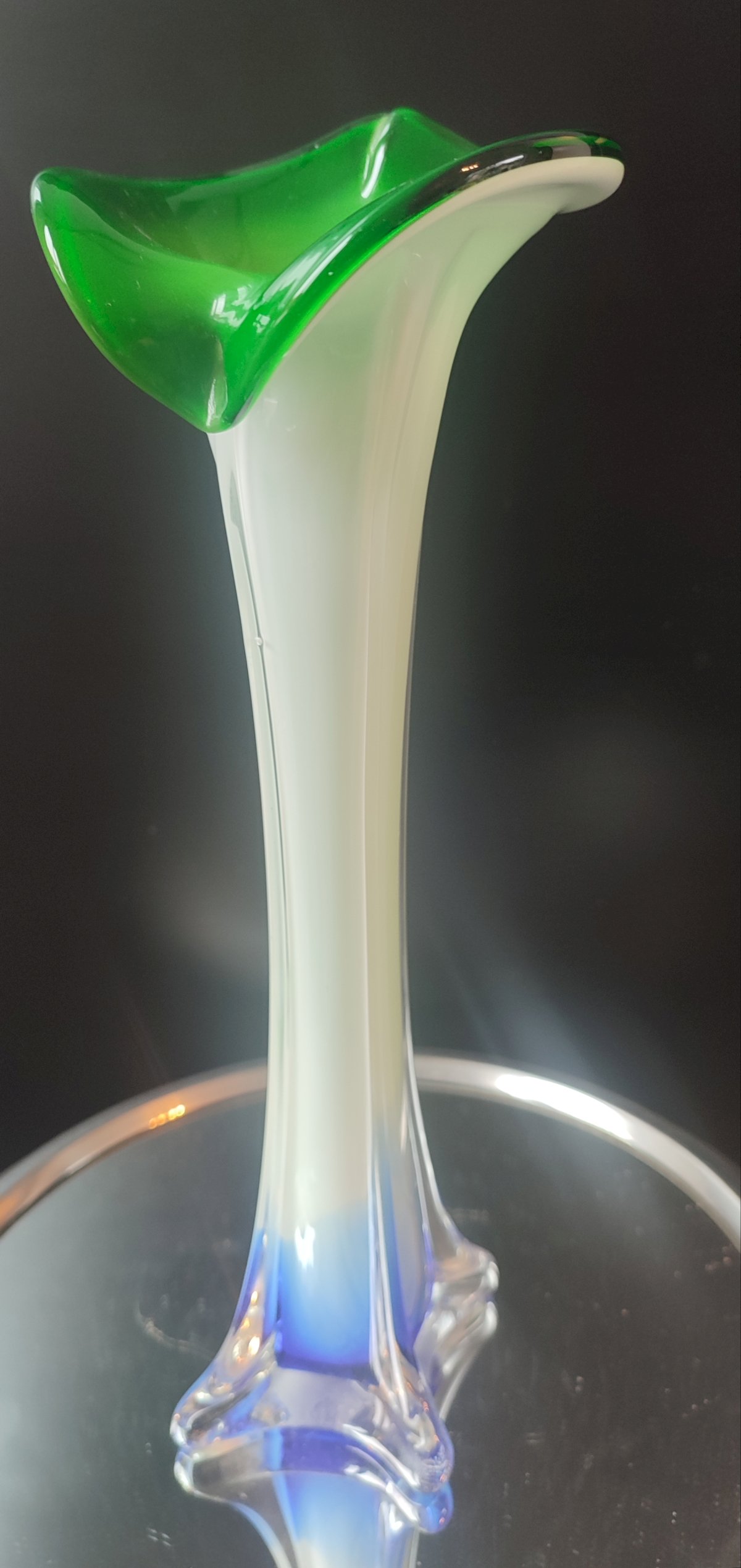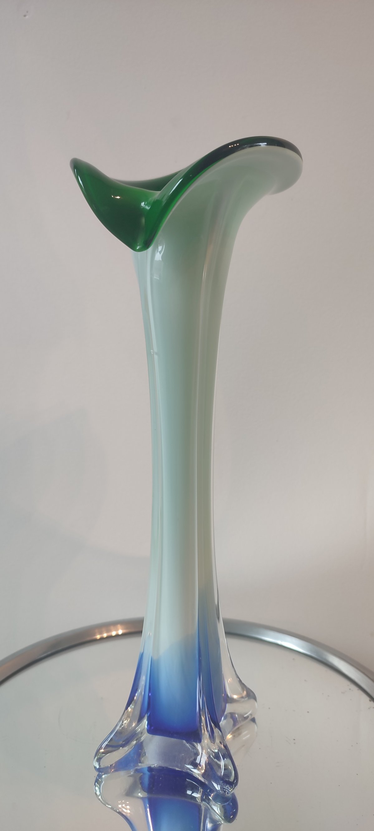 1960s/70s vase, handcrafted mouth-blown glass. It uses the Incamiciato technique (multi-layered) offering a tricolor gradient of green, white, and blue.