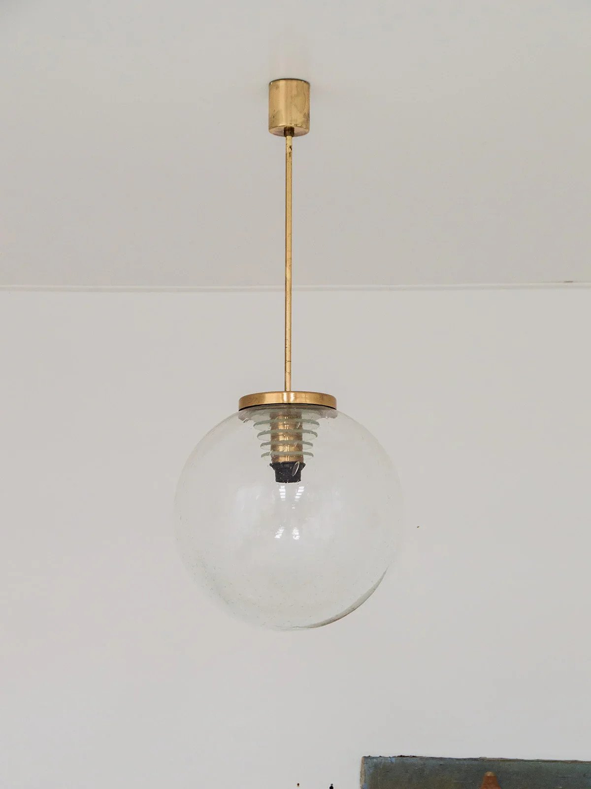 Add a touch of elegance to your interior with the large glass globe pendant light. Featuring a generous socket and a gold structure hook, this lamp emits a soft, warm light, perfect for creating a cozy ambiance. Its timeless design fits seamlessly into any decor style while adding a touch of sophistication. Illuminate your spaces with this modern and refined piece. Height: 82 cm Diameter: 32 cm Condition: Used: Item that has been used. Item showing some signs of superficial wear... Used: Item that has been used. Item showing some signs of superficial wear, fully operational and functioning correctly. It may be a demonstration model or an item returned to the store after a short period of use. any potential imperfections. Brand: Debongout Type: Vintage find Product: Yes Style: Contemporary