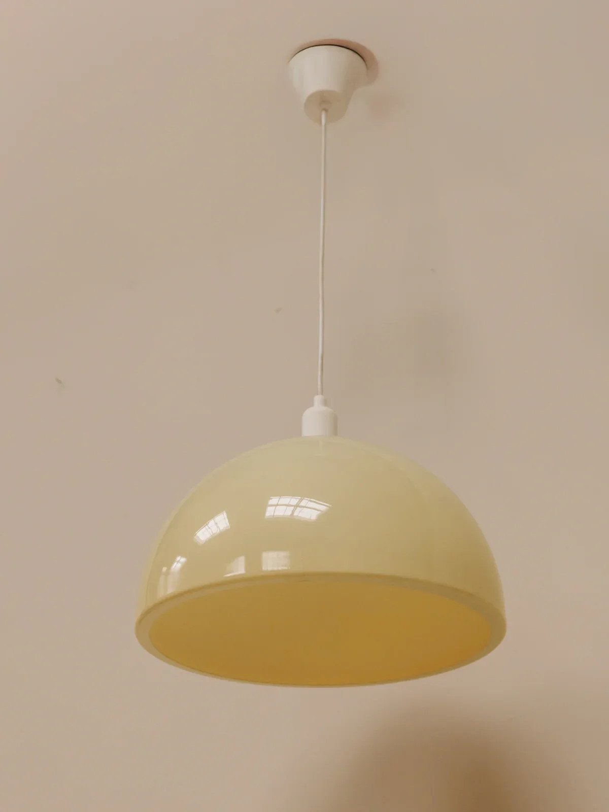 Add a retro touch with this yellow globe pendant light from the 70s, featuring a sleek design that evokes the creative spirit of its era. Its generous volume diffuses a soft and warm light, perfect above a dining table or in a living room to create a welcoming atmosphere. Its shade and silhouette harmonize well with both vintage interiors and contemporary décor, bringing character and subtle modernity. Shade height: 40 cm Shade diameter: 44 cm Condition: Used item. Item shows some superficial signs of wear... Used item. Item shows some superficial signs of wear, fully operational and functioning correctly. It may be a demonstration model or an item returned to the store after a short period of use. Possible imperfections. Brand: Debongout Type: Vintage product Style: Contemporary Material: Plastic Vintage: Yes