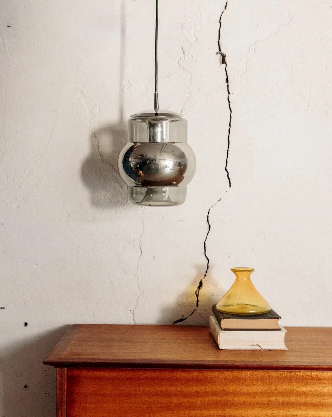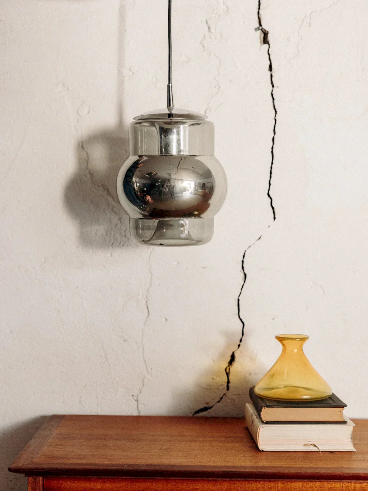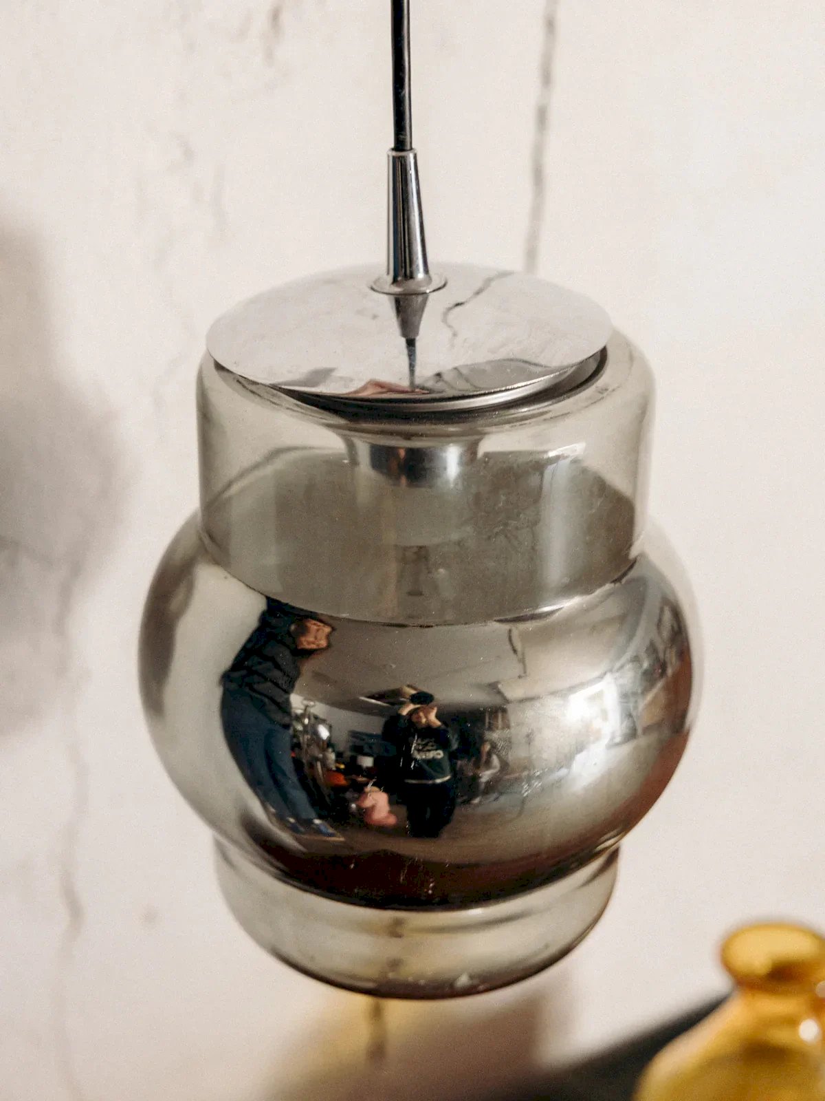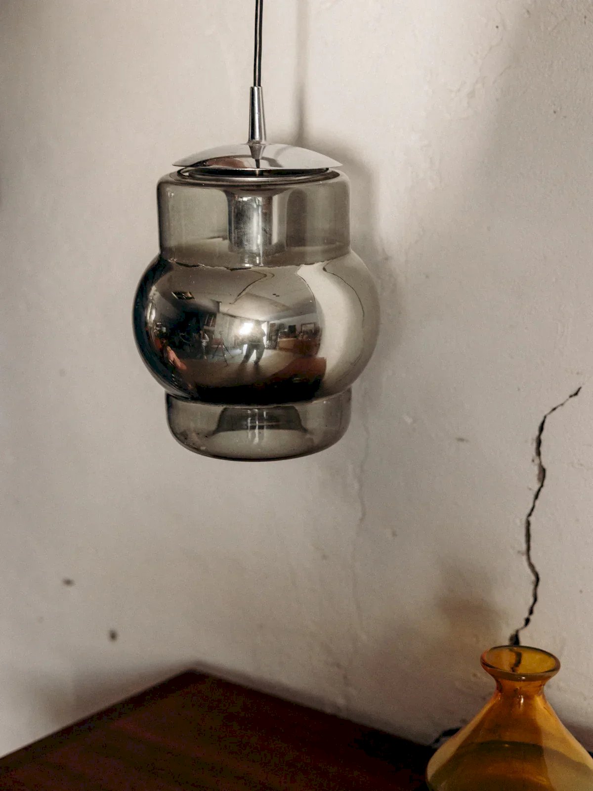 Add a unique touch to your interior with this glass and chrome pendant light, whose interior is subtly painted in a mercury style. Its mirrored effect diffuses a soft and enveloping light. The black metal fixture contrasts elegantly with the shiny glass. Ideal above a table or in a living room, it catches the eye without being overwhelming. A piece with discreet and luminous charm. Height: 70 cm Diameter: 16 cm Condition: Used: Item has been used. Item shows some superficial signs of wear... Used: Item has been used. Item shows some superficial signs of wear, fully operational and functioning correctly. It may be a demonstration model or an item returned to the store after a short period of use. Possible imperfections. Brand: Debongout Type: Vintage product Style: Contemporary Material: Glass, Chrome Vintage: Yes