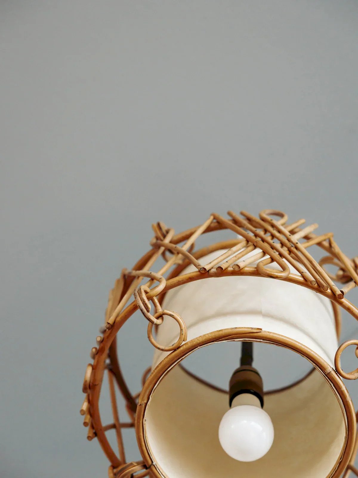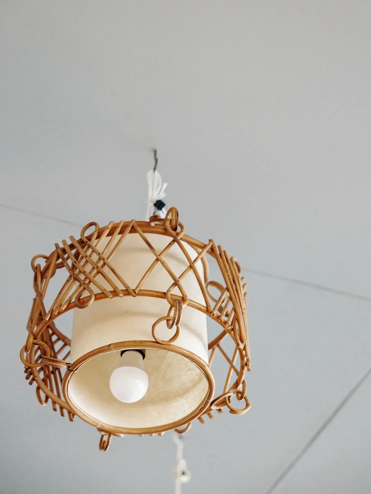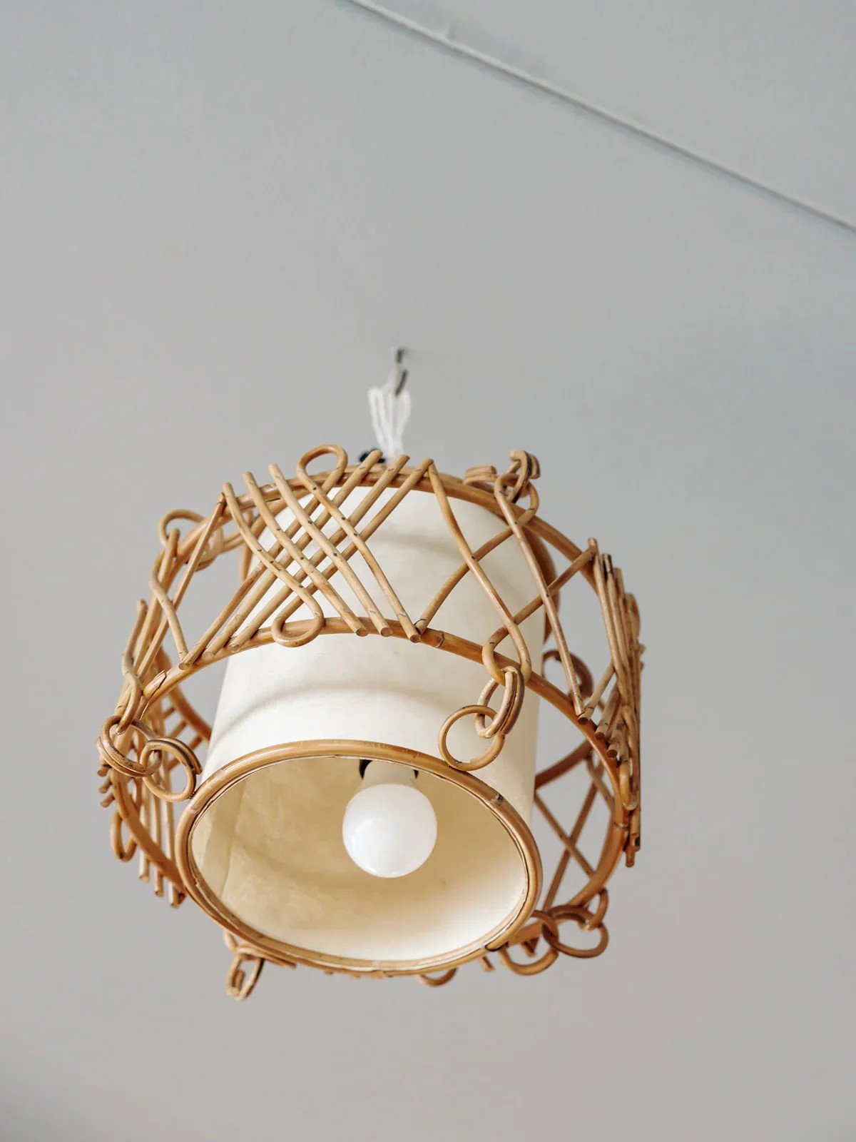 This 70s rattan pendant light adds a retro and warm touch to your interior. Its organic design and woven texture create a soft and authentic atmosphere, perfect for vintage or bohemian decoration. Ideal for illuminating your space with style, it adds a note of charm and character to any room. Web exclusive, the meeting will take place at your home! Height: 26 cm Diameter: 36 cm Condition: Pre-owned: Item has been used. Item shows some superficial signs of wear,... Pre-owned: Item has been used. Item shows some superficial signs of wear, fully operational and functioning correctly. It may be a demonstration model or an item returned to the store after a short period of use. Any imperfections. Brand: Debongout Type: Curated product Style: Contemporary Material: Canvas, Rattan Vintage: Yes