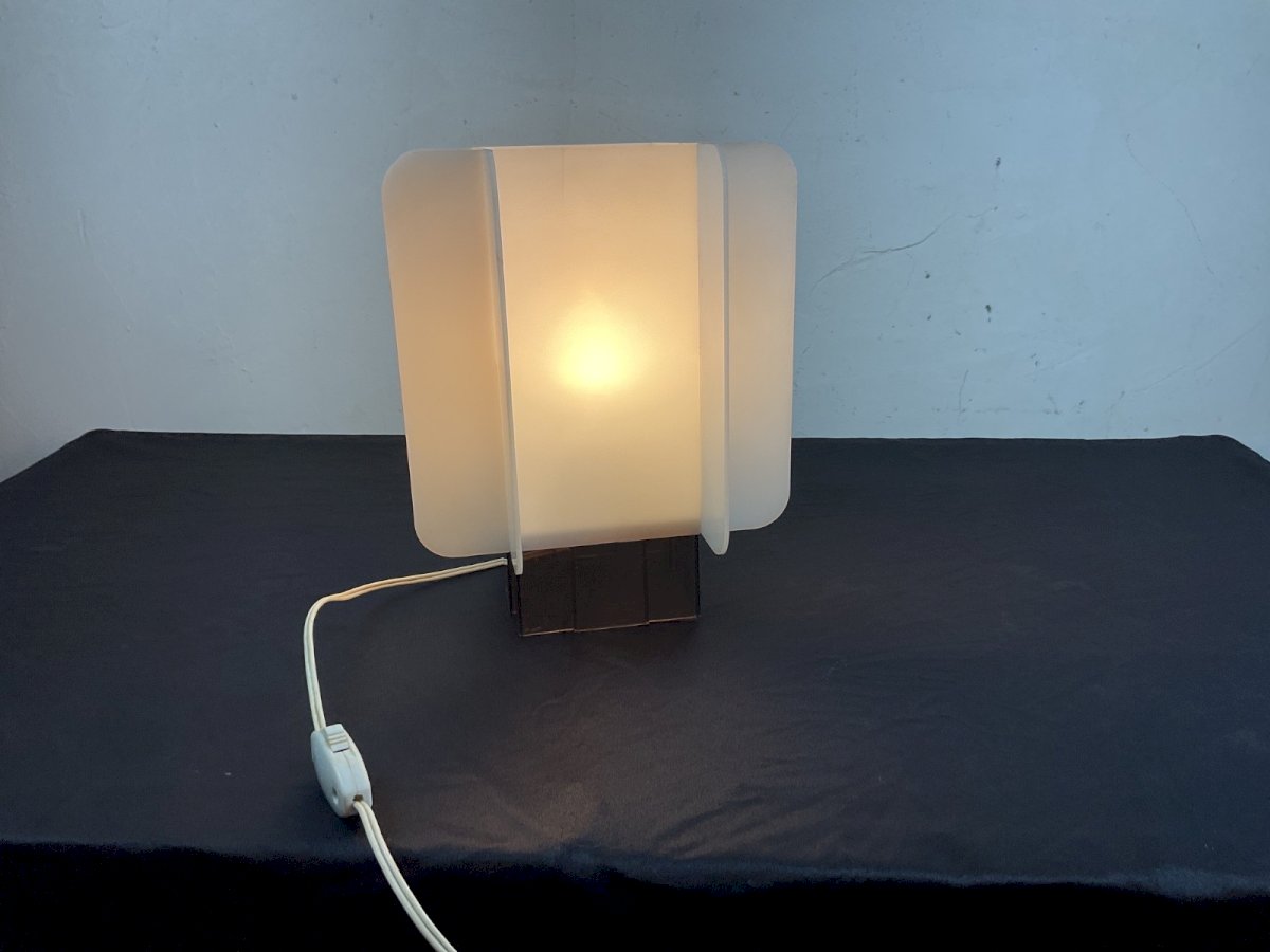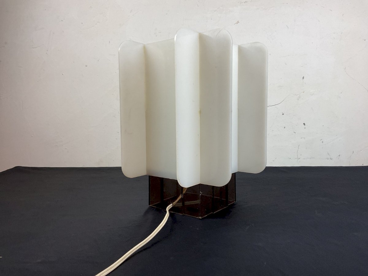 Space Age 70 Table lamp plexiglass 1970 Height: 25 cm Dimension: 20.5 x 20.5 cm Please note it has been re-glued Type: Table lamp Period: Space Age Dominant color: White Style: 1970 Material: Plastic