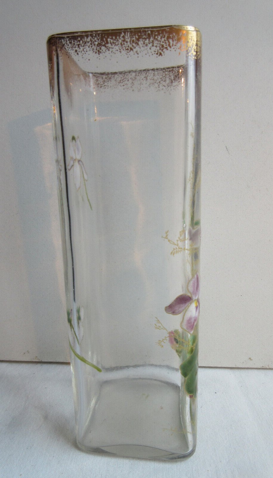 Worldwide sale. Legras enamelled vase: scattered violets. Superb antique colorless glass vase. It is a small square-shaped vase. It is enamelled with violets on the front and back. The enamel is thick with fine strands of grass silk-screened in 24-carat gold. At the top, the edge is painted in 24-carat gold. The bottom has the number 12. Pretty refined vase with delicate decor. See signature underneath. 5 cm on each side and 15 cm high. Good condition. Fresh and decorative, ideal for collection. The photos complement the description. Brand: Legras