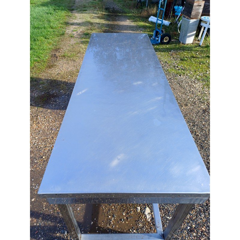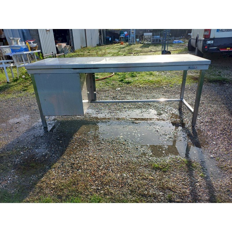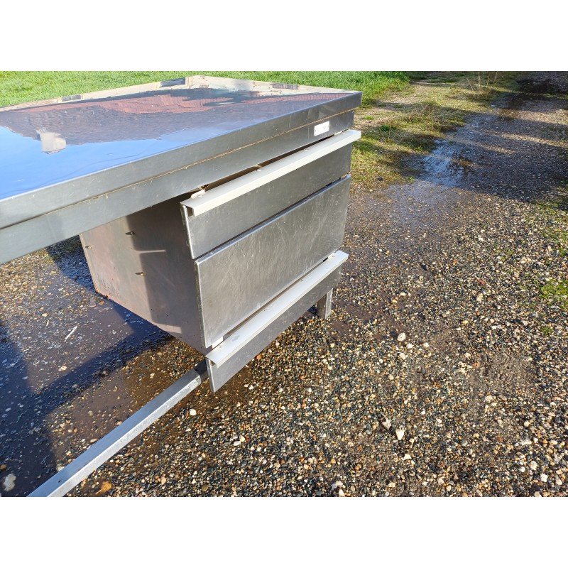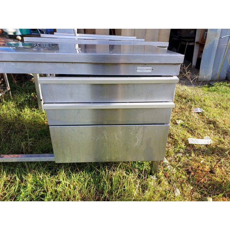 Stainless Steel Table for Collectivity with 3 Drawers and Plastic Bins, 1 Shelf, Height: 85 cm, Length and Width: 210 cm by 70 cm, in very good condition.