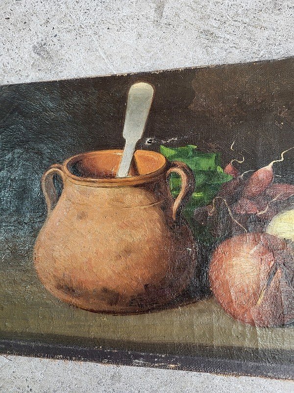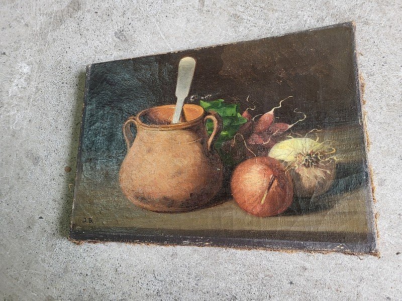 Beautiful still life painting signed "JB". It is in fair condition as the canvas is torn, please look at the photos before buying. It measures 35.3 cm wide by 24.5 cm high. Features: Signed. Theme: Still life.