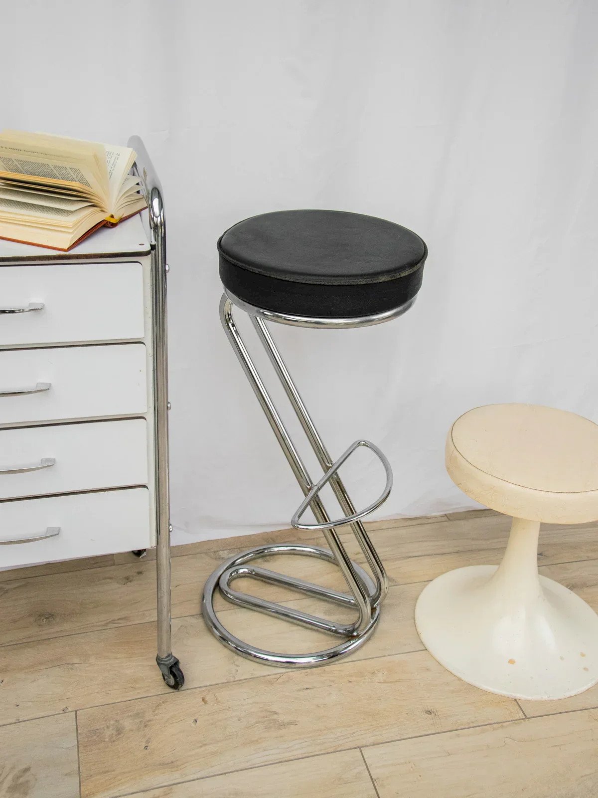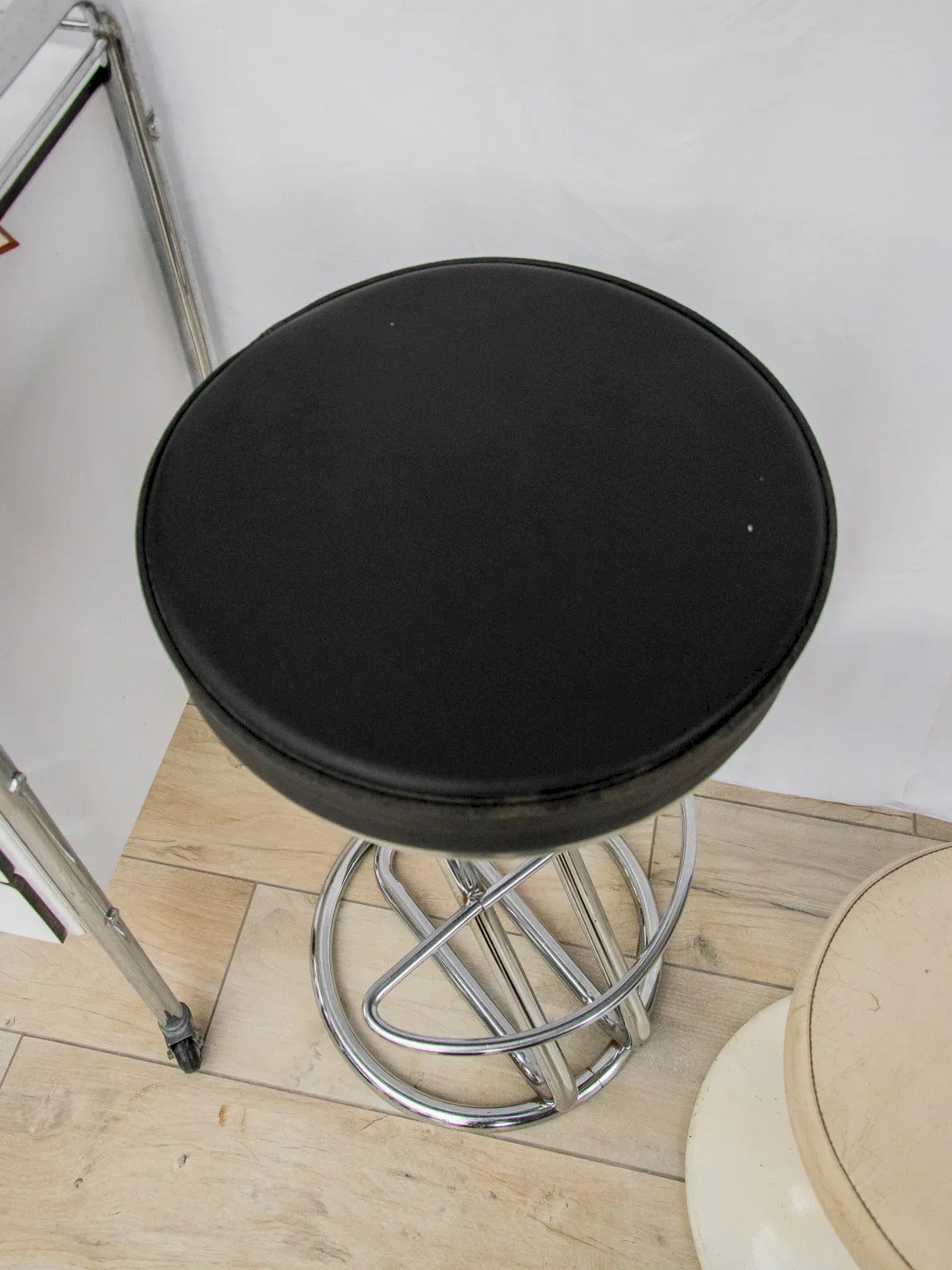 Adopt this high bar stool with an elegant marriage of polished chrome and treated leather, which adds a contemporary and bright touch to your kitchen or bar space. Its slender structure ensures a discreet presence while offering seating comfort designed for convivial moments, and the protected surfaces make daily maintenance easy. Its graphic silhouette fits well in both a modern interior and a warmer decor. Light traces of wear around the seat perimeter. Height: 82 cm Seat height: 82 cm Diameter: 37 cm Condition: Used: Item that has been used. Item showing some superficial signs of wear, fully operational and functioning correctly. It may be a demonstration model or an item returned to the store after a short period of use. Any imperfections. Color: Multicolor Height: Chrome, Leather, Metal, Foam Width: Bar stools Brand: Debongout Type: Vintage product Material: Chrome, Leather, Metal, Foam Style: Contemporary.