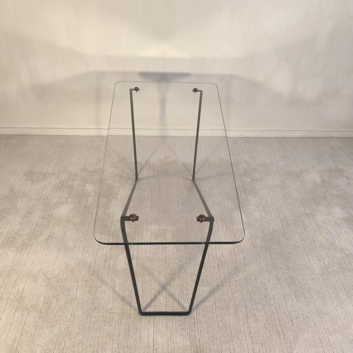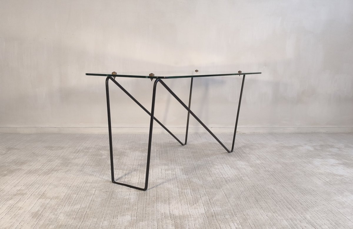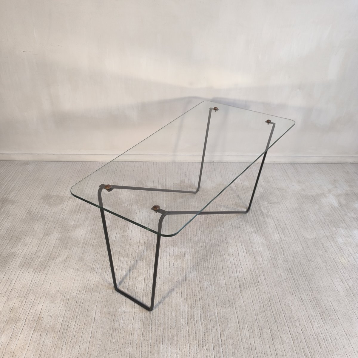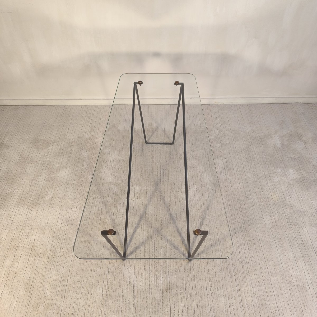 The table consists of a black lacquered metal frame and an asymmetrical clear glass top with rounded corners. The top part is connected to the base by 4 round brass finials. The base and glass top are in beautiful condition. The glass has no chips or cracks and very few signs of use considering its age.