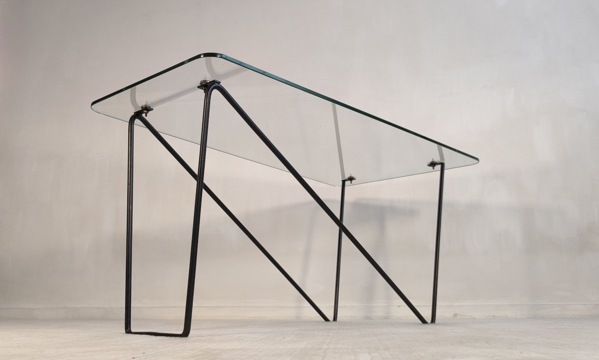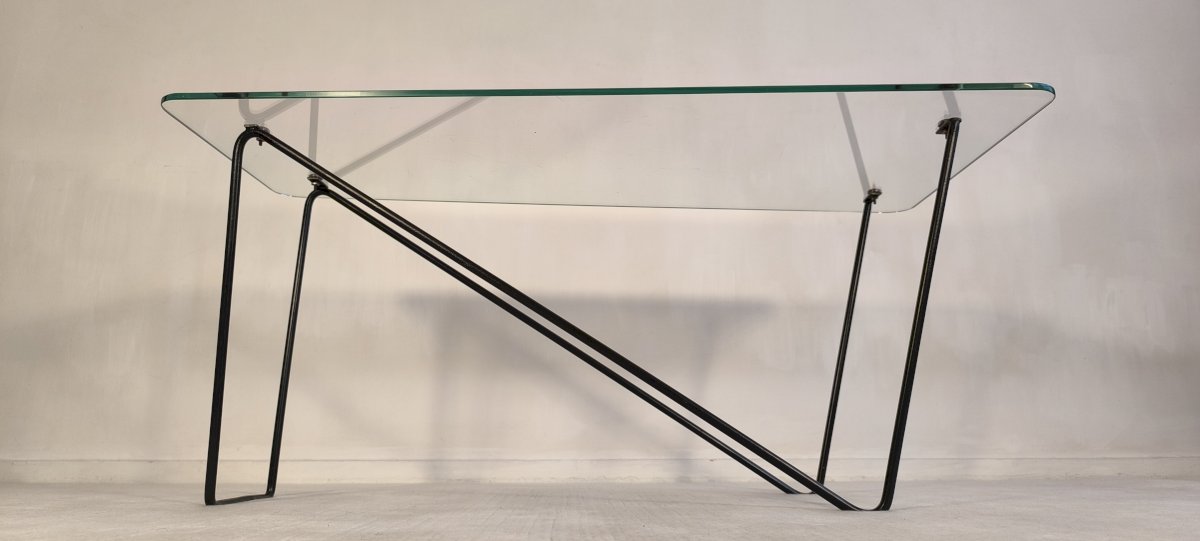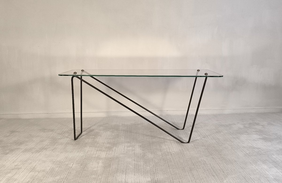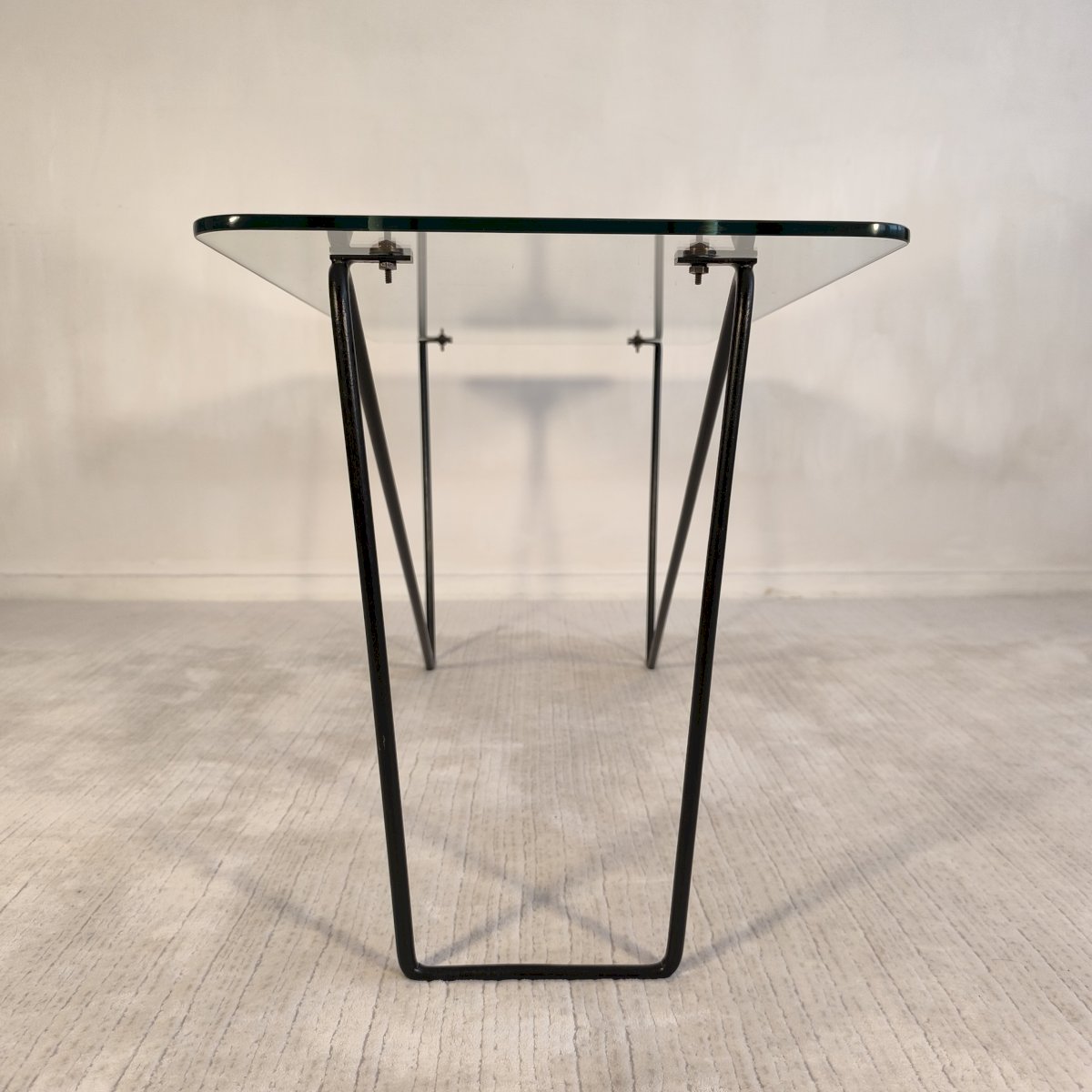 The table consists of a black lacquered metal frame and an asymmetrical clear glass top with rounded corners. The top part is connected to the base by 4 round brass finials. The base and glass top are in beautiful condition. The glass has no chips or cracks and very few signs of use considering its age.