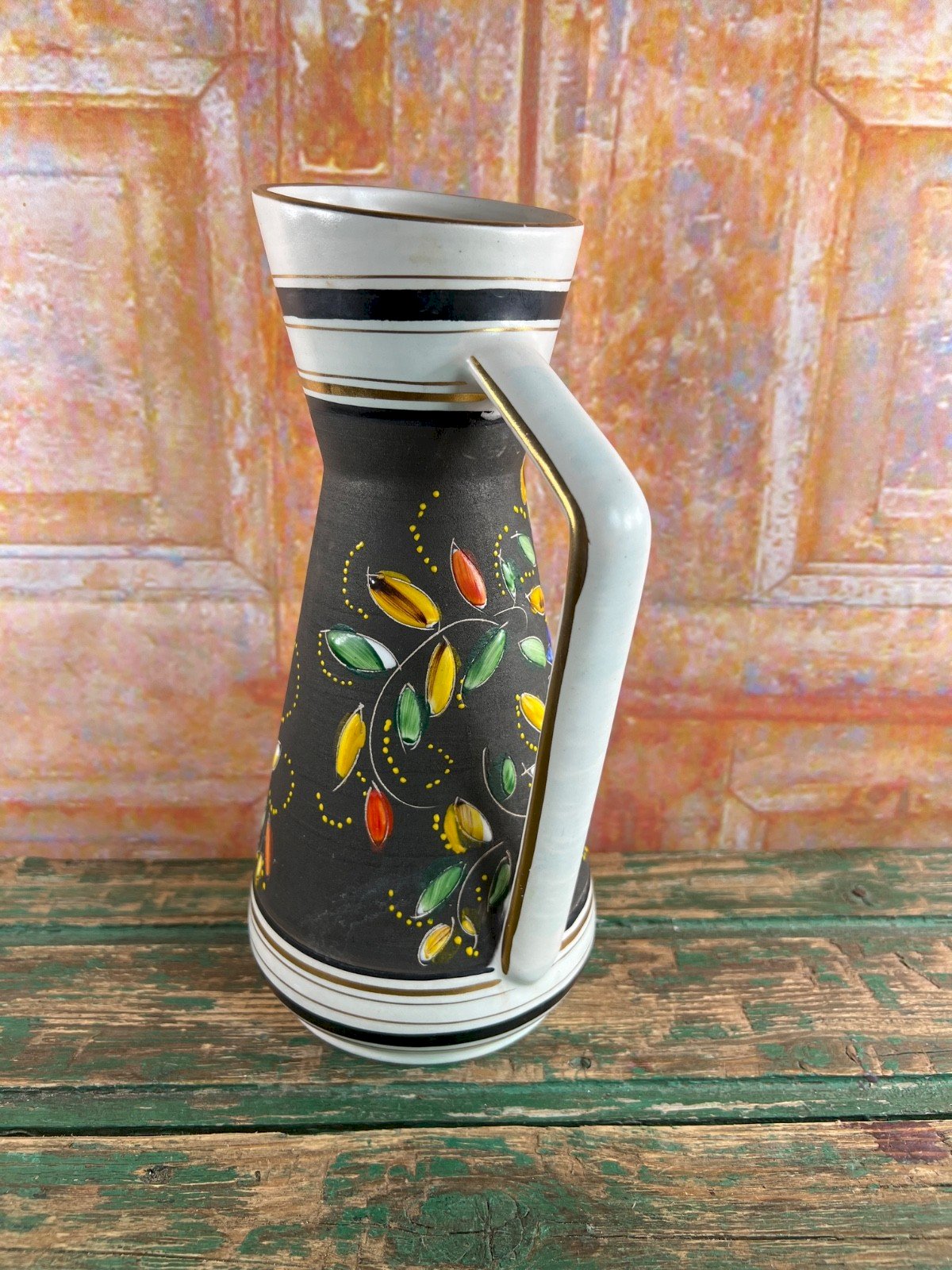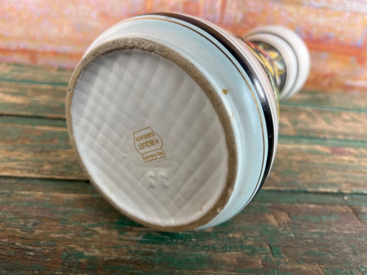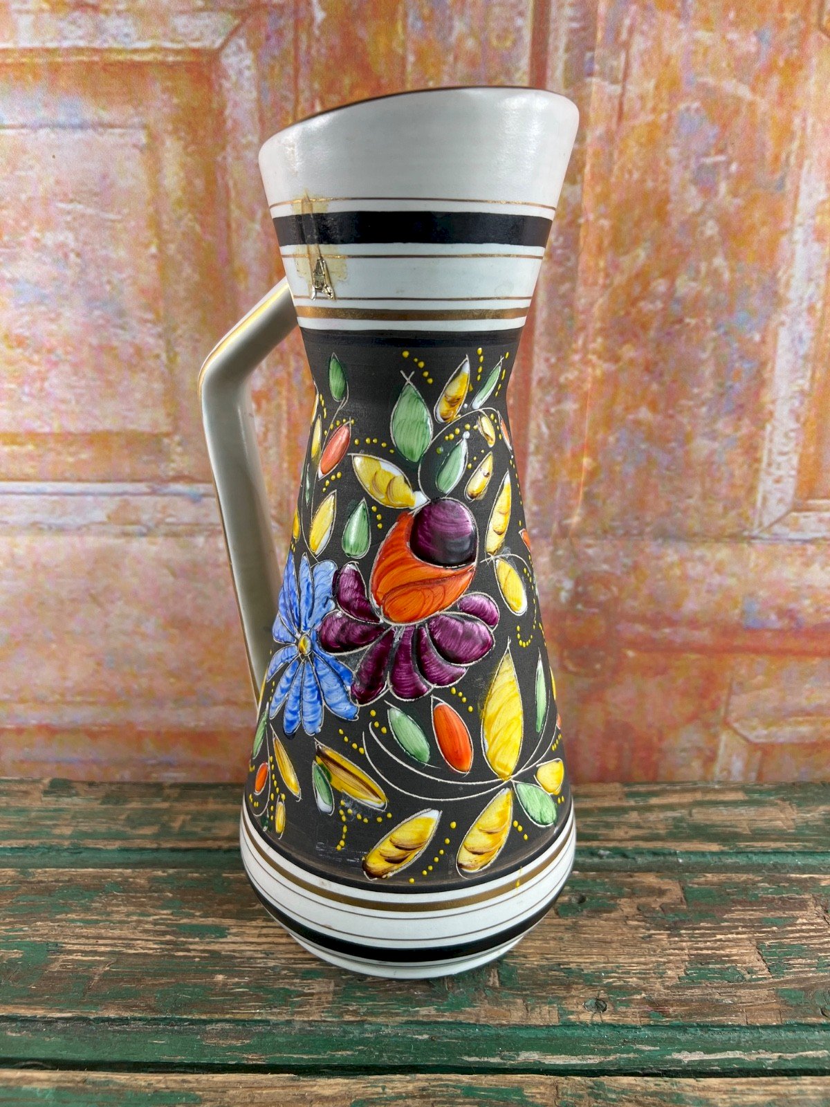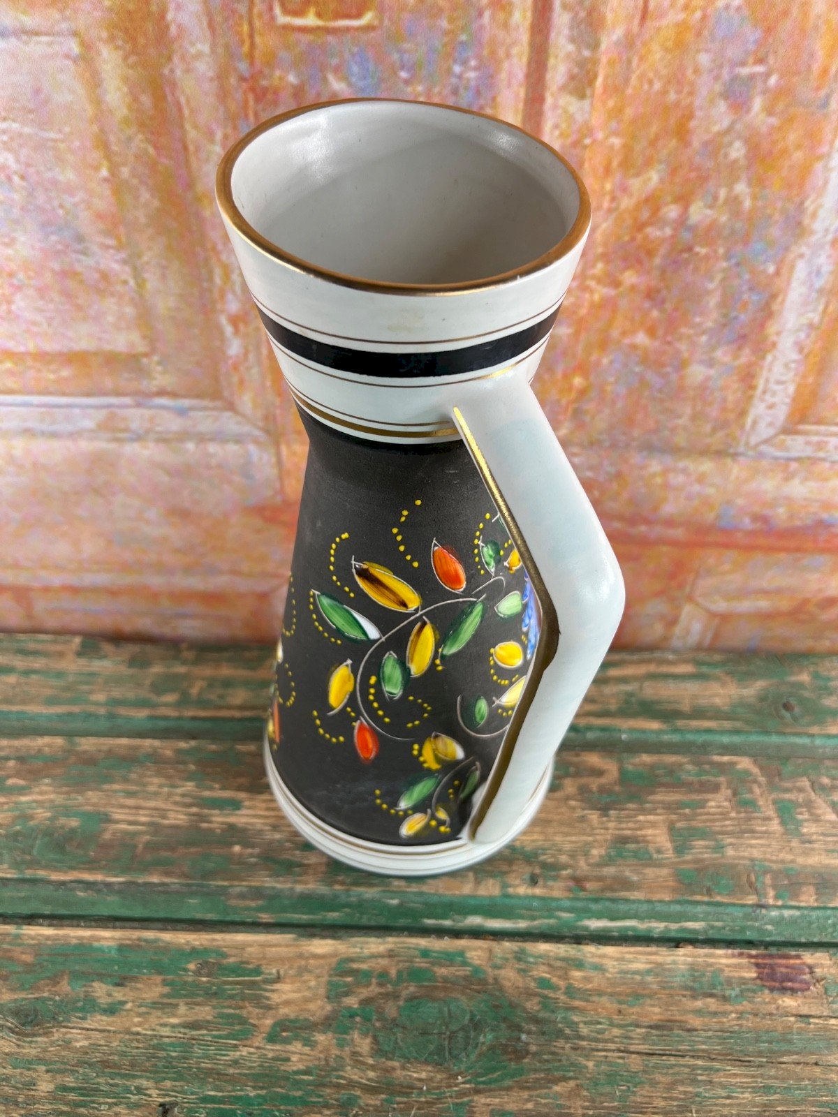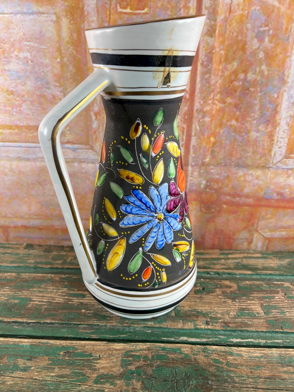 Stunning vintage decorative pitcher signed H. Bequet Quaregnon – Belgium – 1950s Magnificent decorative pitcher in polychrome glazed earthenware, signed H. Bequet – Quaregnon (Belgium). Made in the 1950s, this typical model of Belgian modernist style captivates with its clean lines, elegant conical shape, and geometrically emphasized handle highlighted with a golden thread. The stylized floral decoration, hand-painted on a matte black background, showcases bright and vibrant colors: red, yellow, green, blue, purple. A characterful piece, ideal for vintage decoration or an art ceramics collection. Features: Signature: H. Bequet Quaregnon – Made in Belgium Era: circa 1950 Material: Glazed earthenware Height: 26 cm (10.2") Base diameter: 12 cm (4.7") Decoration: hand-painted floral, black background, golden highlights Condition: general good condition, small old trace on the neck (visible in the photo), no major crack or chip. An emblematic object of Belgian design from the 50s, at the crossroads of decorative art and modernism. Perfect as a decorative vase, pitcher, or simple display piece. Country of origin: Belgium.