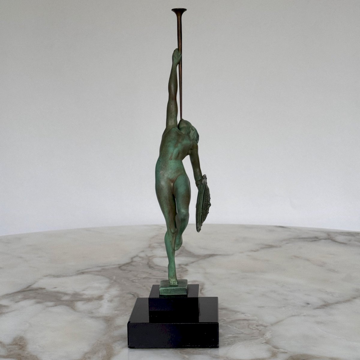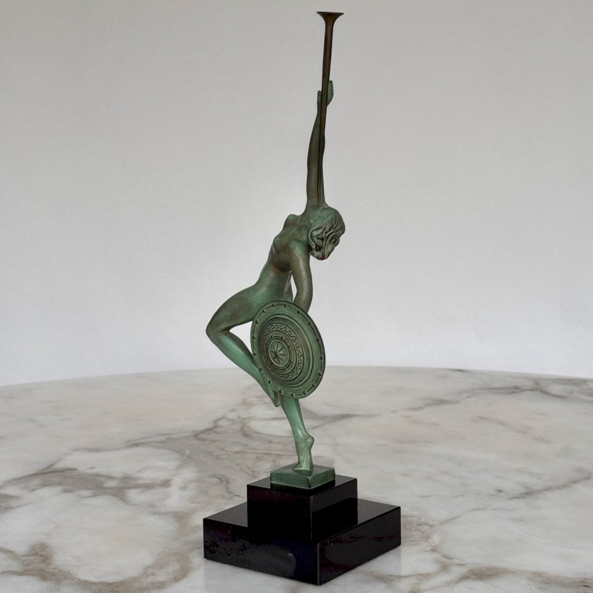 Subject sculpture Jericho by Guerbe Pierre Le Faguays for Max Le Verrier 1930 M4014 This subject depicts a woman balancing on one foot holding a trumpet, resting on a tiered marble base. It is signed Guerbe, the pseudonym of Pierre Le Faguays. It is an art casting, also known as régule. The piece has charm. The work is in overall good condition, with some small nicks and chips on the marble. Our photos allow you to appreciate the quality of the item. For the condition, please carefully check the photos. Feel free to zoom in. The photos are an integral part of the description. Dimensions: - total Height: 34 cm Width: 9 cm Depth: 11 cm - statuette Height: 29.5 cm Width: 6 cm Depth: 11 cm P: 1723514 I remain at your disposal for any questions. Period: 20th century and contemporary Height: 34 cm Material: Régule Length: cm Width: 9 cm Artist: Guerbe Pierre Le Faguays Type: Statue, Sculpture Brand: Max LE VERRIER Country of origin: France Style: 1930 Dimension (cm): From 31 to 50 Theme: Character