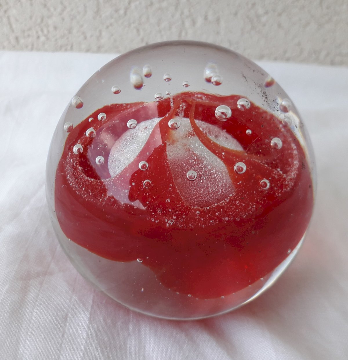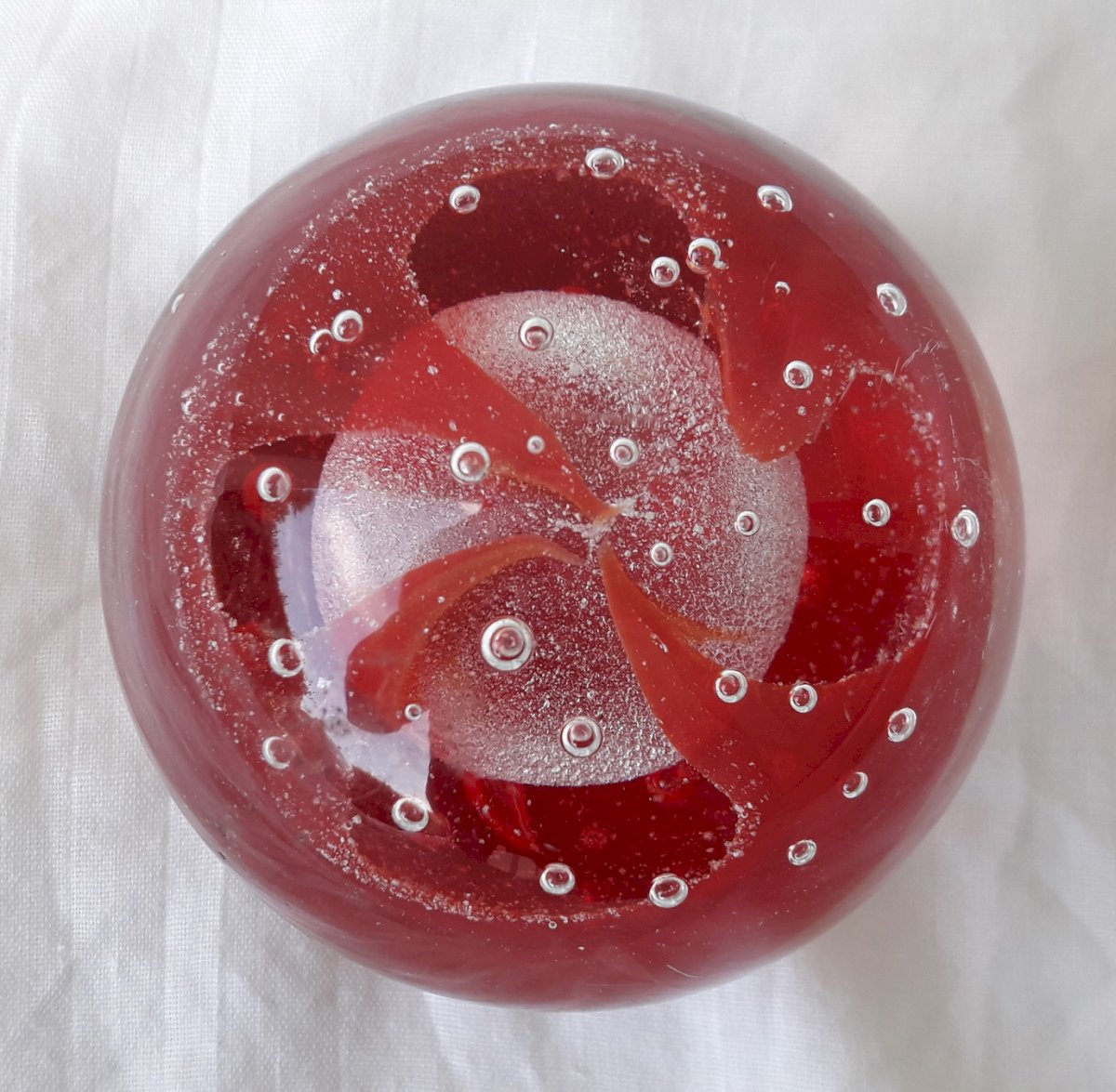 Glass paperweight in sulfur, unmarked, with red decoration.