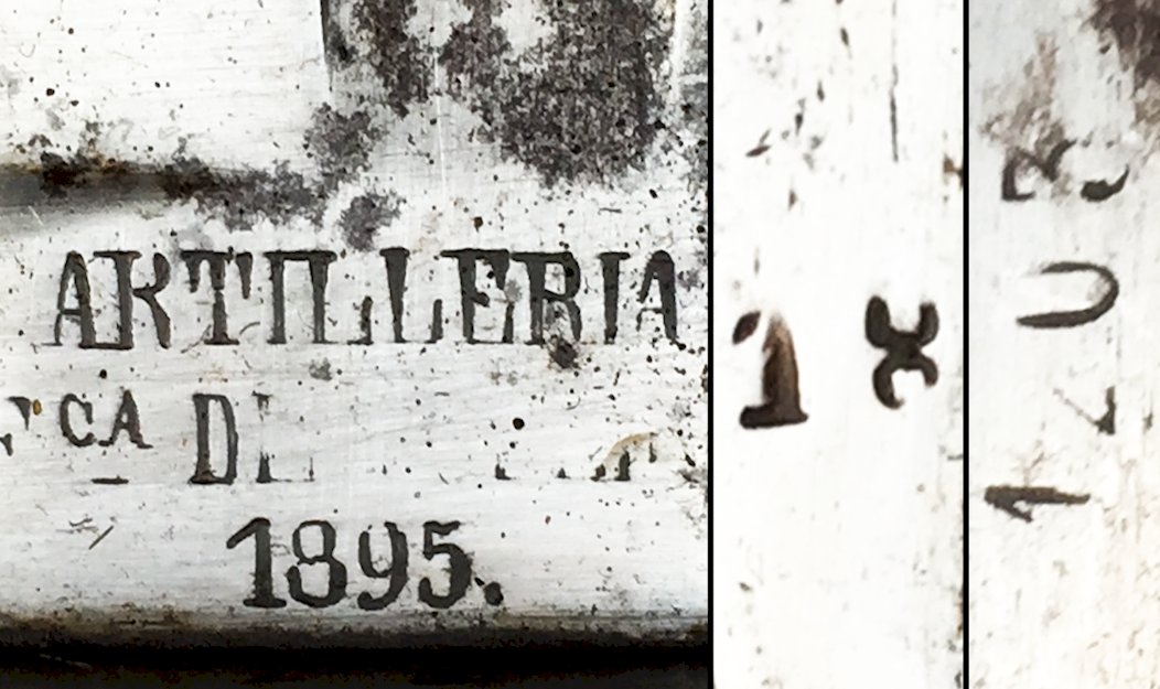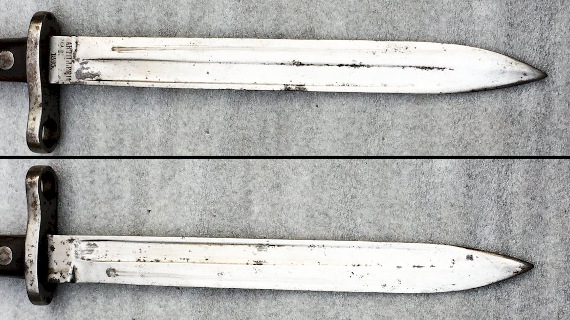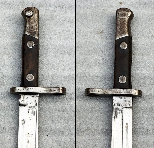 Superb & very beautiful short type Spanish artillery bayonet / machete, model for Mauser rifle. Wooden handle with 2 rivets on each side. Blade marked on the heel ''Artilleria CA D 1895'' + ''1205''. Blade in its own juice with a central gutter! Totally original piece! Blade in good condition, with a central gutter! Very beautiful piece, very pleasant to hold in the hands and even more pleasant to observe in the window! 100% original!