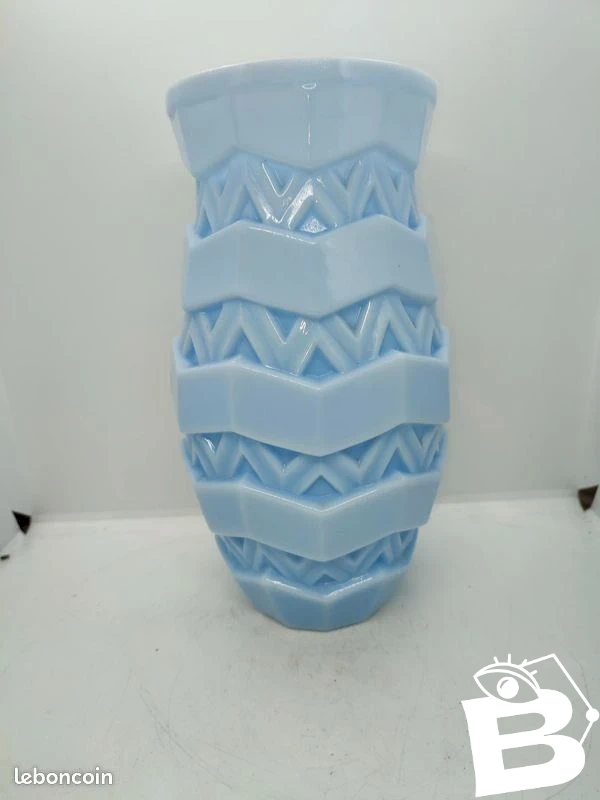Beautiful blue opaline glass vase, Art Deco style, signed at the base, in good condition with just a tiny chip inside the neck. Signature to be recognized, seems to be written 'France' on one side but difficult to read on the other side. Height 26cm...