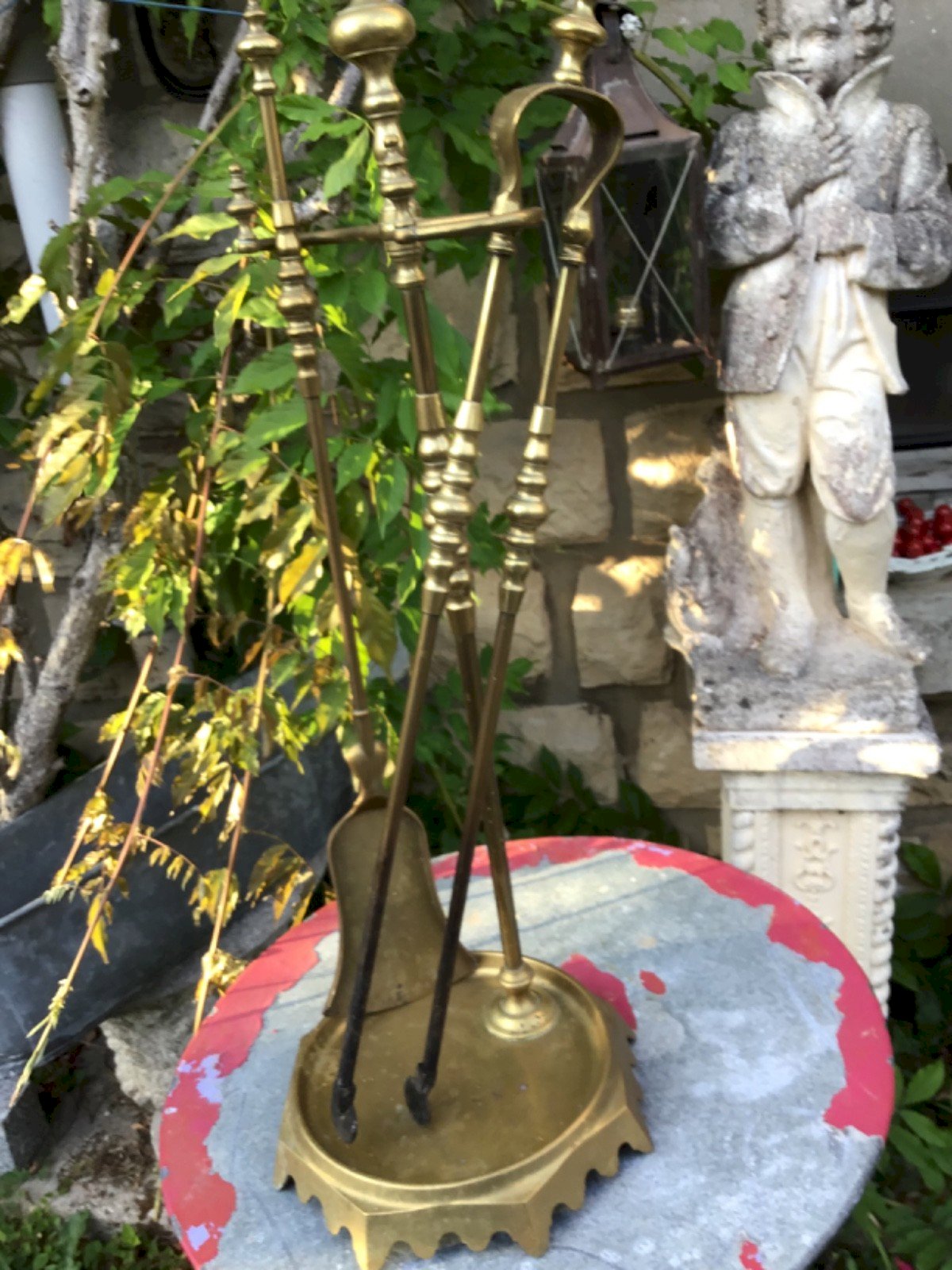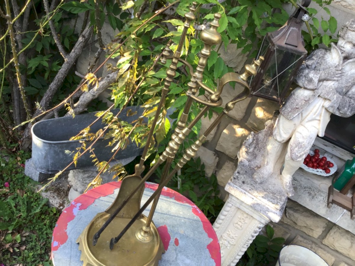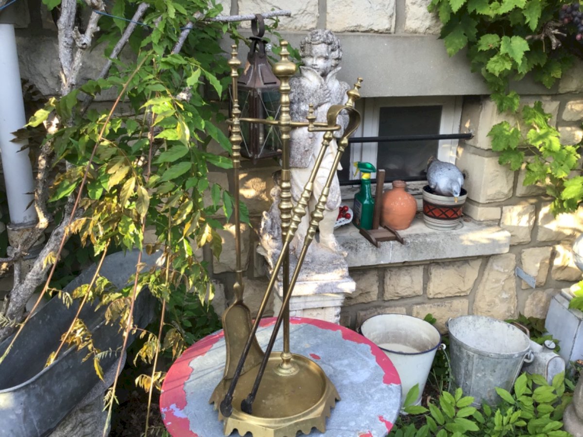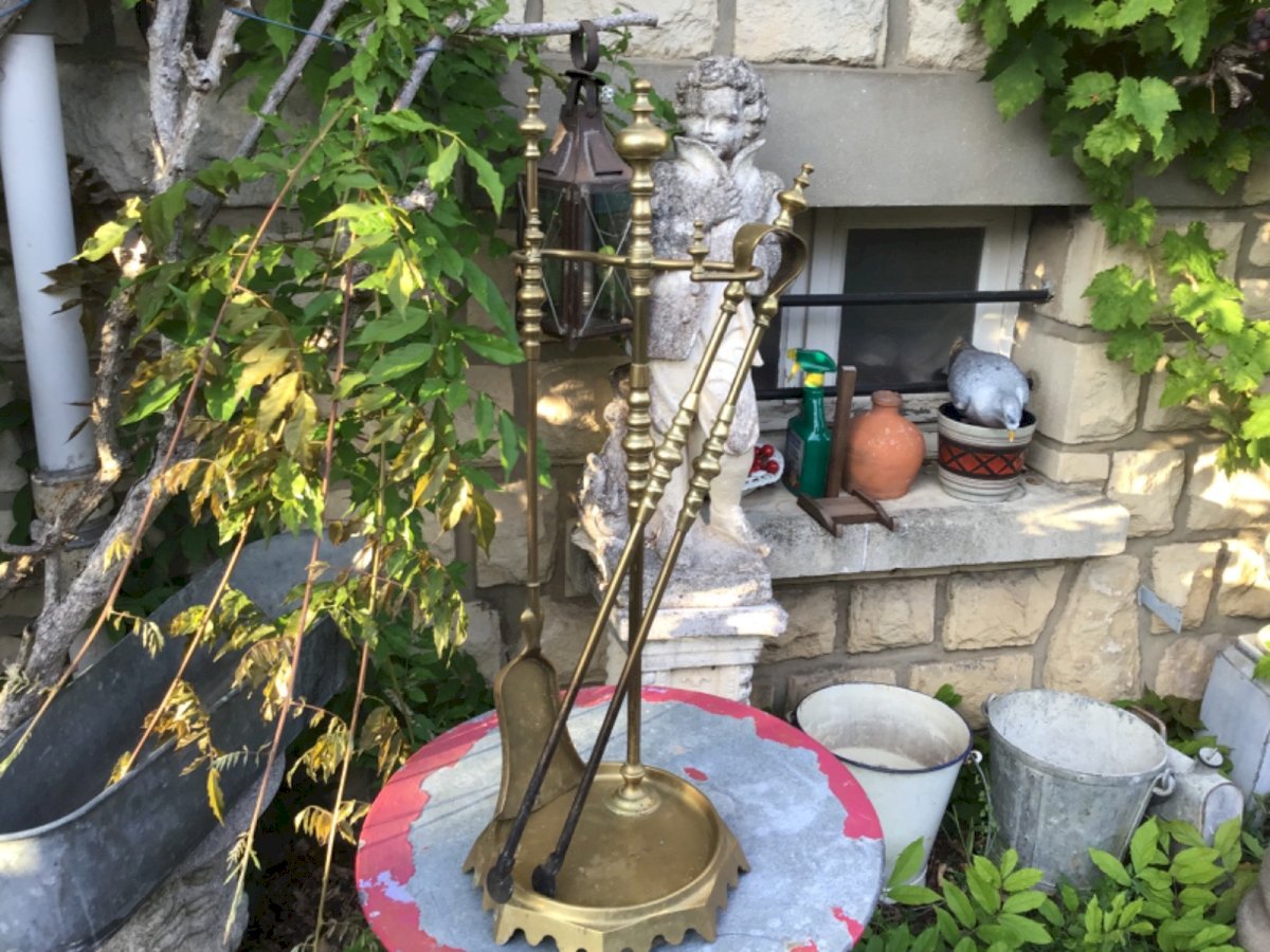 BRONZE FIREPLACE TOOL SET. Support: height 74.5 cm Heavy and very well made. Brand: none Type: fireplace tool set Period: 20th-century design Height: 74.5 cm Material: Bronze Style: 1940-1960 Length: 24 cm Width: 16 cm