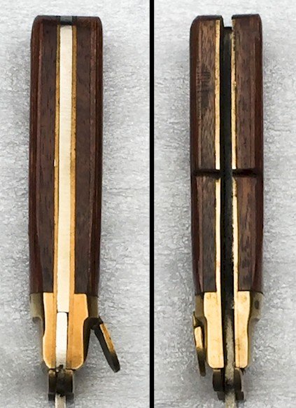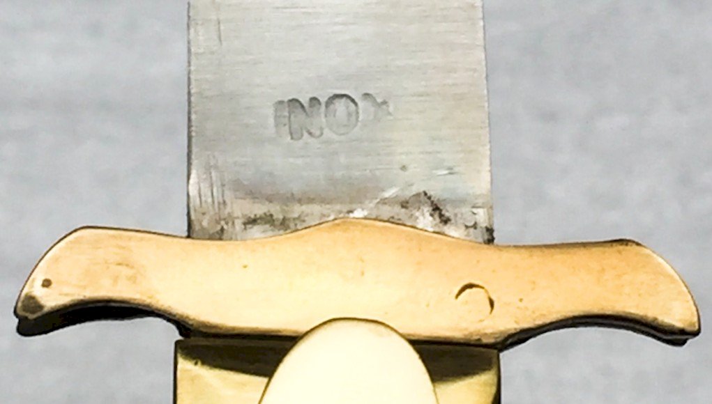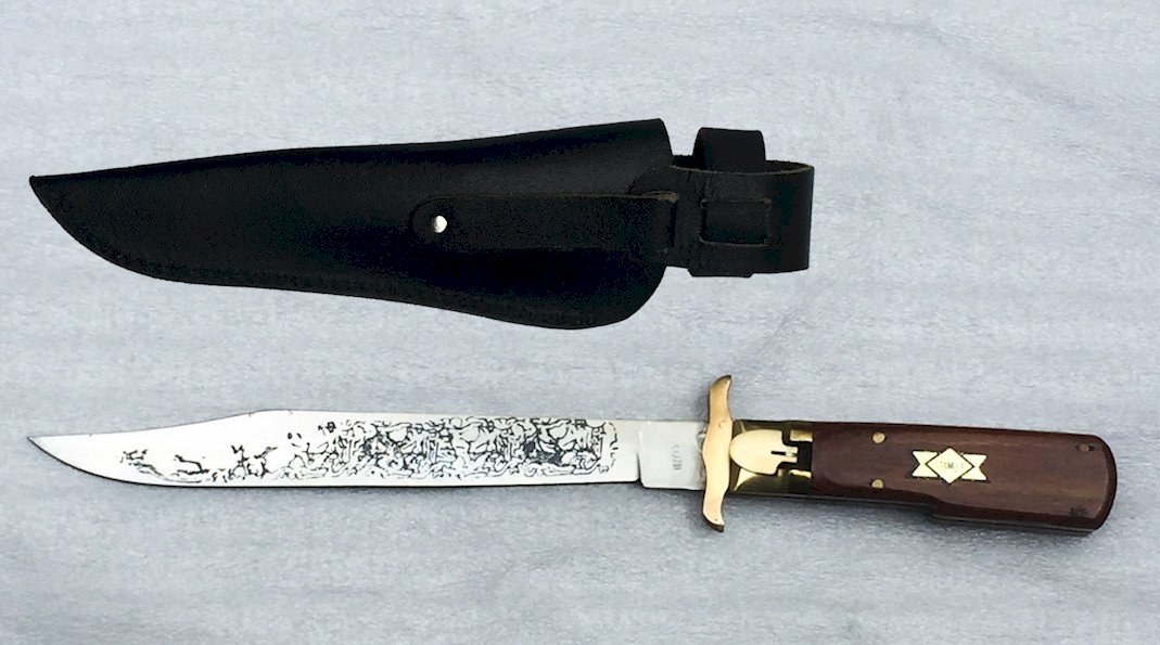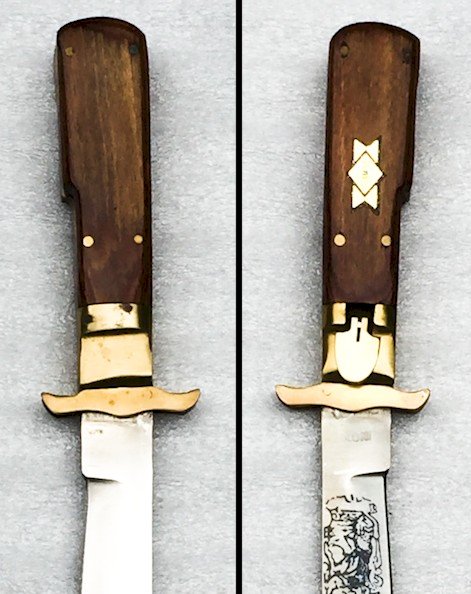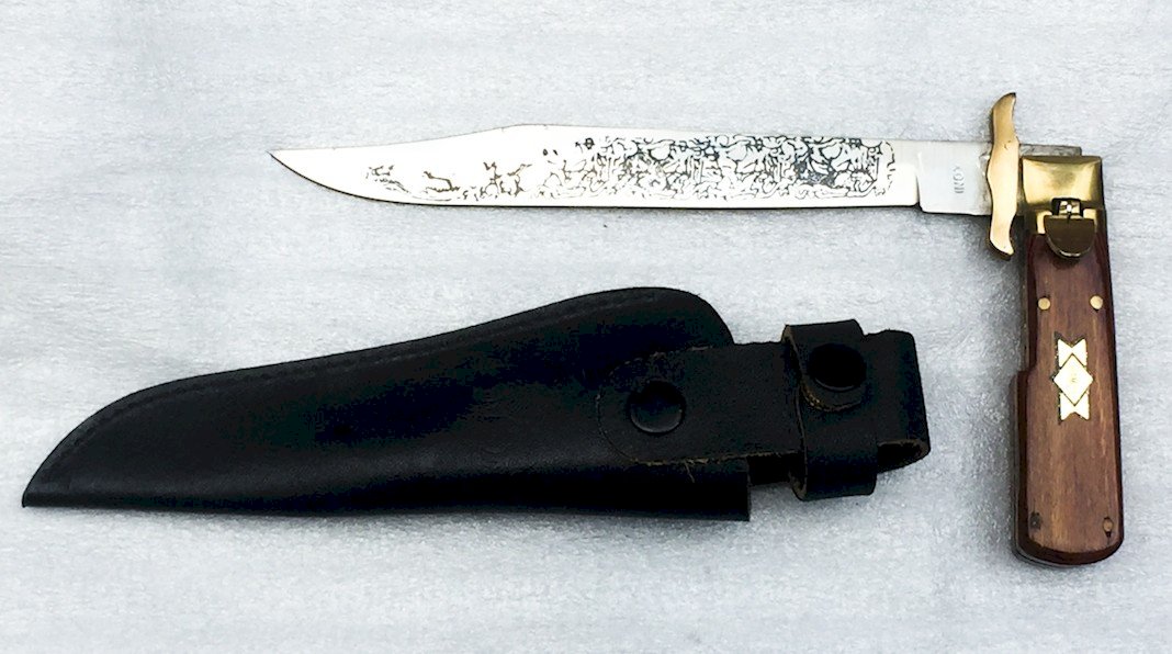 Superb post-war Leopard hunting knife, with a curved blade, folding with safety lock POST WW2. The handle is made of lacquered brown wood and brass, but very solid, with no play. The blade is quite strong, featuring engravings and a marking at the tang: "INOX." The sheath is made of sturdy leather, with its fastening button and a representation of a lion. This is a very beautiful hunting knife, completely original, which is believed to be between 40-50 years old (to be verified).