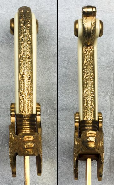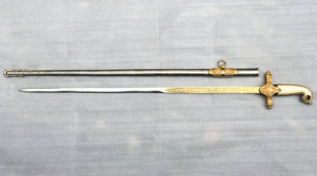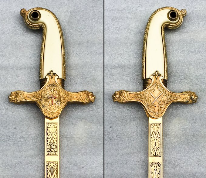 Superb and luxurious Spanish ceremonial officer's sword in Mameluke style, from the period 1960-70, with plastic or Bakelite (to be verified) grip. The handle is made of gilded bronze with floral patterns and military symbols, as well as a red cross. The blade is clean and still shiny with its original gilding marked "Toledo." The sabre is quite clean with traces due to aging. It probably dates from the mid-20th century (to be verified).