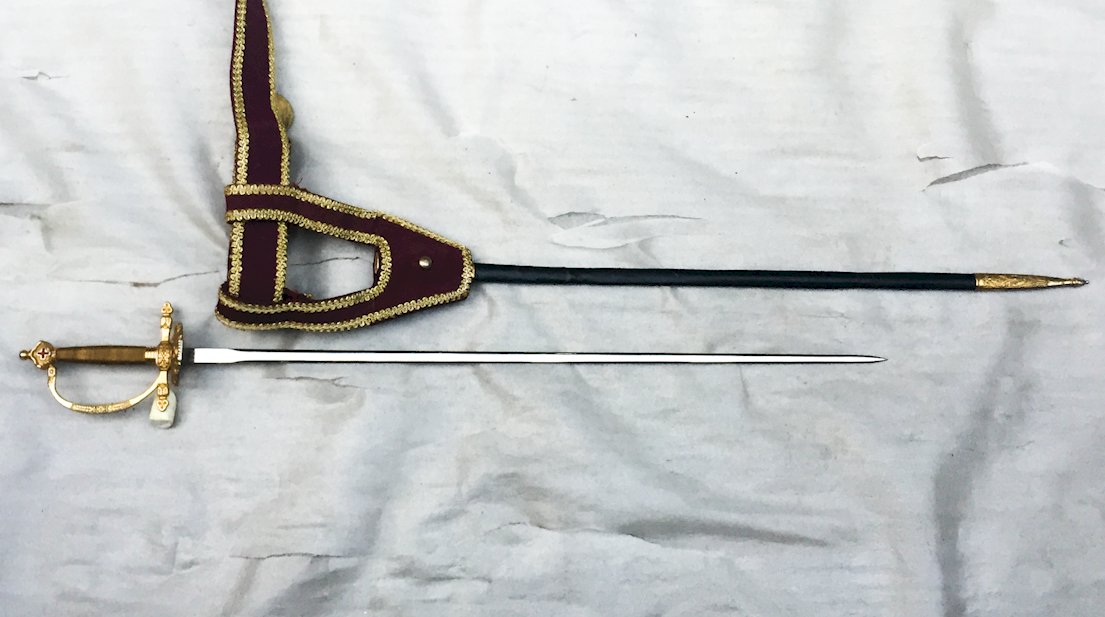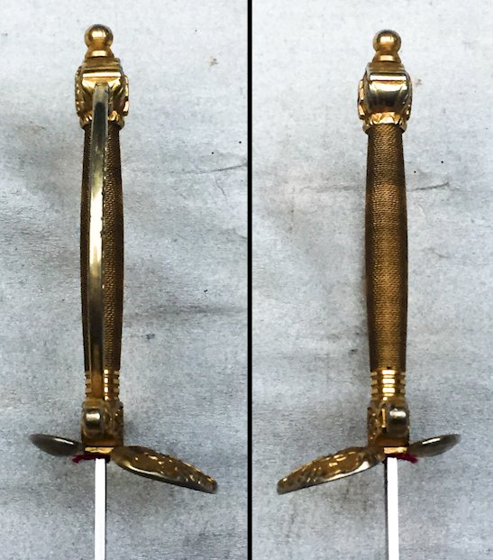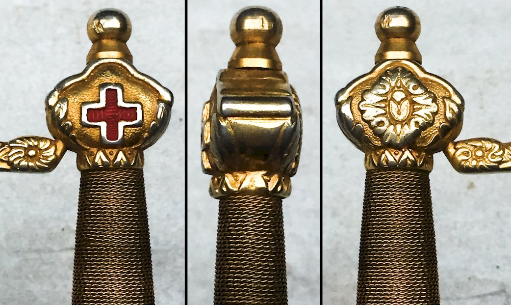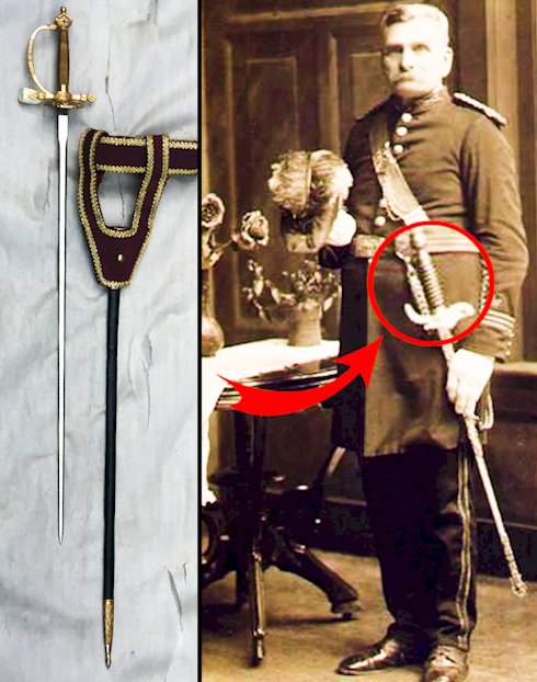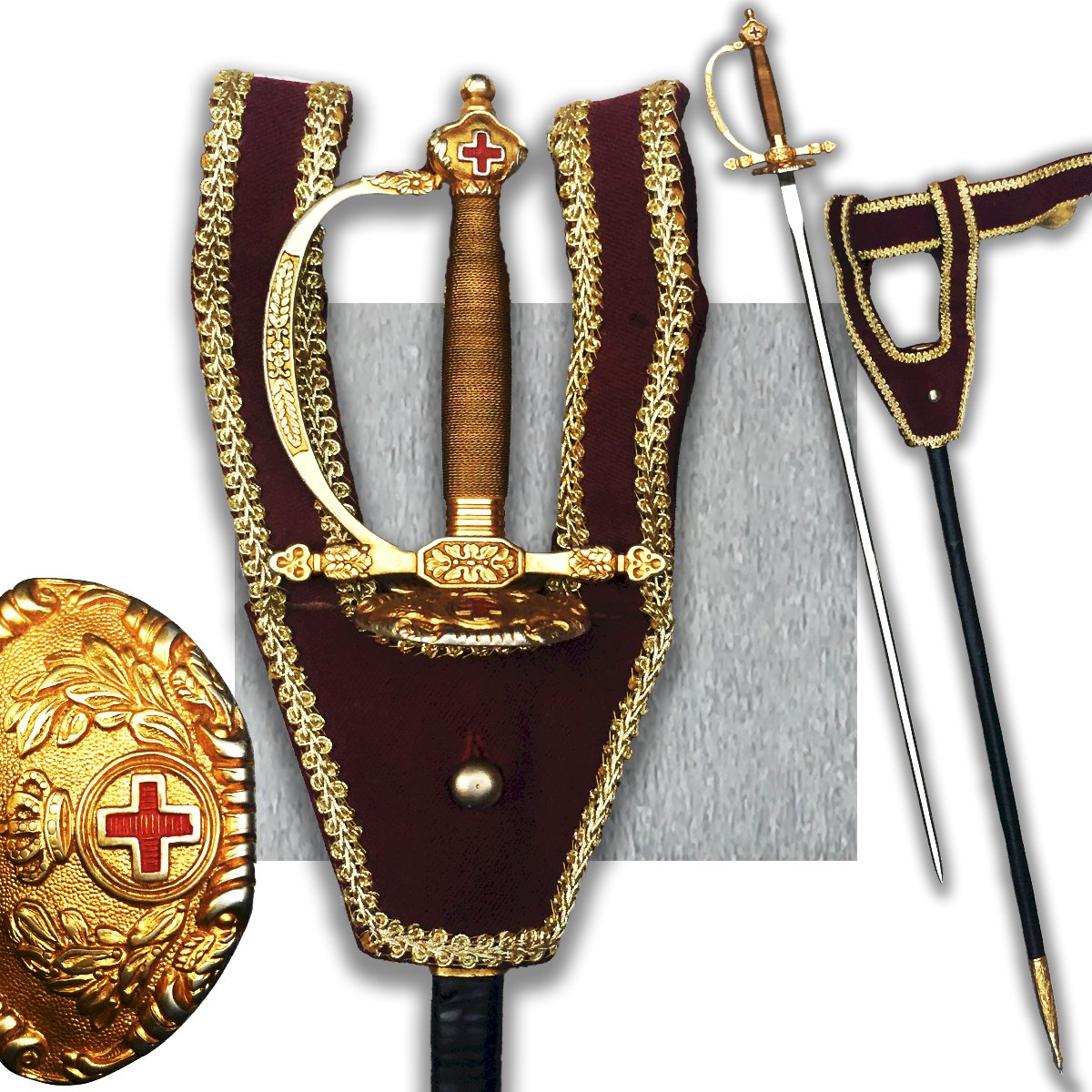 Superb and luxurious Spanish ceremonial sword for officers. The handle is in gilded bronze with floral motifs and military symbols as well as a red cross (medical corps?). The filigree is original. The scabbard is made of leather and engraved brass with its very beautiful original gilding. Clean and still shiny blade. + '' SUPERB AND RARE BAUDRIER '' with the insignia of a GENDARME type grenade. The sword is quite clean and in good condition for its age. It probably dates from the 20th century (to be verified).