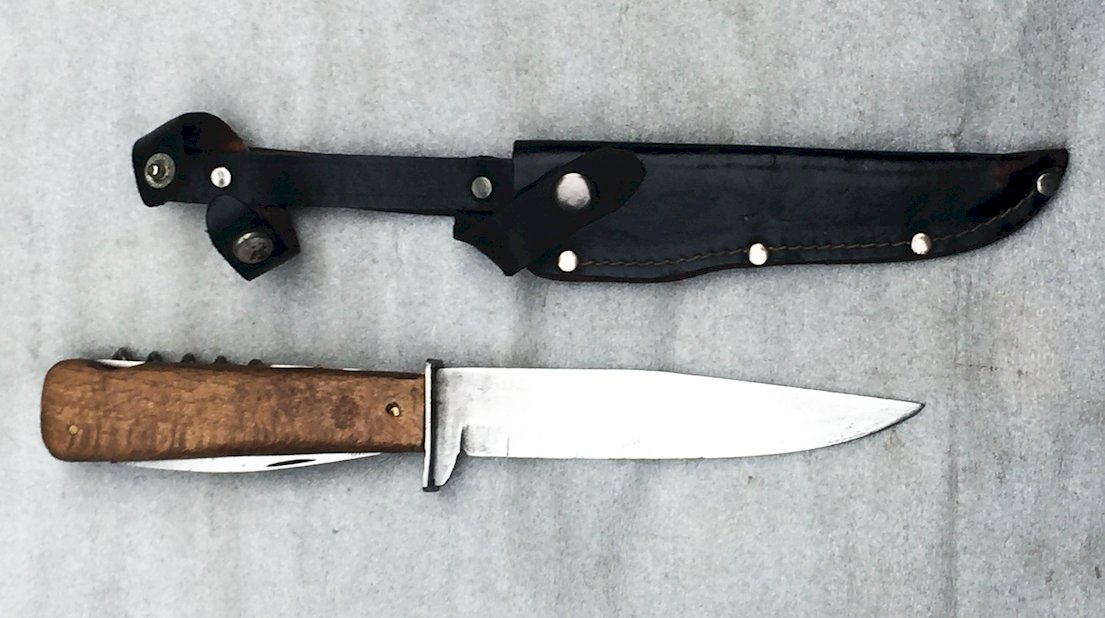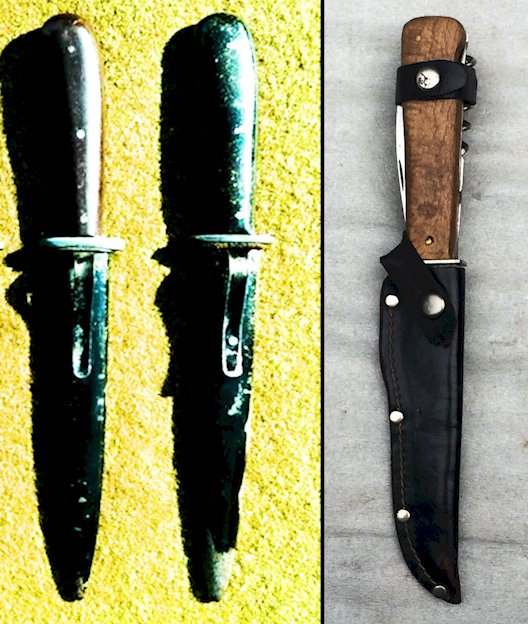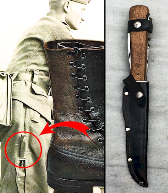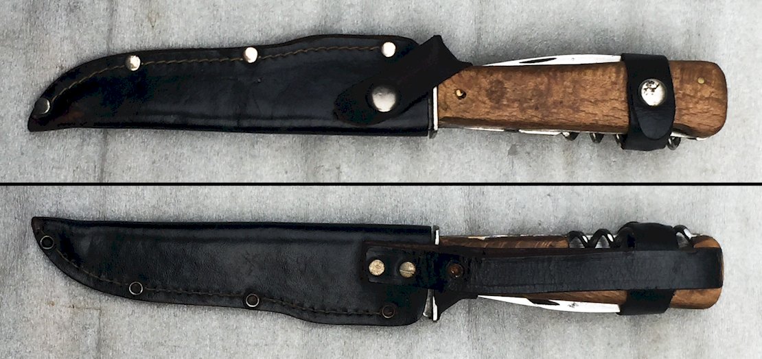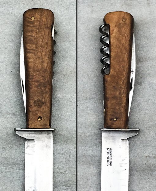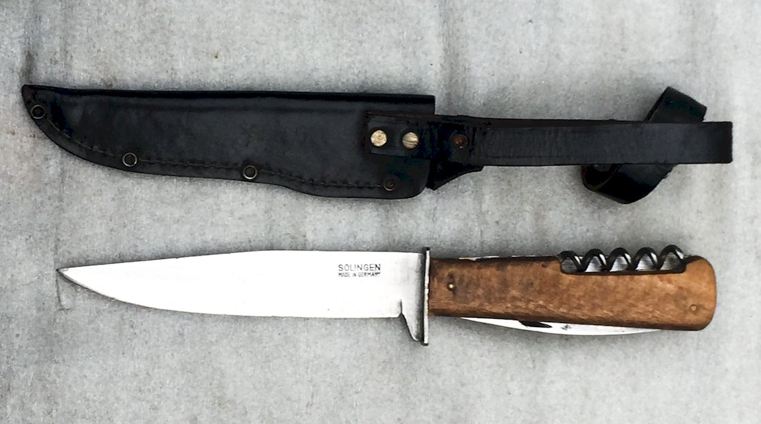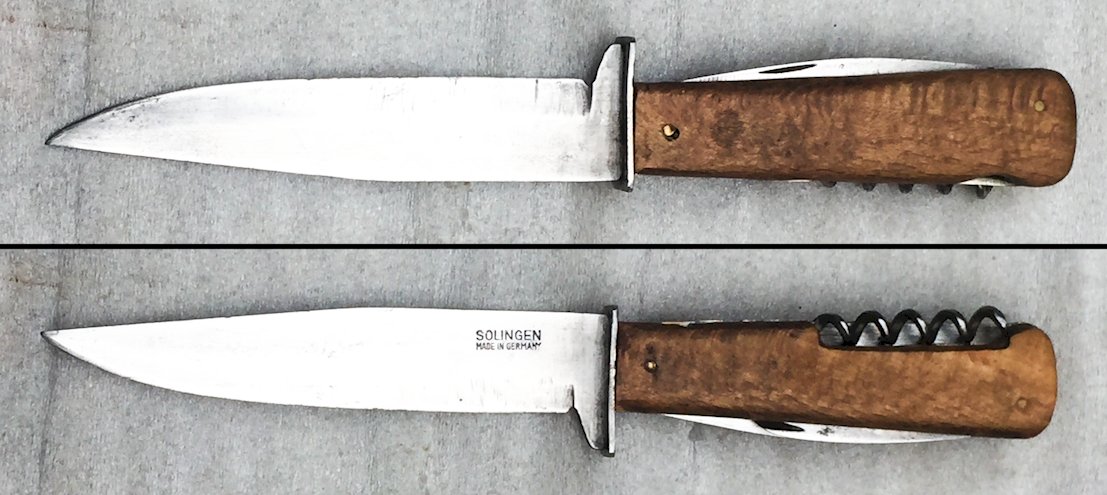 Superb, boot dagger, dating from the second part of the XX. The handle is made of wood with different options and multi-use. Marked on the blade: '' MADE IN GERMANY SOLINGEN ''. The blade is in very good condition, still shiny, nice back of the blade sumptuously cut. The scabbard is in black leather, in its own juice. Superb piece, very pleasant to hold in the hands and even more to observe in the display case!