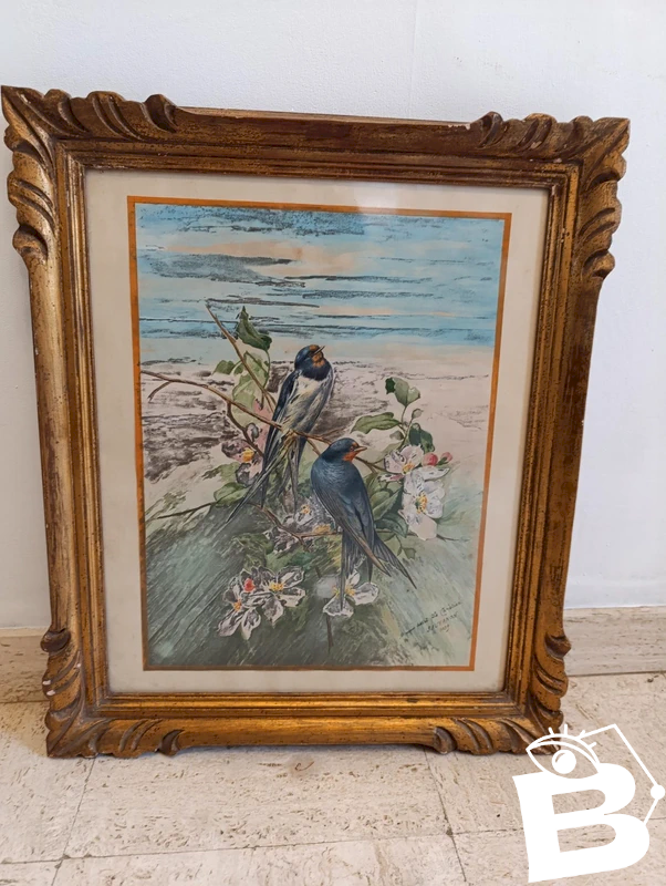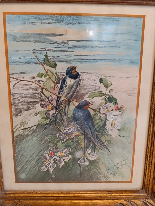 superb painting decorated with birds, signed Sauvanon and dated 1939, in good condition, slightly yellowed typical of the paper and some missing parts on the frame, very beautiful work, dimensions 55x47cm