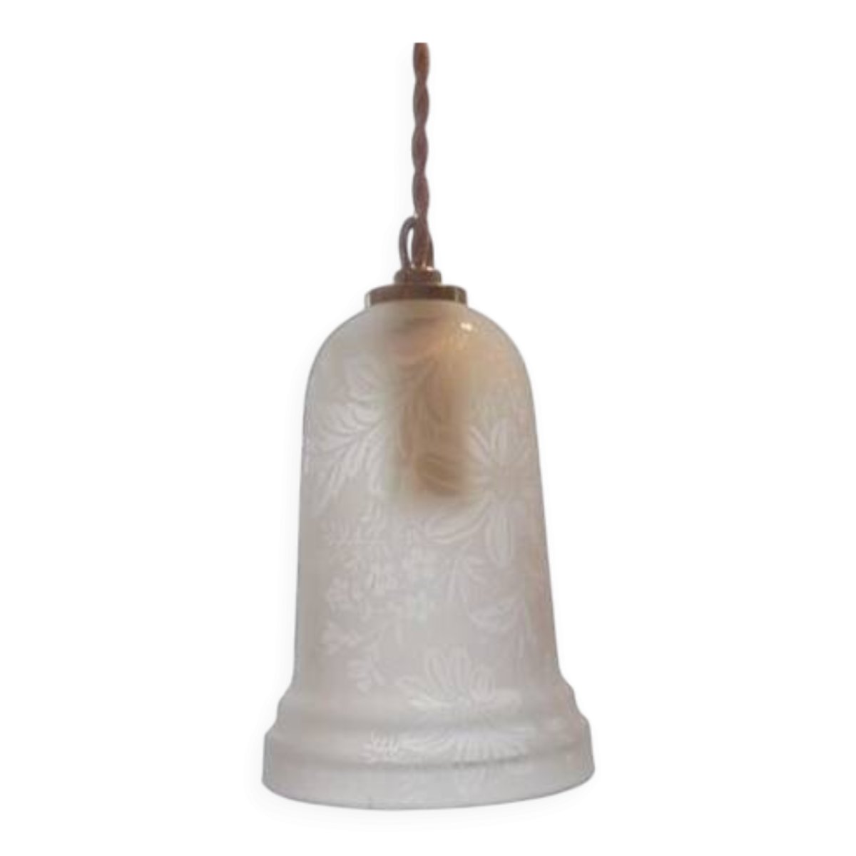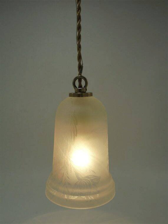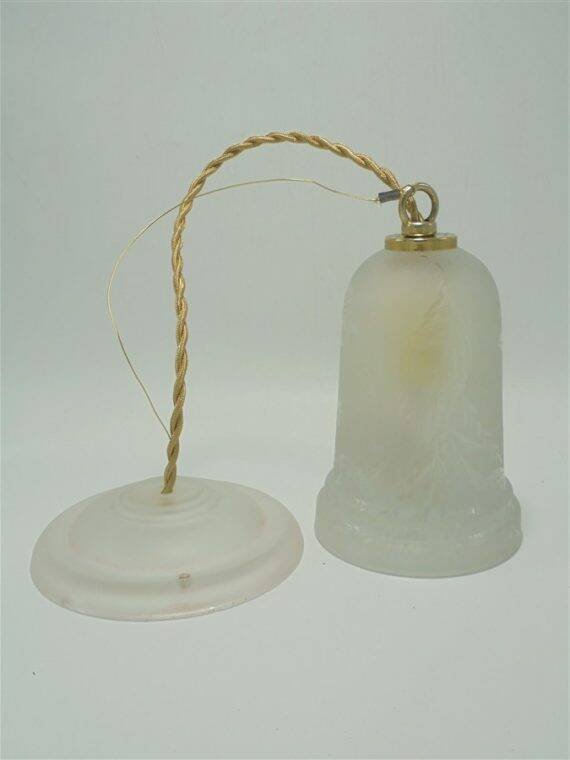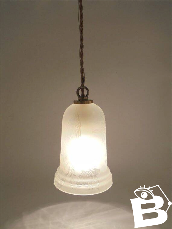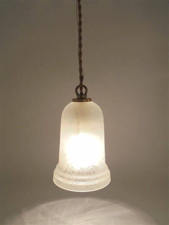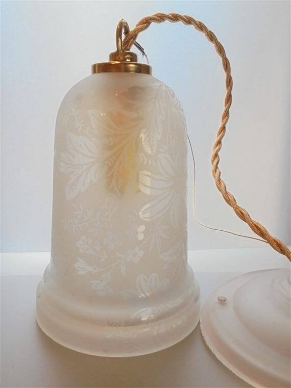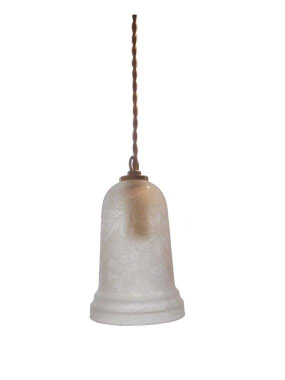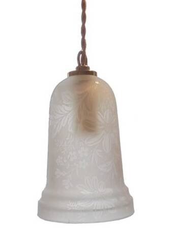 Suspension with frosted glass globe featuring a polished floral design. E14 socket. Cable length: 45 cm. Diameter: 10 cm. Height: 14 cm. Weight: 740 g. L: 10 W: 14 H: 60