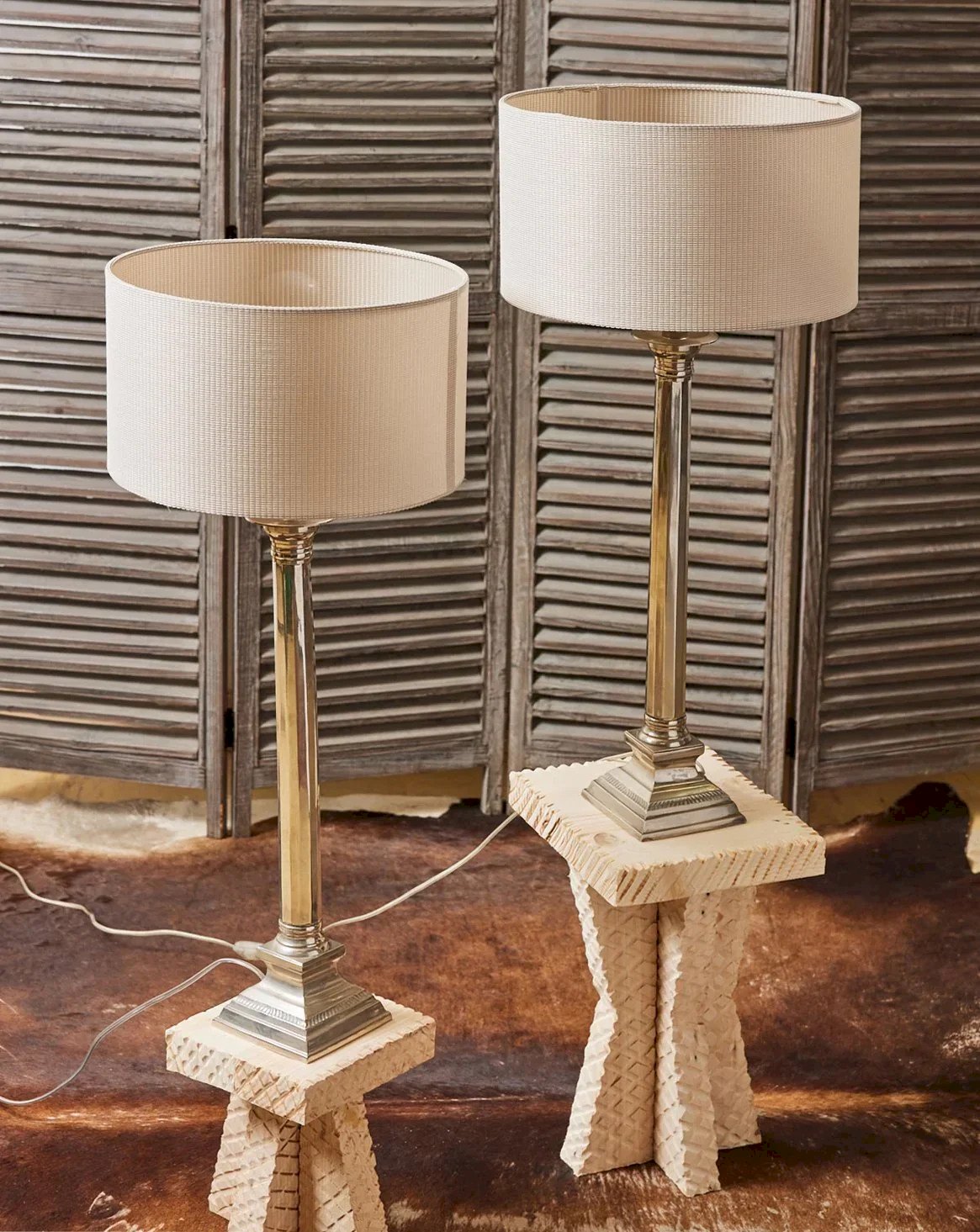 Elevate your interior with this pair of Art Deco table lamps featuring geometric lines and balanced proportions. Designed to enhance a bedroom or an office, they emit a soft light, ideal for creating a cozy and warm atmosphere while providing a refined decorative accent. The crafted materials and sculptural design evoke the sophistication of the 1920s, blending functionality and style for a harmonious interior. New lampshades with the option to change them according to your style. Height: 85 cm Diameter: 15 cm Condition: Used: Item has been used. Item shows some superficial signs of wear. Fully operational and functioning correctly. It may be a demonstration model or an item returned to the store after a short period of use, with possible imperfections. Brand: Debongout Type: Vintage found item: Yes Style: Country.