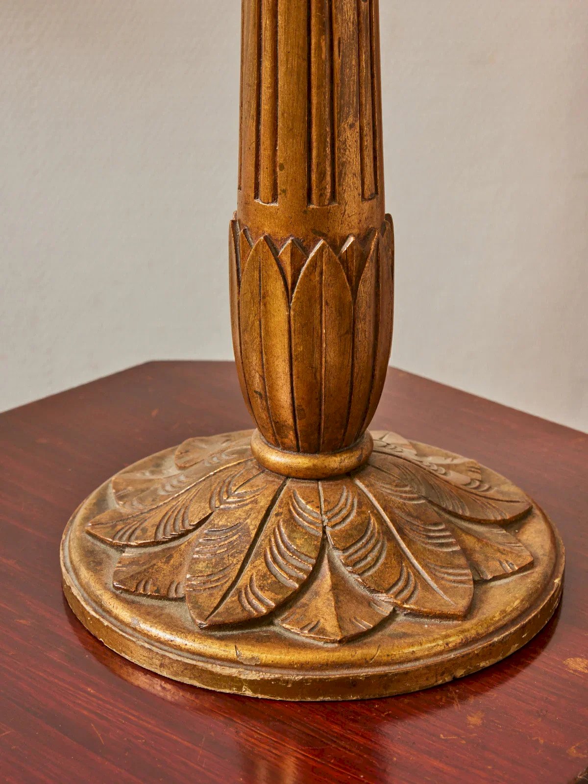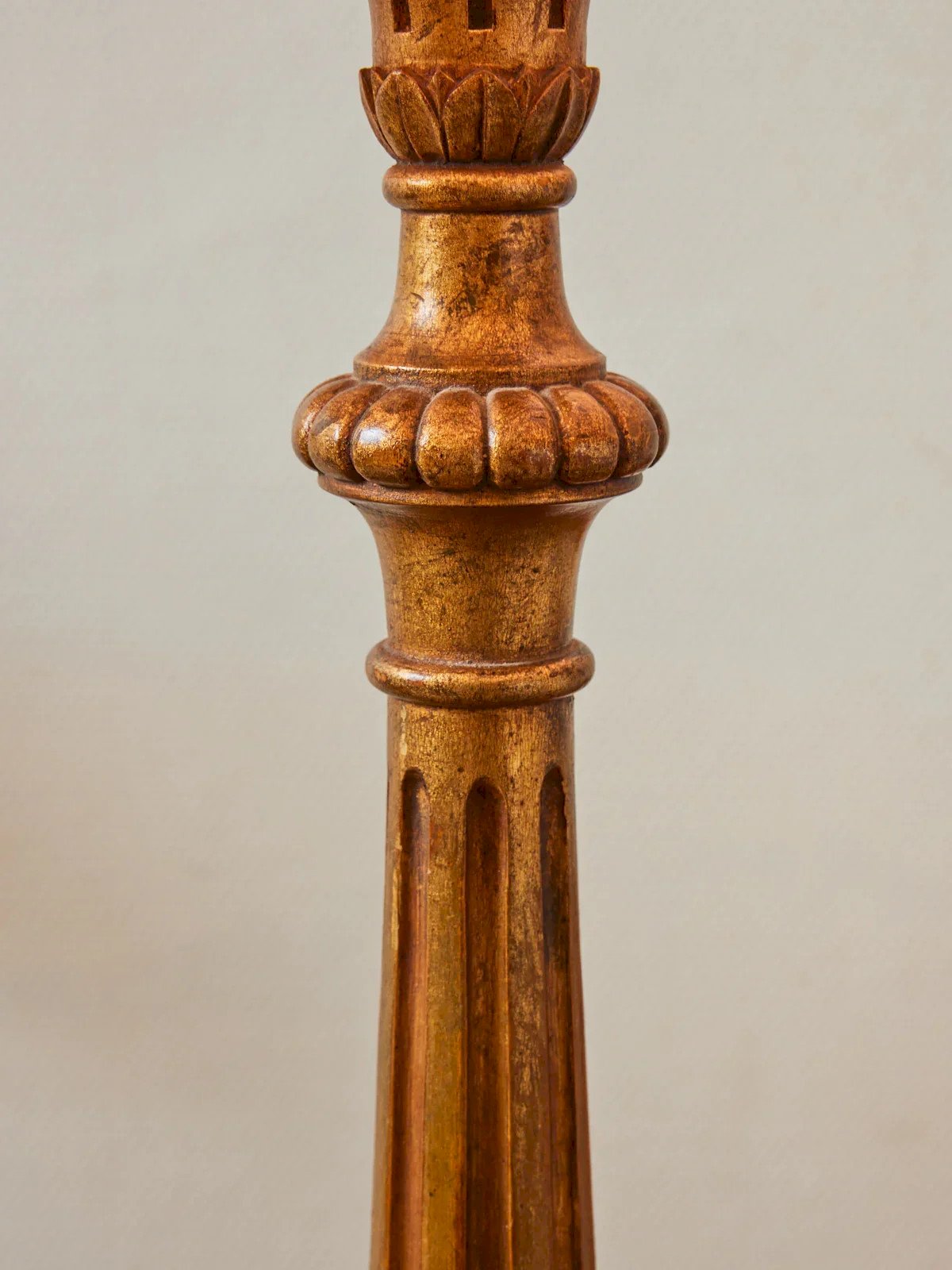 Enhance your interior with this 18th-century gilded wood lamp, finely carved with a floral motif. Its harmonious silhouette and delicate proportions diffuse a soft light, perfect for warming a reading nook, a console, or a side table. The intricate gilding and the finesse of the patterns reveal an ancient craftsmanship that invites a refined and intimate atmosphere, blending heritage and understated elegance. New lampshade with the possibility of changing it according to your style. Height: 85 cm Diameter: 25 cm Condition: Used: Item that has been used. Item showing some superficial signs of wear...Used: Item that has been used. Item showing some superficial signs of wear, fully operational and working properly. It may be a demonstration model or an item returned to the store after a short period of use. potential imperfections. Brand: Debongout Type: Thrifted Product Style: Country Material: Wood Vintage: Yes