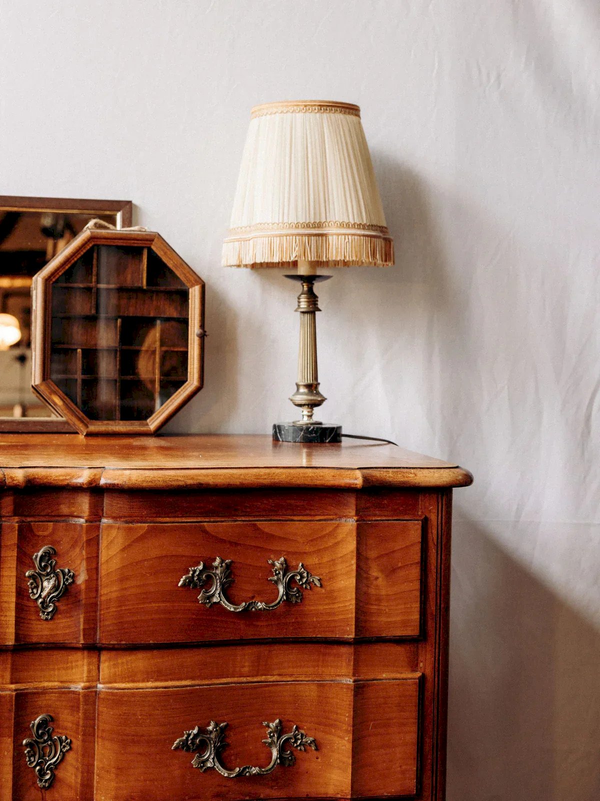 Add a refined touch to your interior with this compact table lamp, featuring a pleated shade that diffuses a soft and enveloping light. Its marbled effect base, enhanced with a brass neck, combines classic elegance and contemporary allure. Ideal for a bedside table or console, it creates a warm and intimate atmosphere. Operating with a bayonet bulb, it easily fits into various styles. Height: 47 cm Shade diameter: 25 cm Condition: Used: Item has been used. Item shows some signs of superficial wear... Used: Item has been used. Item shows some signs of superficial wear, fully operational and functioning correctly. It may be a demonstration model or an item returned to the store after a short period of use, with possible imperfections. Brand: Debongout Type: Vintage product Style: Country Material: Brass, Stone, Fabric Vintage: Yes