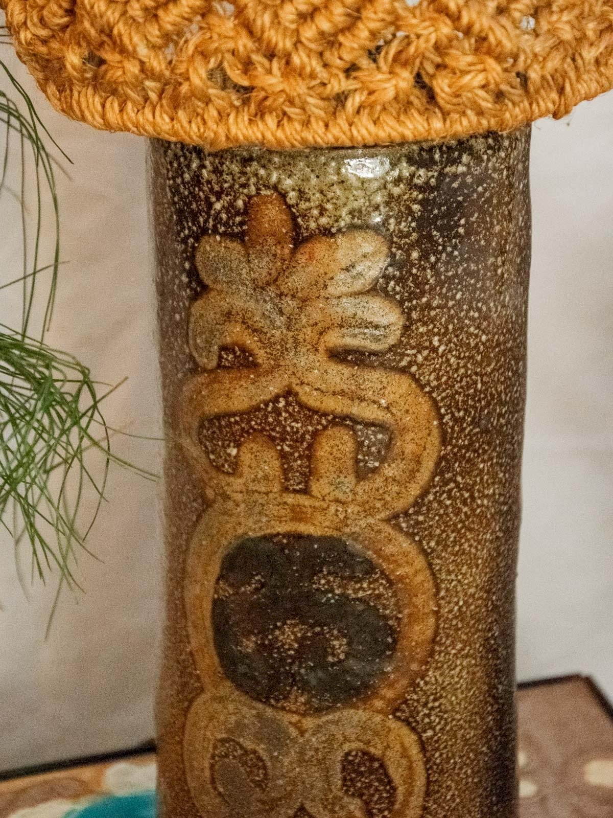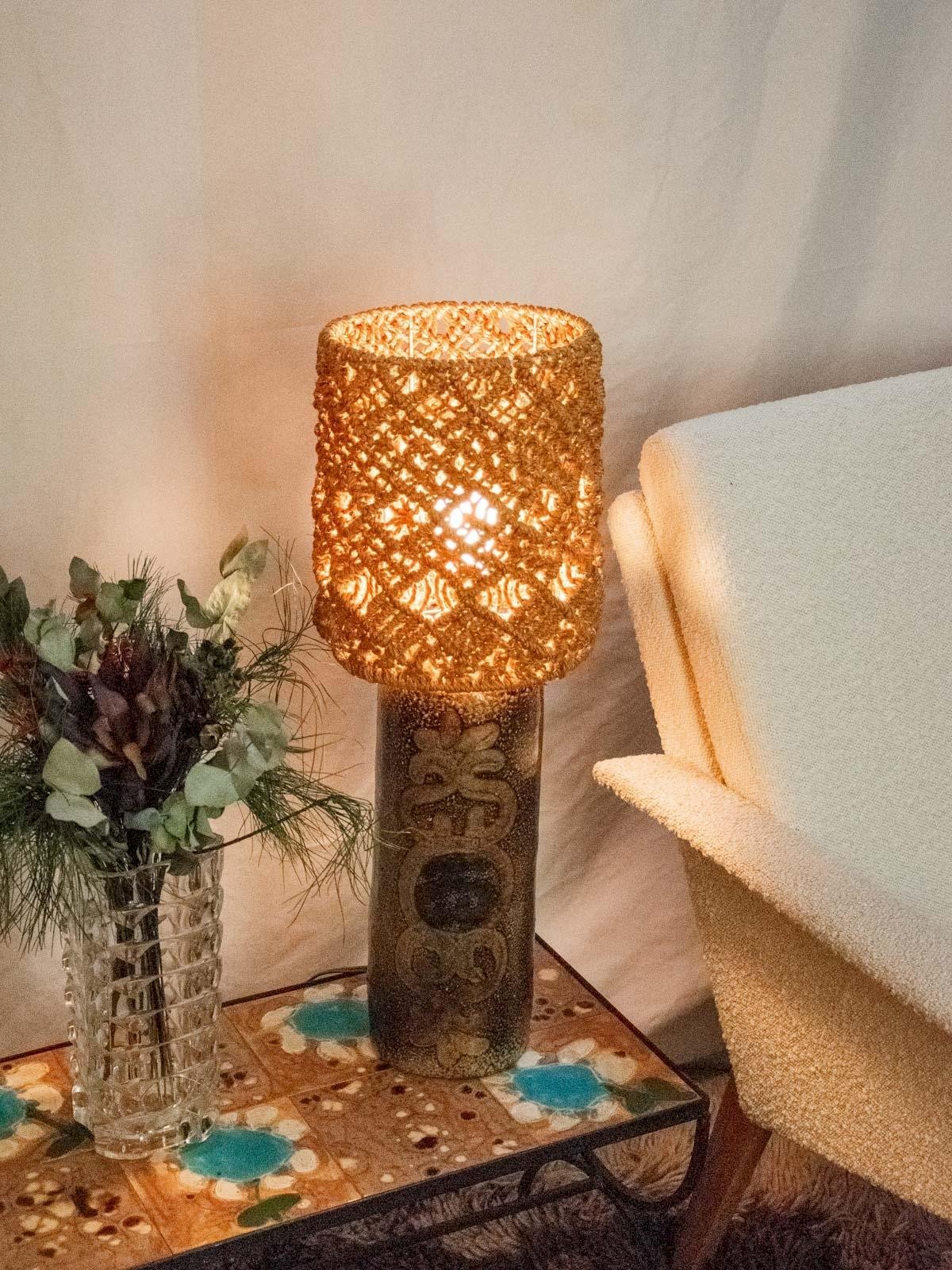 Discover this stoneware lamp with a rolled base, inspired by the style of Jean-Claude Monange in the 1960s, which combines sculptural simplicity and artisanal character. Its woven cord lampshade emits a soft, enveloping light, perfect as an accent lamp for intimate reading or for creating a warm atmosphere in a living room or bedroom. The contrast between the mineral material of the base and the natural texture of the cord adds subtle elegance, making it easy to integrate into a contemporary or bohemian interior. In excellent condition. Height: 61 cm Diameter: 22 cm Condition: Used: Item that has been utilized. Item showing some superficial signs of wear, fully operational and functioning correctly. It could be a demonstration model or an item returned to the store after a short period of use. Any potential imperfections. Brand: Debongout Type: Thrifted product Vintage: Yes Style: Country.