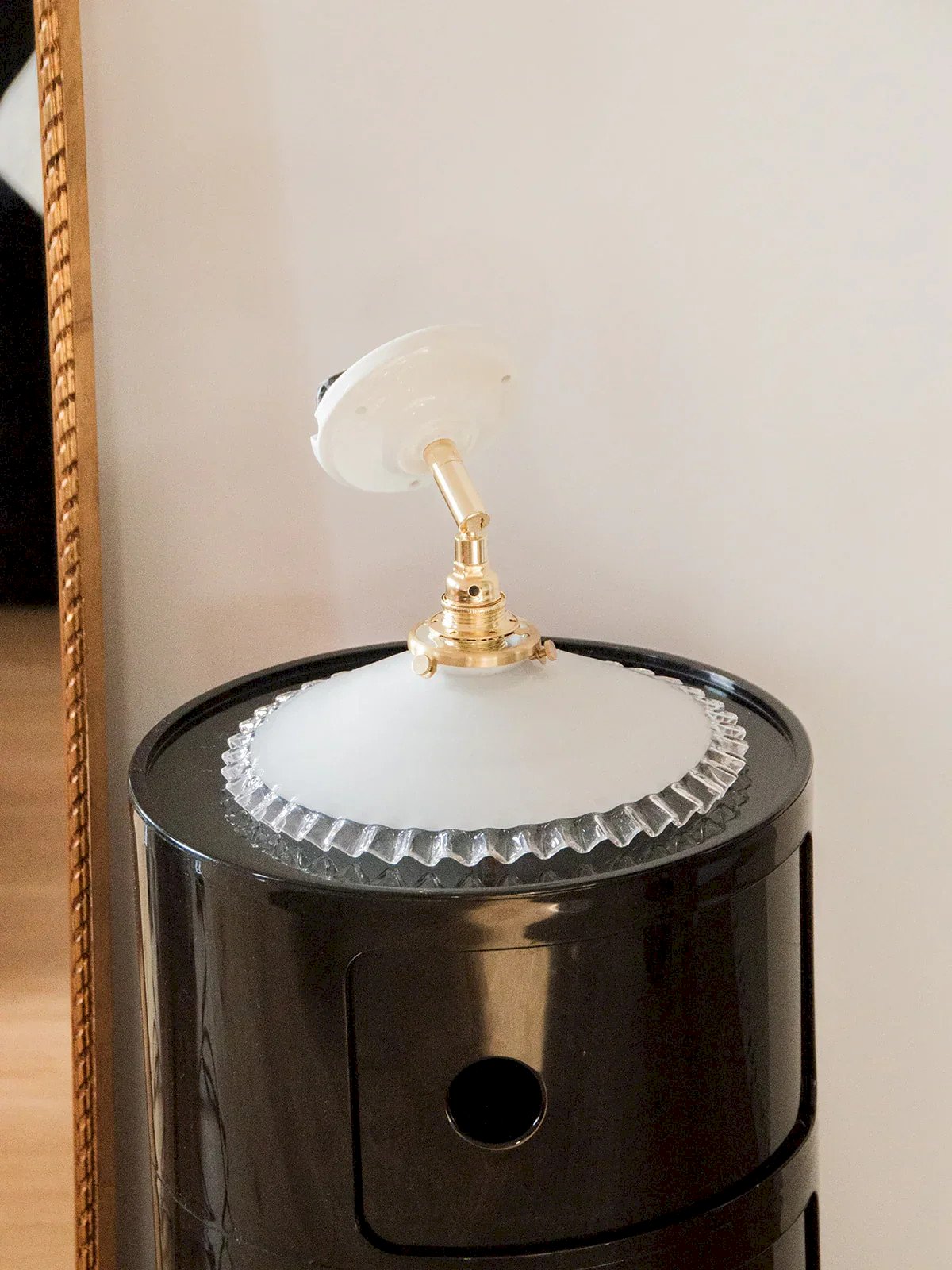 Suzette is the wall-mounted version of our Paulette! These wall lamps consist of a vintage glass globe. The perfect vintage and sophisticated touch to style a bedroom or living room. Each upcycled wall lamp is unique, handmade in France with a golden arm and a porcelain base that provides a refined finish. The E14 socket and connection box ensure a simple and secure installation. Compliant with CE standards, these wall lamps are perfect for illuminating your space with style. We love this Suzette lamp for its white opaline tulip globe with scalloped edges. Sold without a bulb. Web exclusive, the meeting will take place at your home! Width: 25 cm Height: 25 cm Depth: 26 cm Condition: Used: Item that has been used. Item showing some signs of superficial wear... Used: Item that has been used. Item showing some signs of superficial wear, fully operational and functioning correctly. It may be a demonstration model or an item returned to the store after a short period of use. possible imperfections. Brand: Debongout Type: Vintage find Style: Country Material: Glass Vintage: Yes