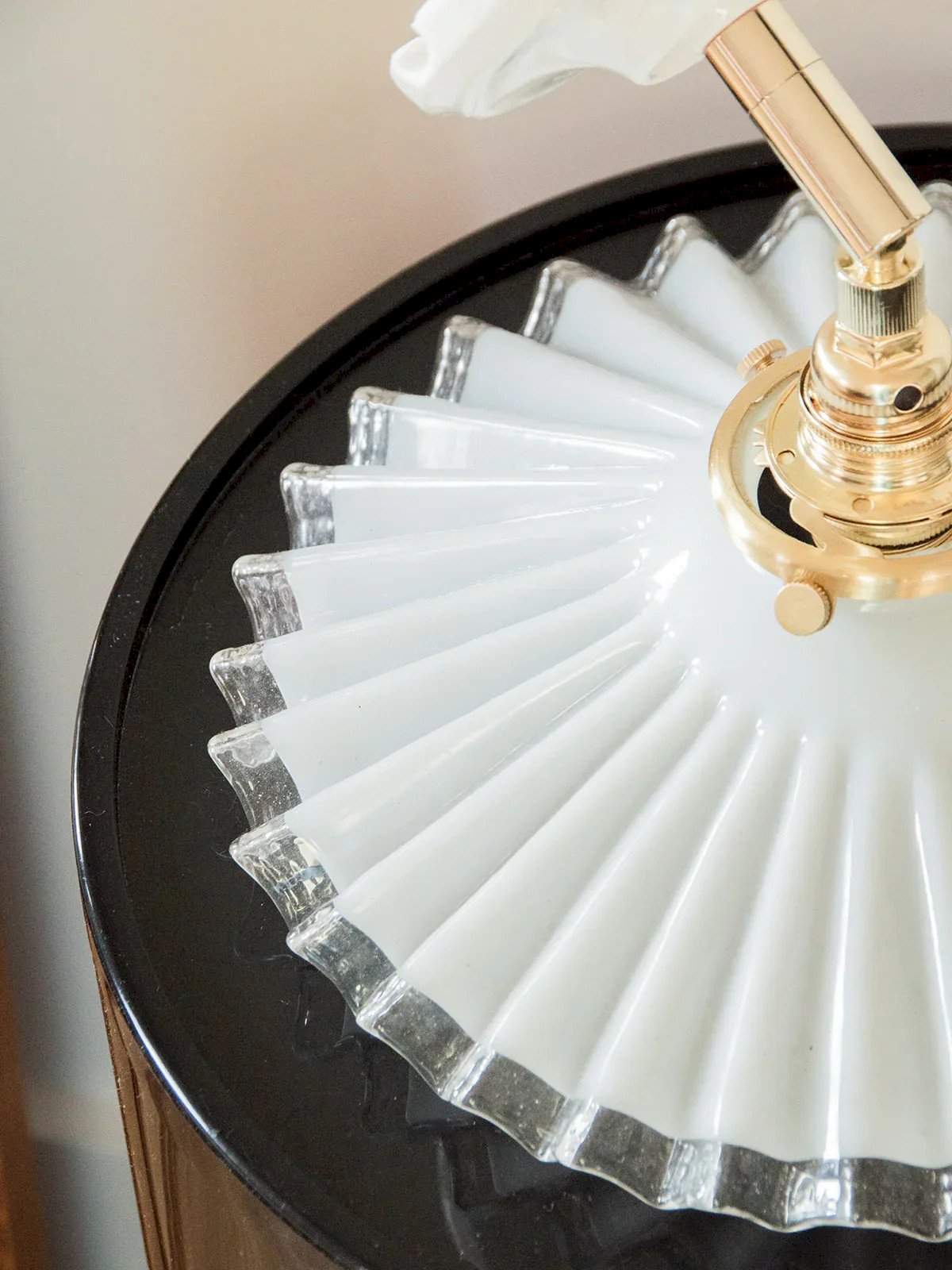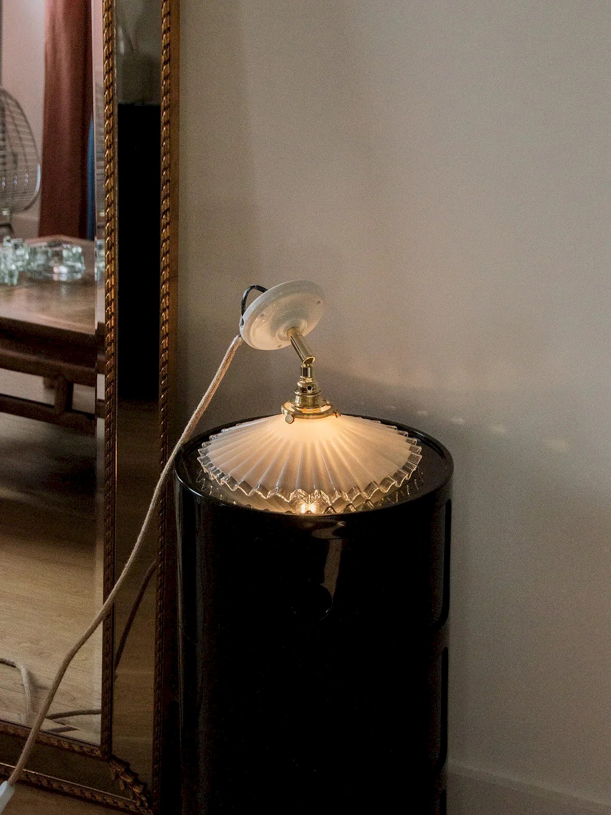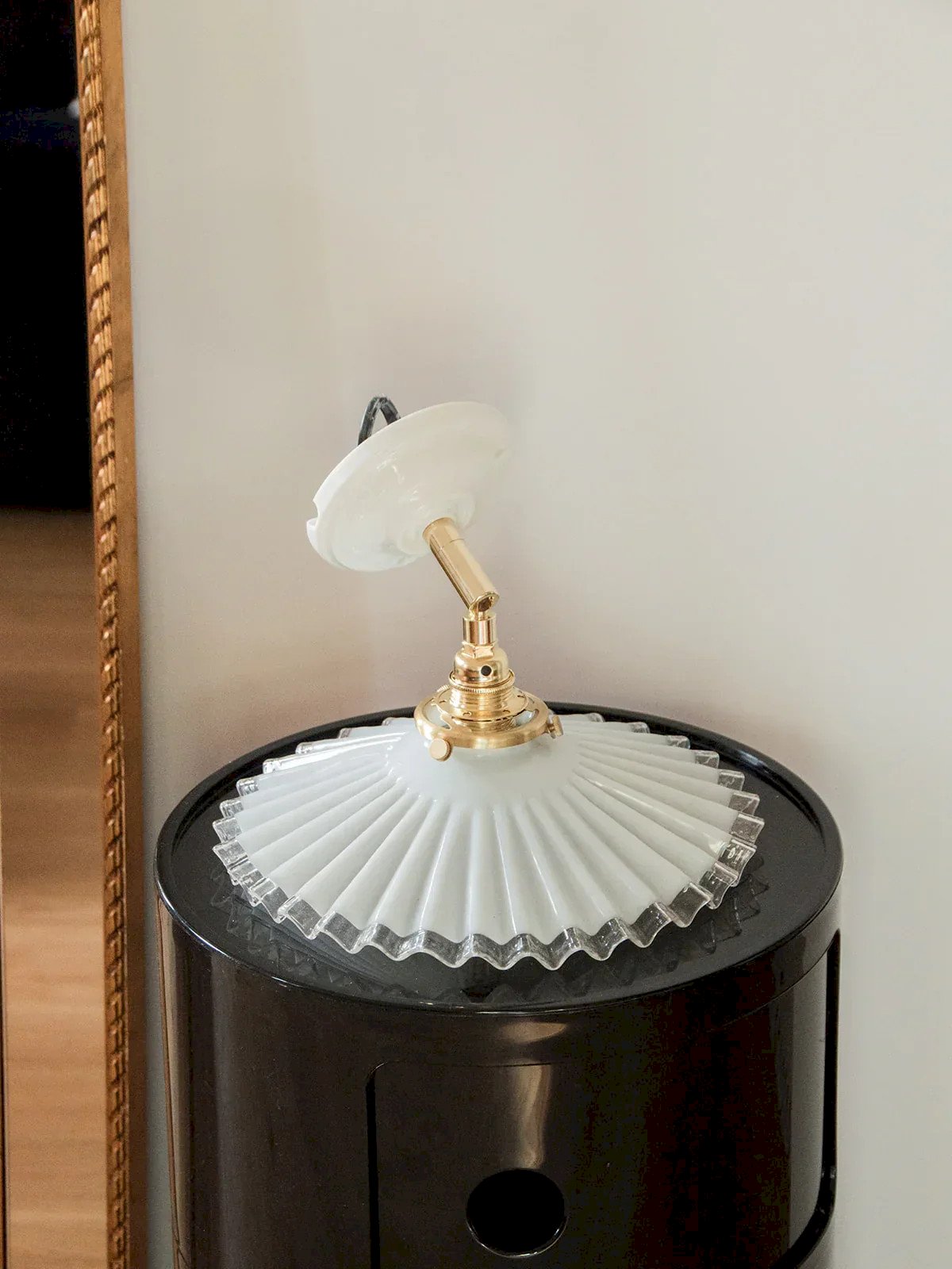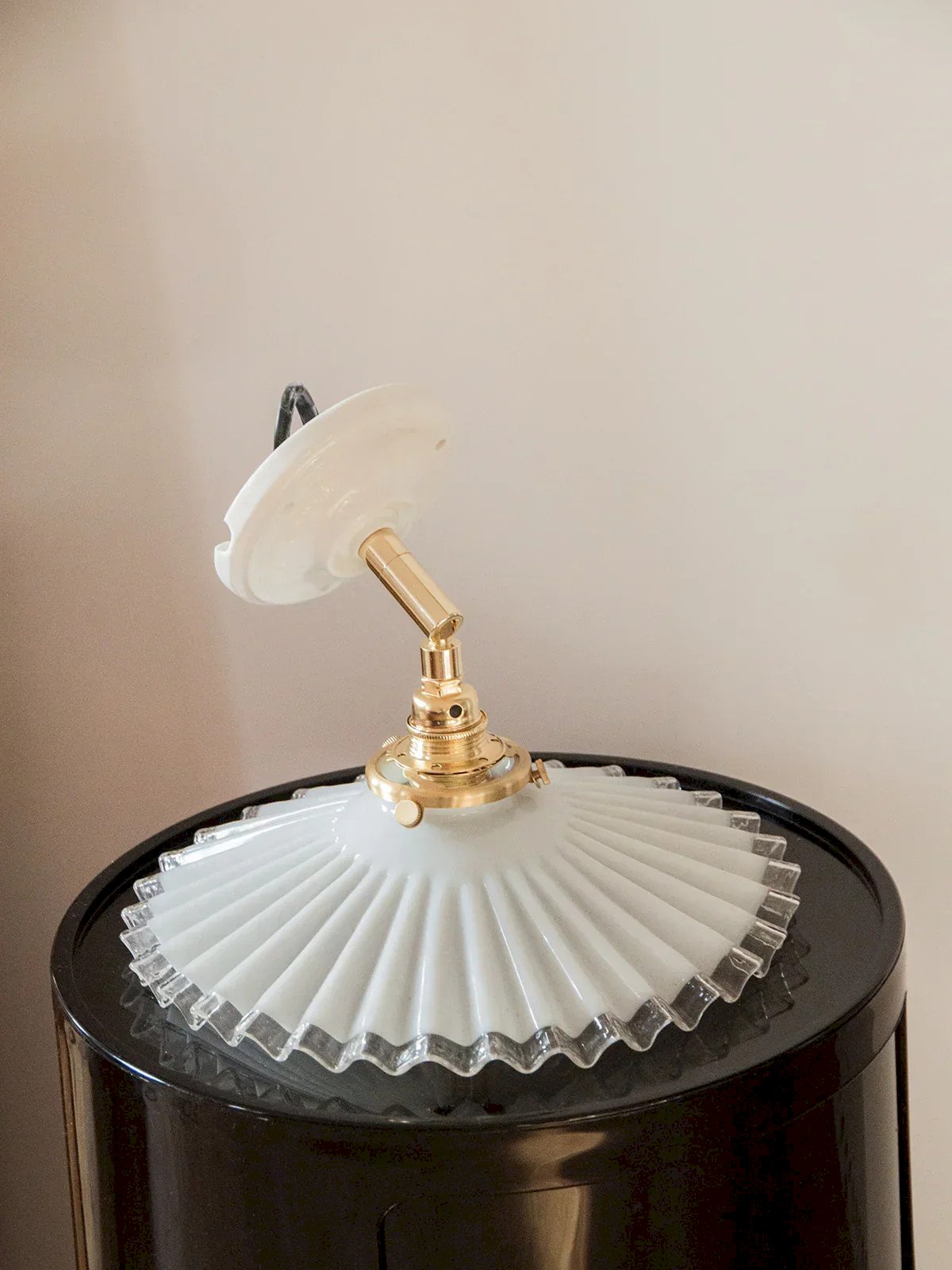 Suzette is the wall-mounted version of our Paulette! These wall lamps feature a vintage glass globe. The perfect vintage and sophisticated touch to style a bedroom or living room. Each upcycled wall light is unique, hand-assembled in France on a golden arm and a porcelain base that adds a refined finish. The E14 socket and connecting cord ensure a simple and secure installation. Compliant with CE standards, these wall lamps are perfect for illuminating your space with style. We love this Suzette for its white opaline tulip globe with scalloped edges. Sold without a bulb. Online exclusive, the encounter will take place at your home! Width: 25 cm Height: 25 cm Depth: 27 cm Condition: Used: Item has been used. The item shows some superficial signs of wear, ...Used: Item has been used. The item shows some superficial signs of wear, fully operational and functioning correctly. It may be a demonstration model or an item returned to the store after a short period of use. any imperfections. Brand: Debongout Type: Vintage product Style: Campaign Material: Glass Vintage: Yes