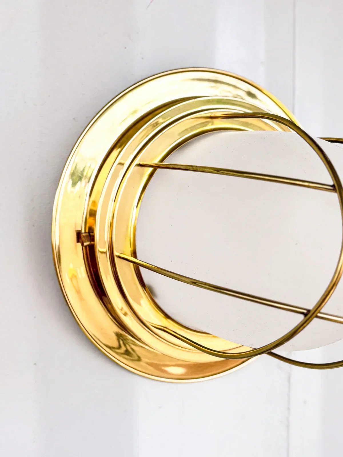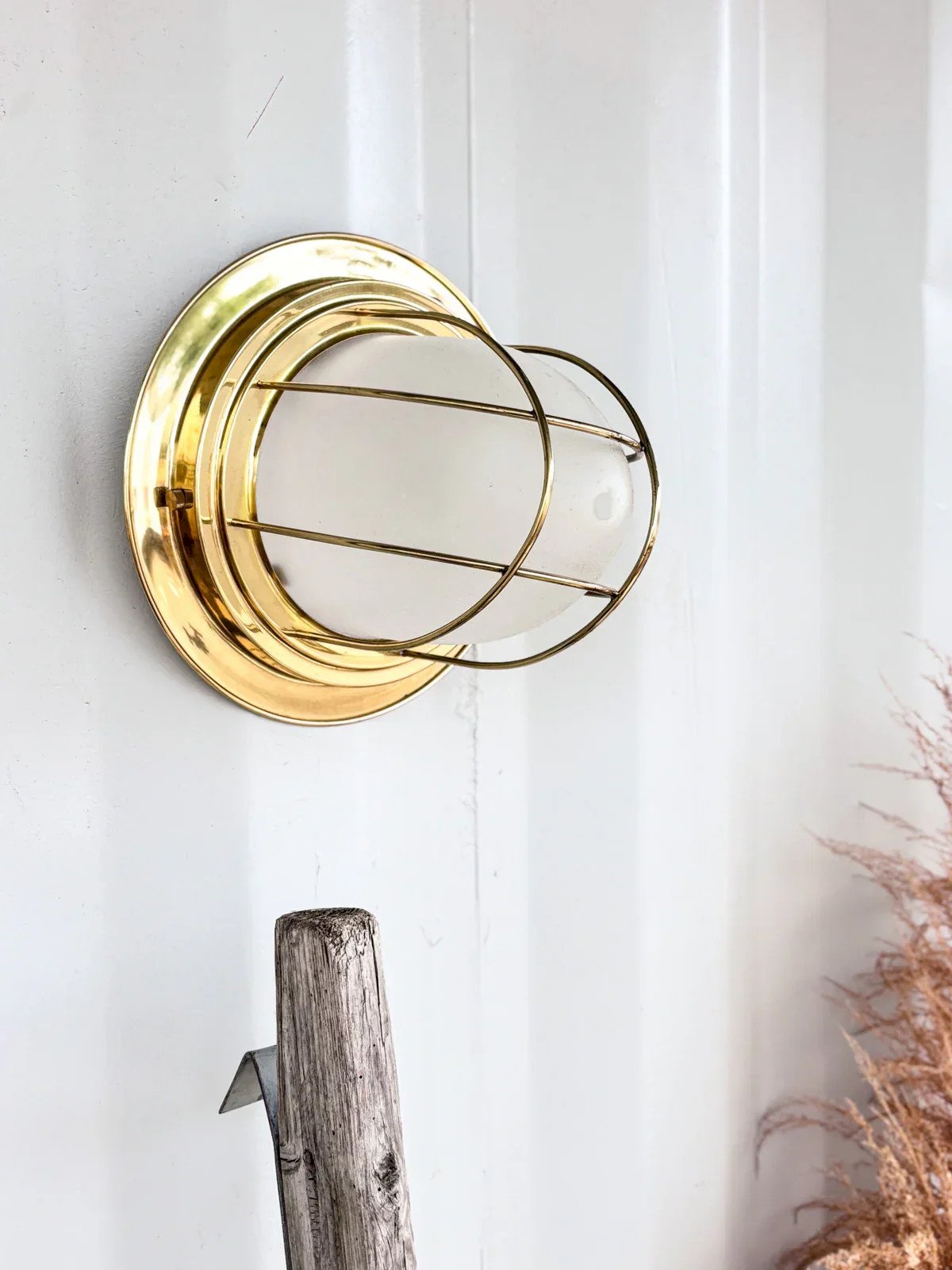Discover our vintage wall lamp, a unique piece originating from a boat. Its elegant brass structure adds a touch of warmth and authenticity to your interior, while its opaline diffuser offers a soft and soothing light. Perfect for illuminating a reading nook or enhancing an entryway, this sconce combines maritime design and retro charm to create a unique atmosphere. Add a touch of history to your decor with this exceptional piece. Length: 26 cm Diameter: 21.5 cm Condition: Used: Item has been used. Item shows some superficial signs of wear, fully operational and functioning correctly. It may be a demonstration model or an item returned to the store after a short period of use. Any imperfections. Brand: Debongout Type: Thrifted Product Style: Country Material: Brass, Opaline Vintage: Yes