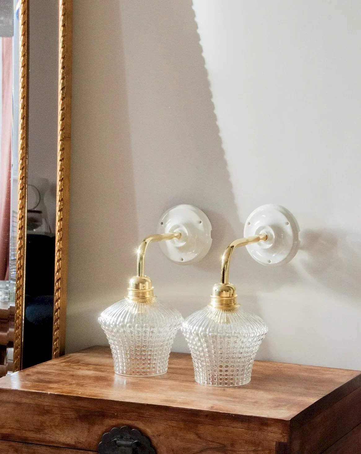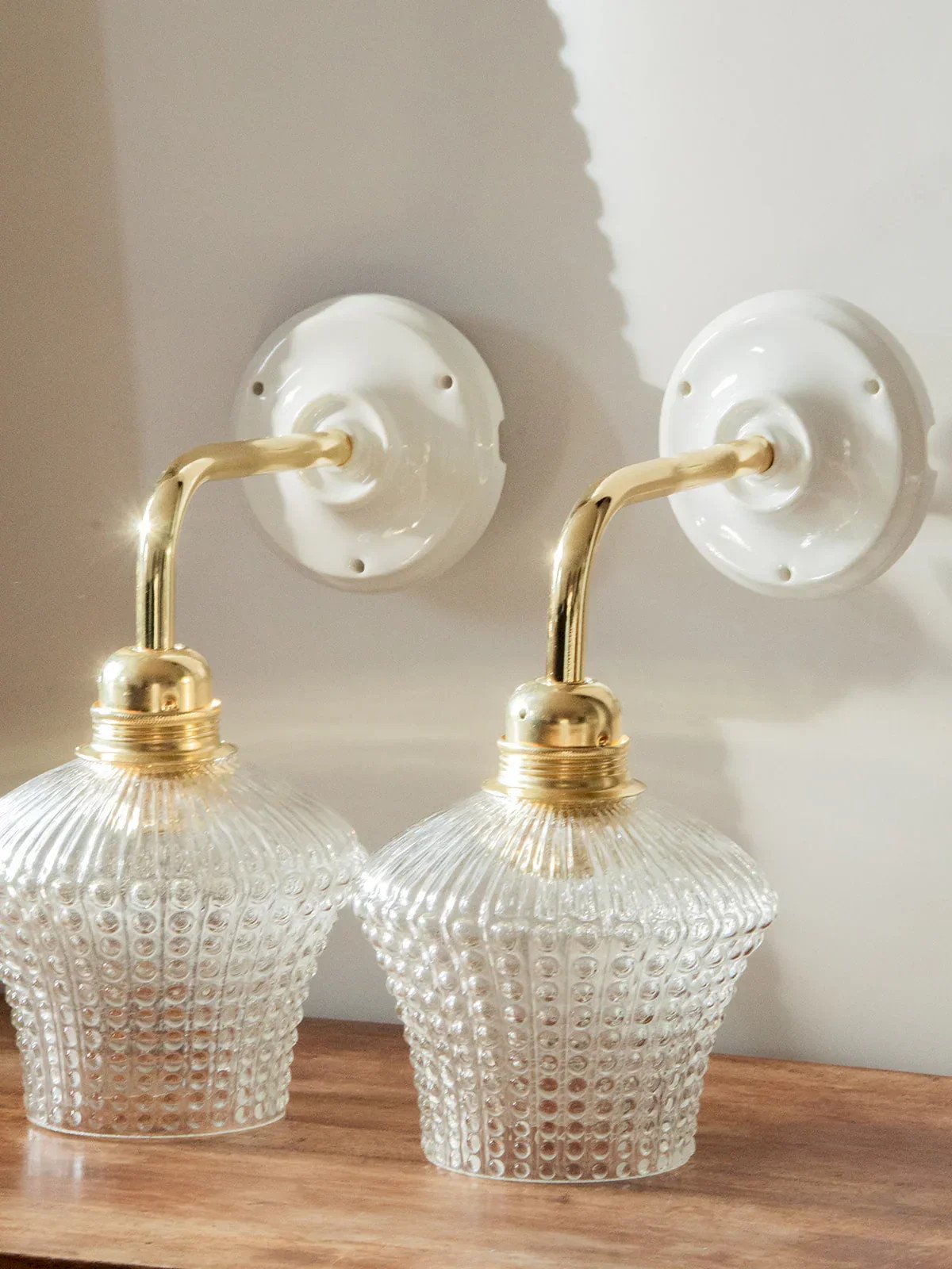 Suzette is the wall-mounted version of our Paulette! These wall lamps feature a vintage glass globe. The perfect vintage and sophisticated touch to stylize a bedroom or living room. Each upcycled sconce is unique, handmade in France on a golden arm and a porcelain base that adds a refined finish. The E27 socket and connection cord ensure simple and secure installation. Compliant with CE standards, these sconces are perfect for illuminating your space with style. We love these Suzette for their pressed glass globes. Sold without a bulb. Web exclusive, the meeting will take place at your home! Width: 13 cm Height: 26 cm Depth: 24 cm Condition: Used: Item that has been used. Item showing some superficial signs of wear... Used: Item that has been used. Item showing some superficial signs of wear, fully operational and functioning correctly. It may be a demonstration model or an item returned to the store after a short period of use. any imperfections. Brand: Debongout Type: Vintage product Style: Country Material: Glass Vintage: Yes