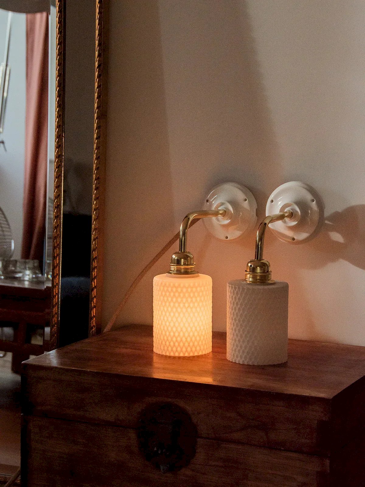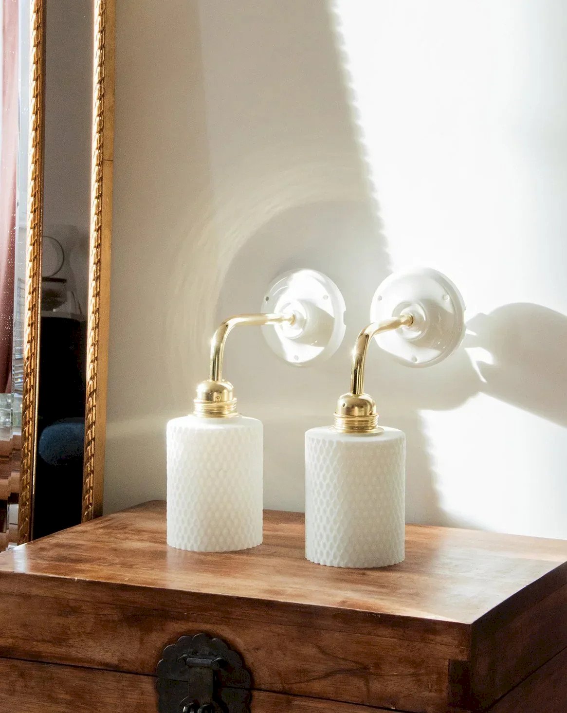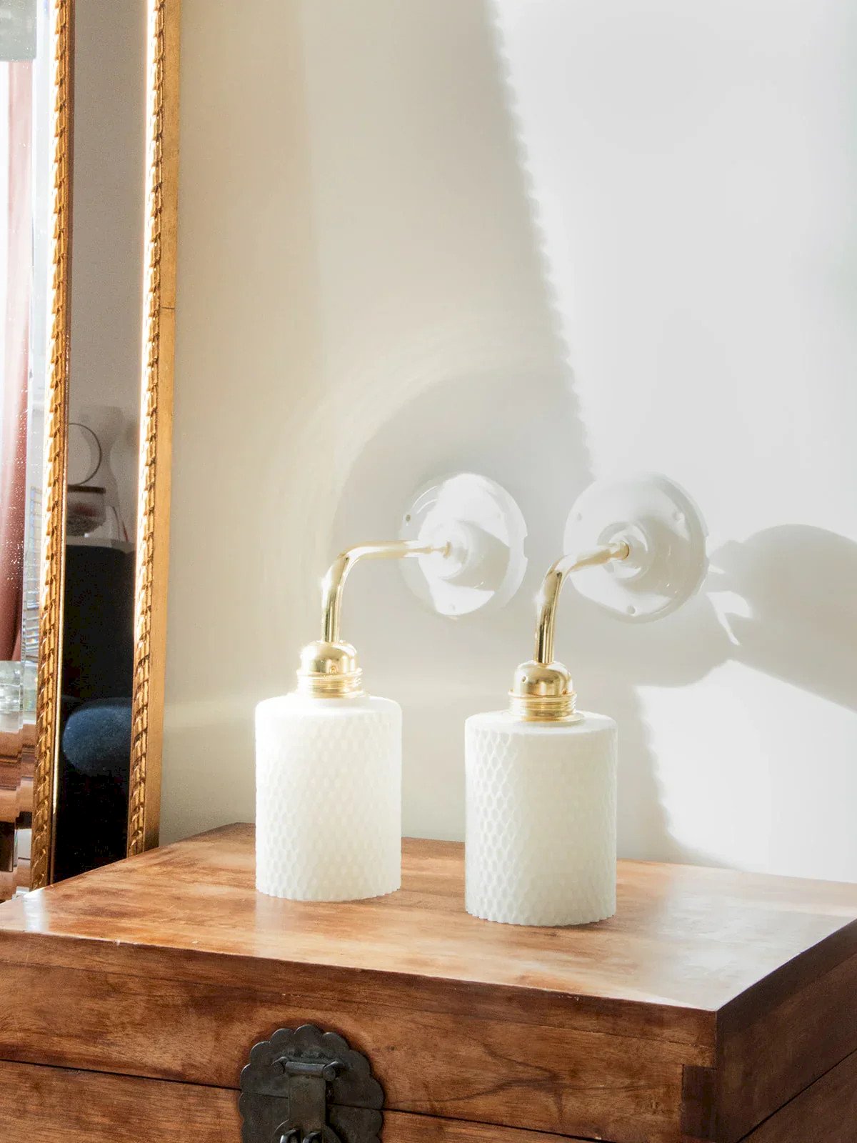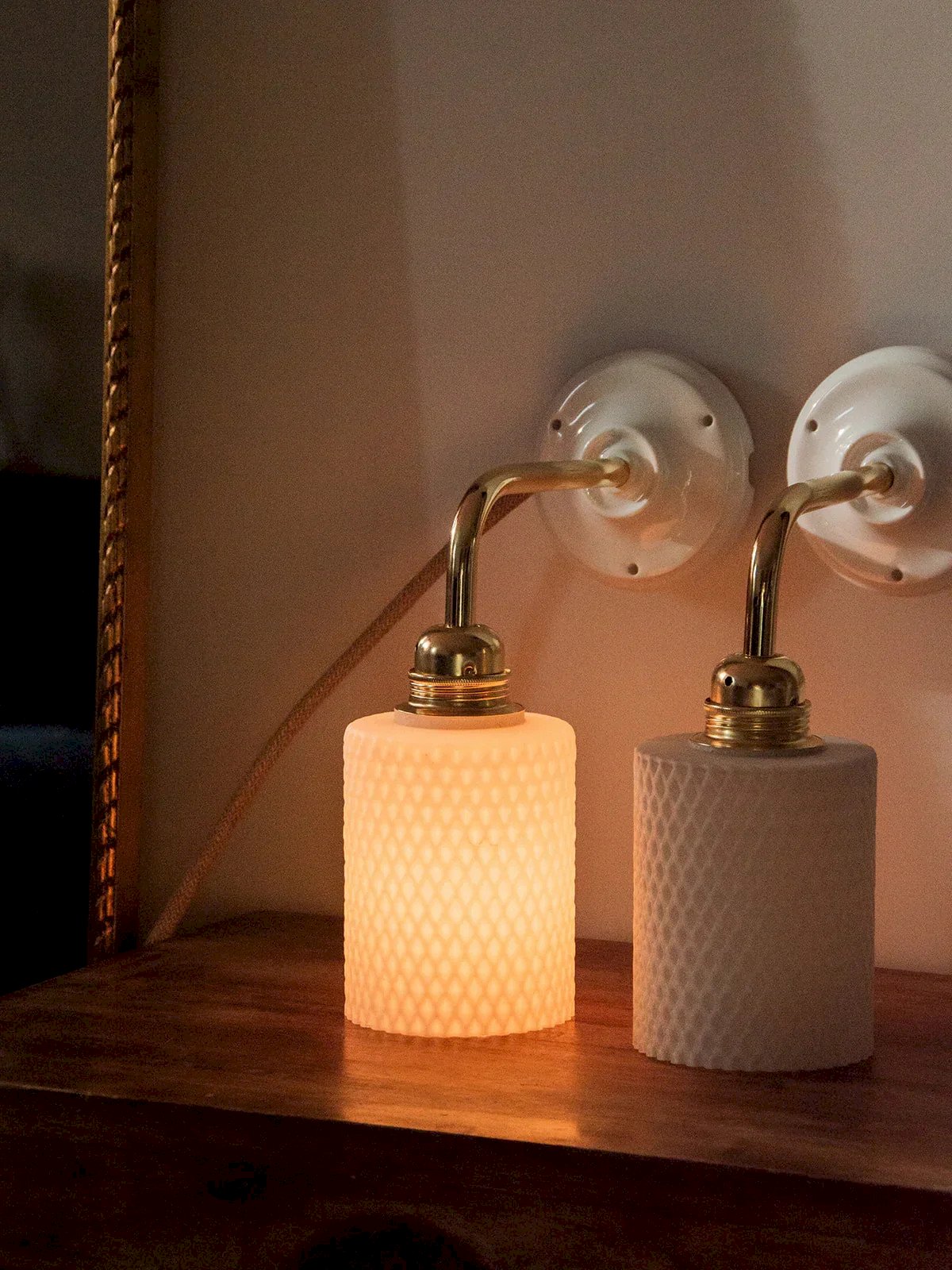 Suzette is the wall-mounted version of our Paulette! These wall lamps feature a vintage glass globe. The perfect vintage and sophisticated touch to style a bedroom or living room. Each upcycled sconce is unique, handcrafted in France on a gold arm with a porcelain base that adds a refined finish. The E27 socket and connection cord ensure a simple and safe installation. Compliant with CE standards, these sconces are perfect for illuminating your space with style. We love these Suzette lamps for their white Scandinavian glass. Sold without a bulb. Online exclusive, the meeting will take place at your home! Width: 9.5 cm Height: 26 cm Depth: 23 cm Condition: Used: Item has been used. Item shows some superficial signs of wear... Used: Item has been used. Item shows some superficial signs of wear, fully operational and functioning correctly. It may be a demonstration model or an item returned to the store after a short period of use, including any imperfections. Brand: Debongout Type: Thrifted product Style: Country Material: Glass Vintage: Yes