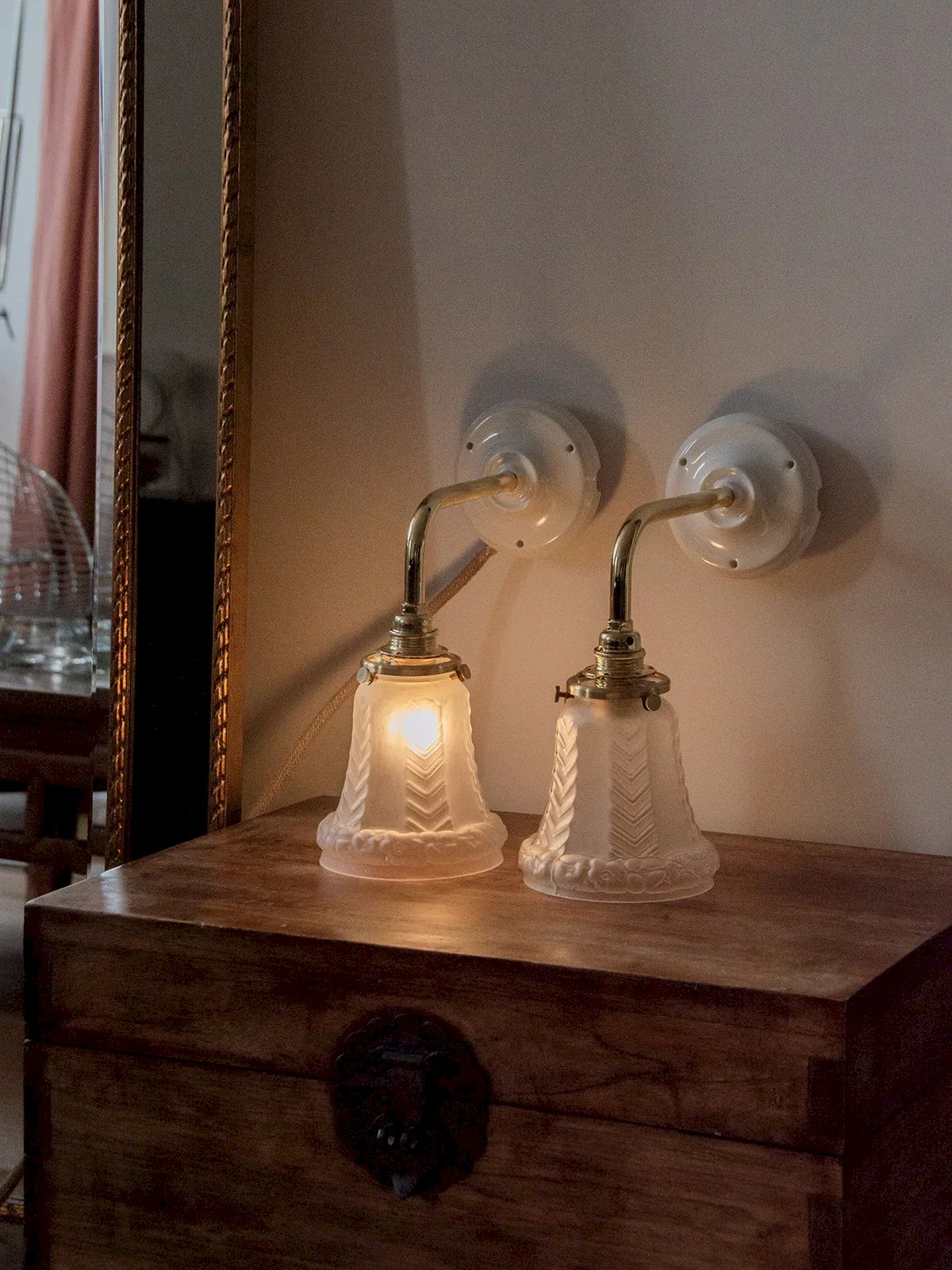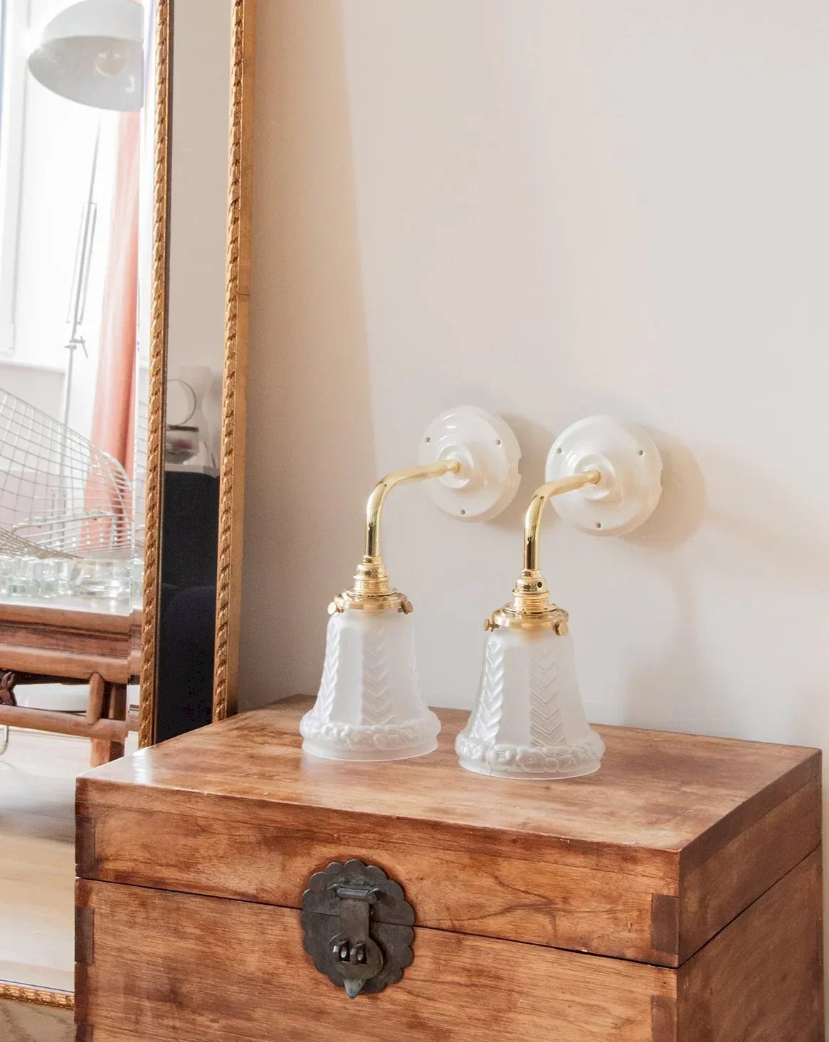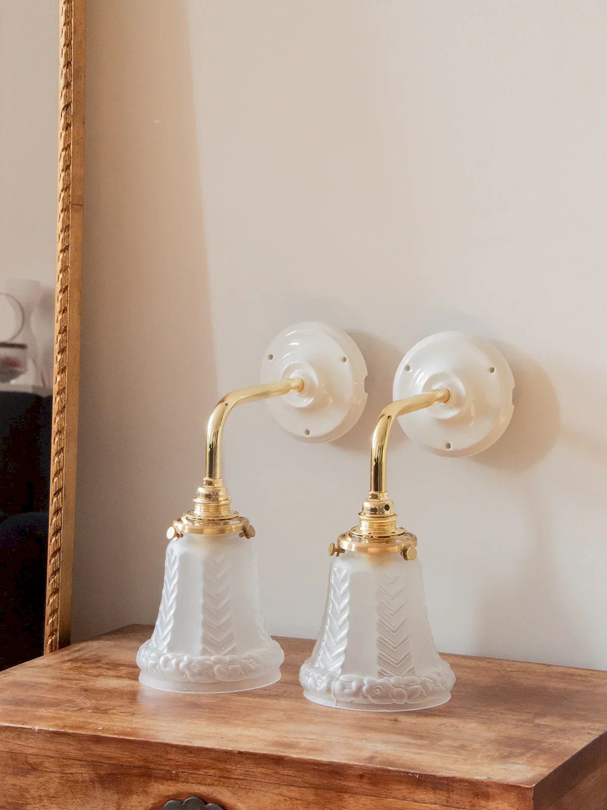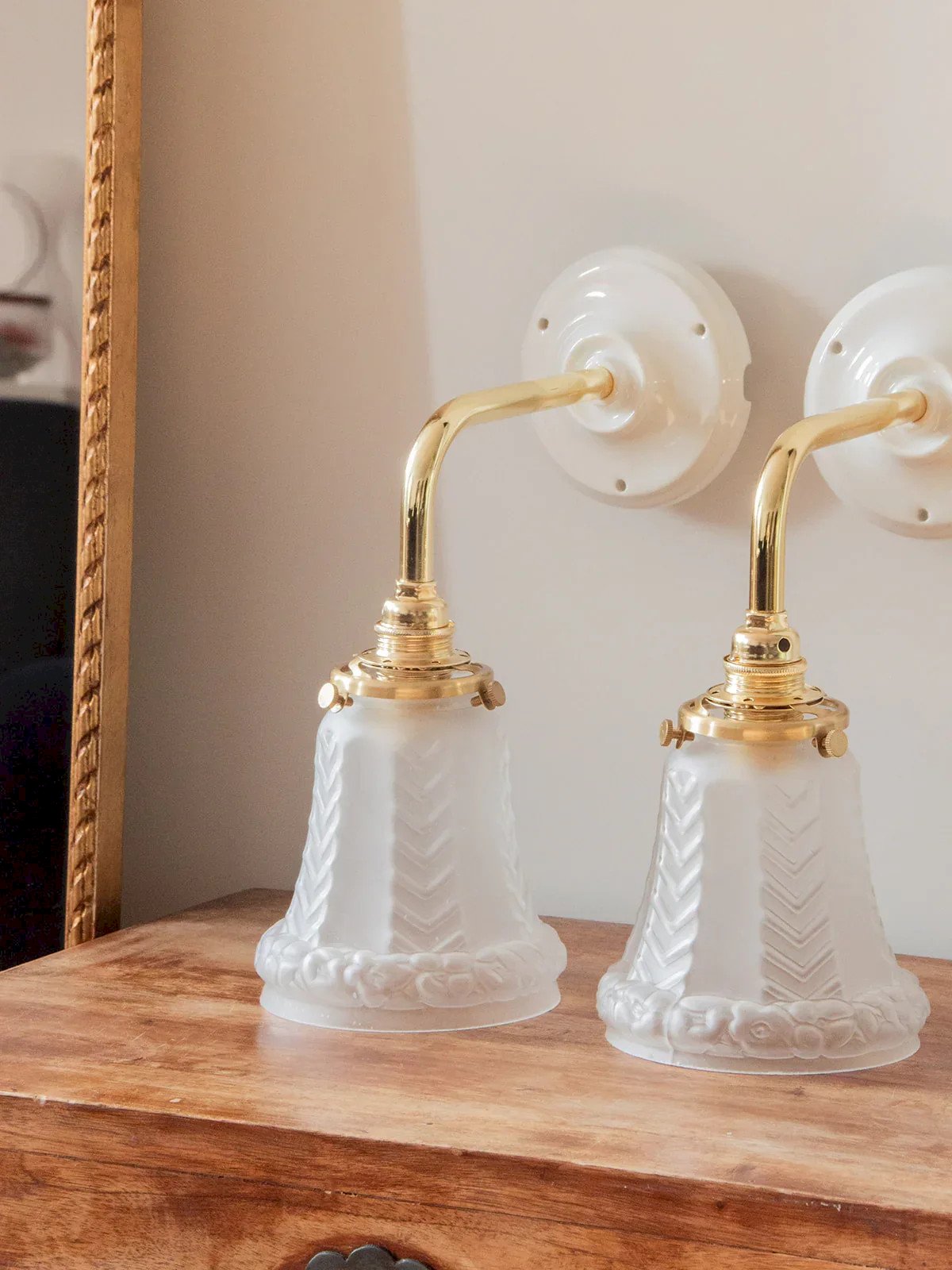 Suzette is the wall-mounted version of our Paulette! These wall lamps are made from a vintage glass globe. The perfect vintage and sophisticated touch to style a bedroom or living room. Each upcycled wall lamp is unique, handcrafted in France on a golden arm and a porcelain base that adds a refined finish. The E14 socket and connection wagon ensure a simple and safe installation. Compliant with CE standards, these wall lamps are perfect for illuminating your space with style. We love these Suzette for their Art Deco tulip glass globes. Sold without a bulb. Web exclusive, the meeting will take place at your home! Width: 12 cm Height: 28 cm Depth: 24 cm Condition: Used: Item has been used. Item shows some superficial signs of wear,... Used: Item has been used. Item shows some superficial signs of wear, fully operational and functioning properly. It may be a demonstration model or an item returned to the store after a short period of use. any potential imperfections. Brand: Debongout Type: Vintage find Style: Country Material: Glass Vintage: Yes