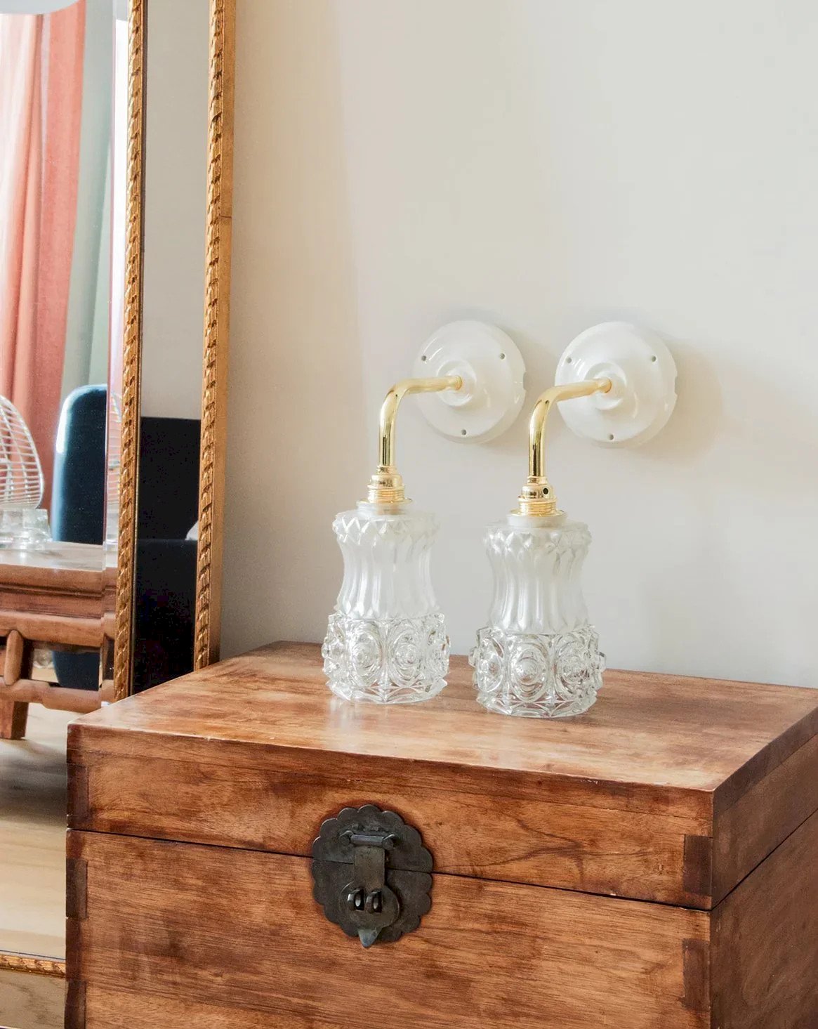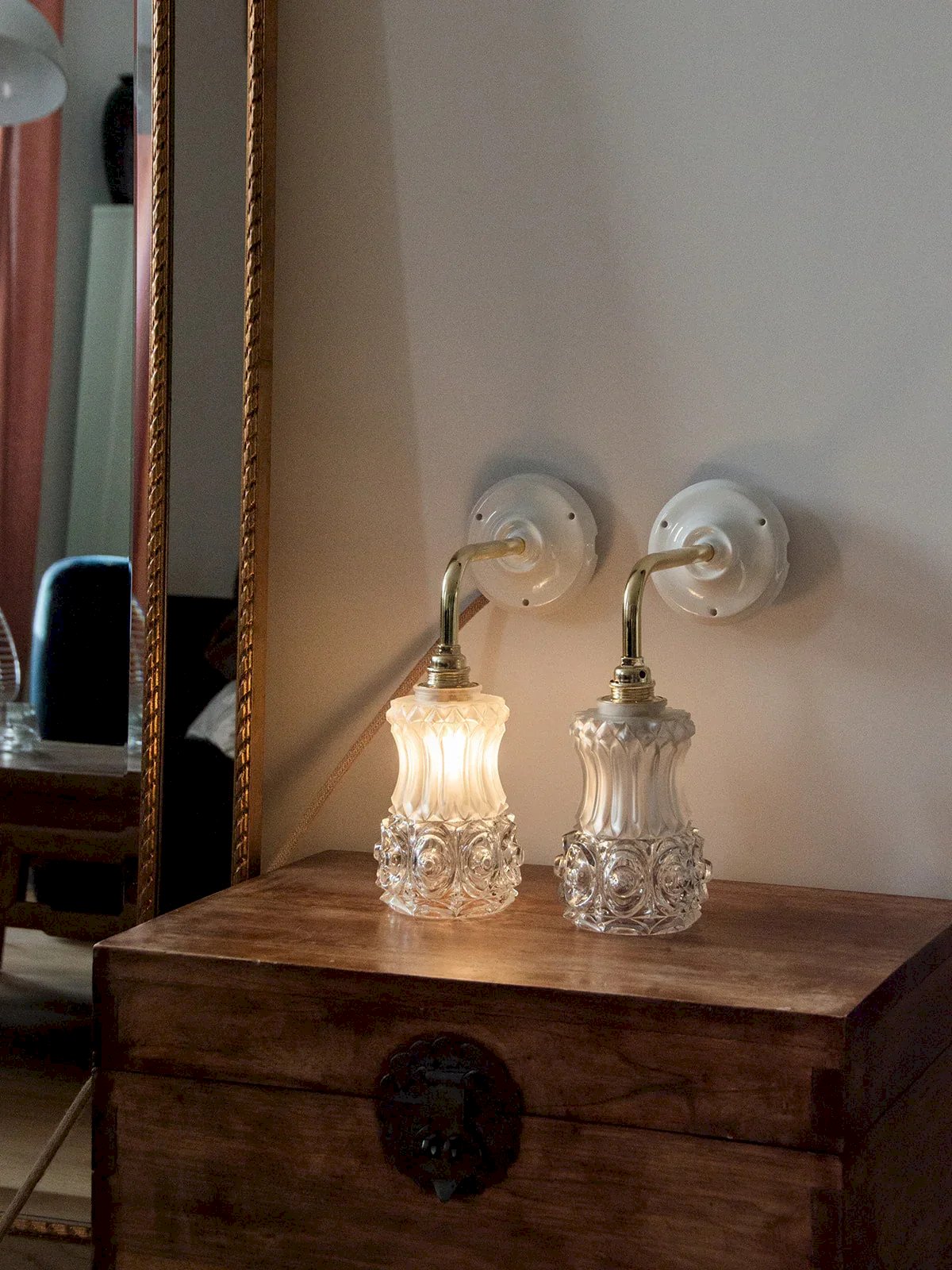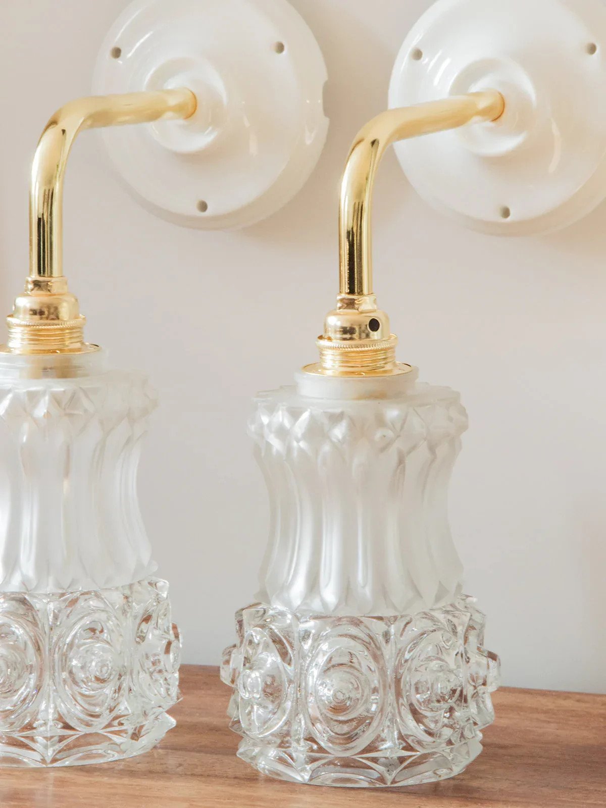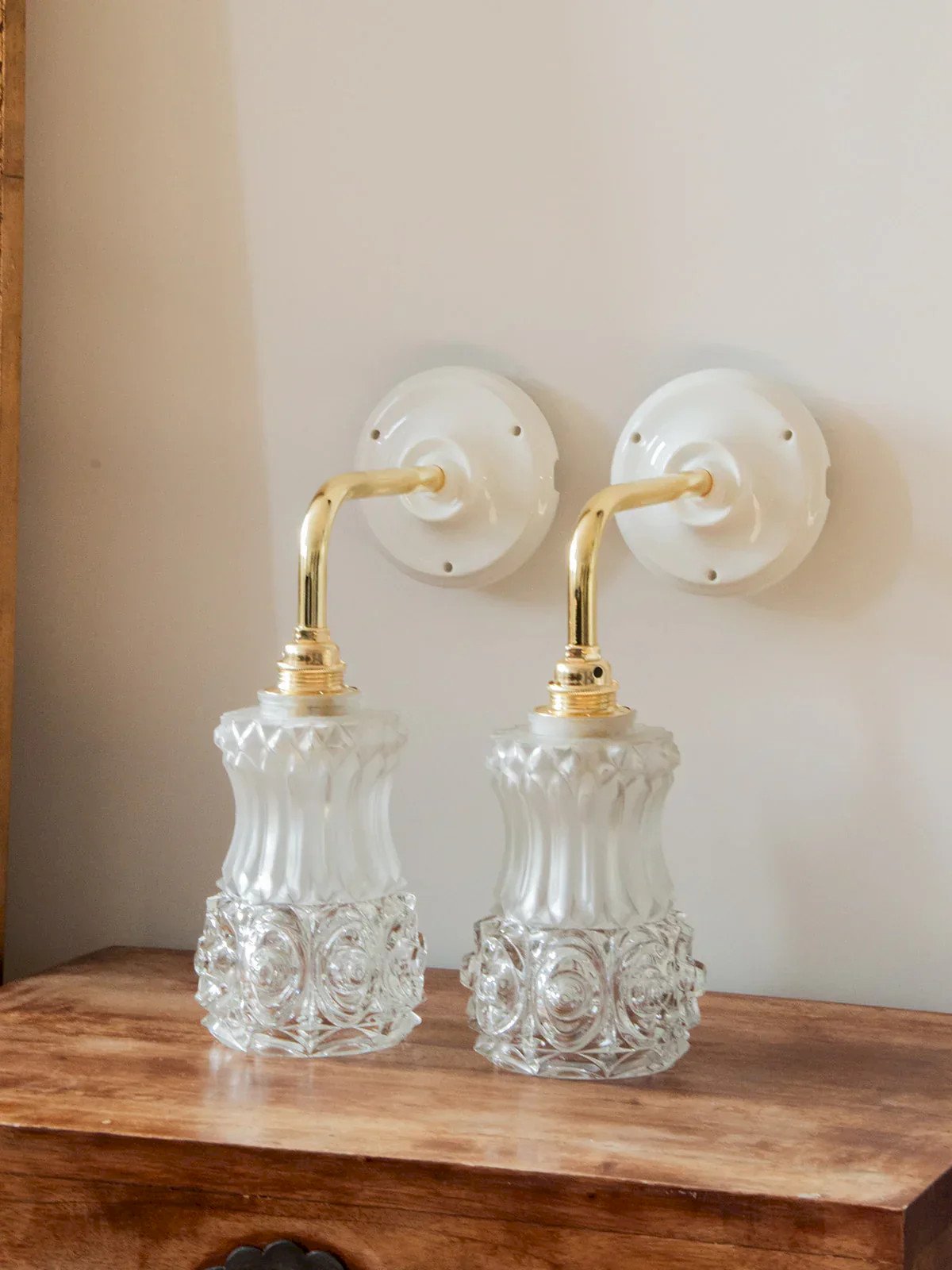 Suzette is the wall-mounted version of our Paulette! These wall lamps feature a vintage glass globe. The perfect vintage and sophisticated touch to style a bedroom or living room. Each upcycled sconce is unique, handcrafted in France, mounted on a gold arm and a porcelain base that provides a refined finish. The E14 socket and connection wagon ensure straightforward and secure installation. Compliant with CE standards, these sconces are perfect for illuminating your space with style. We love these Suzette for their tulip globes made of engraved glass with floral patterns. Sold without a bulb. Web exclusive, the meeting will take place at your home! Width: 10 cm Height: 28 cm Depth: 22 cm Condition: Used: Item that has been used. Item showing minor signs of superficial wear, ...Used: Item that has been used. Item showing minor signs of superficial wear, fully operational and functioning properly. It may be a demonstration model or an item returned to the store after a short period of use. Any imperfections. Brand: Debongout Type: Vintage product Style: Country Material: Glass Vintage: Yes