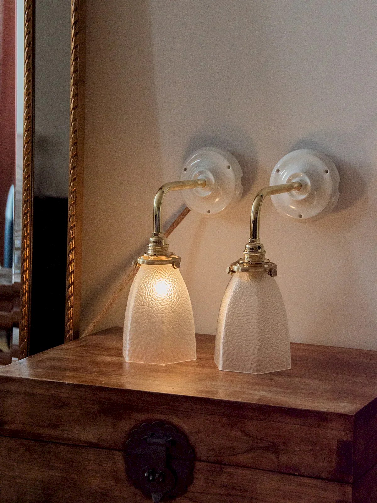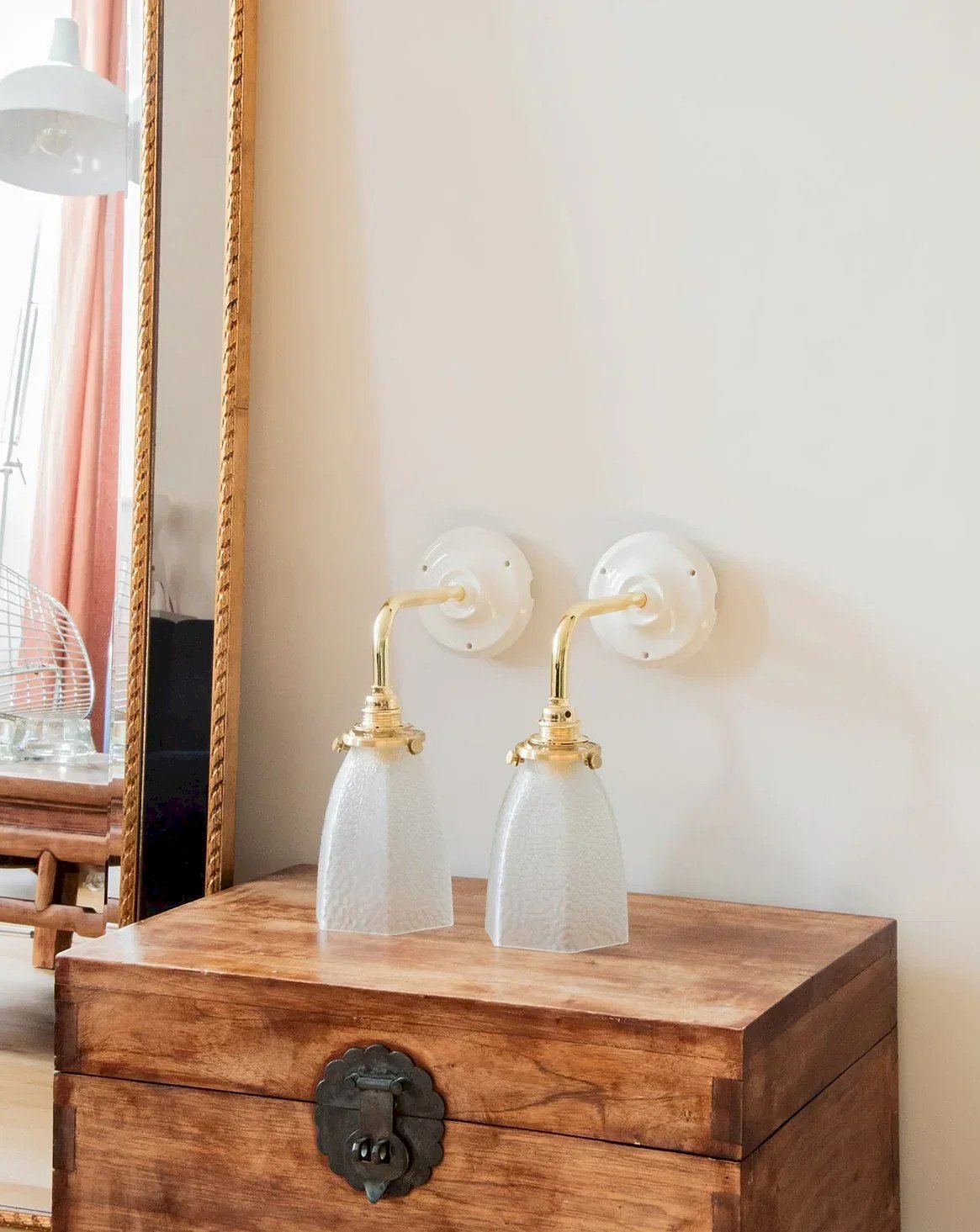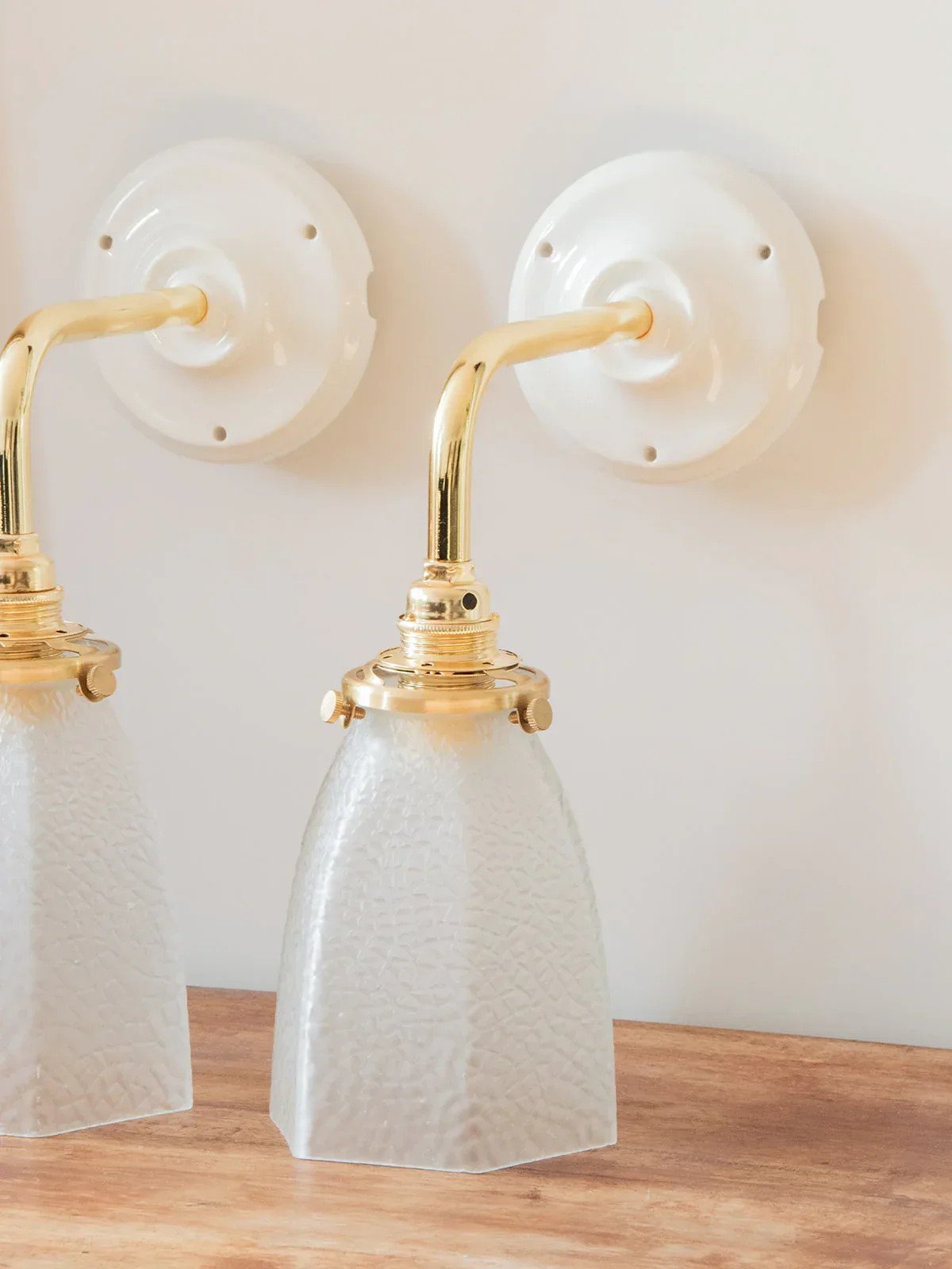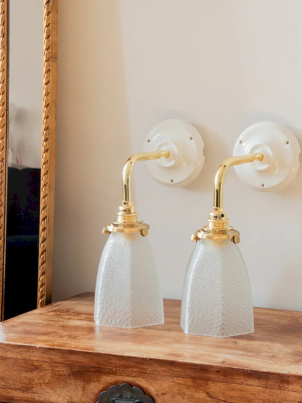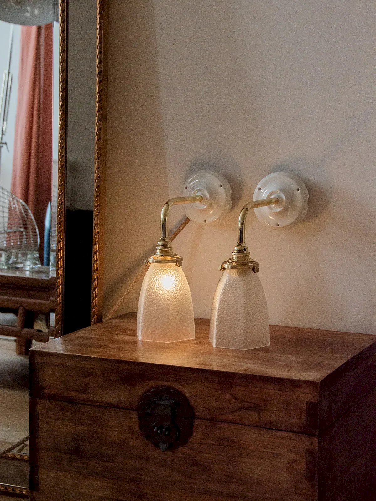 Suzette is the wall-mounted version of our Paulette! These wall lamps feature a vintage glass globe. The perfect vintage and sophisticated touch to style a bedroom or living room. Each upcycled sconce is unique, handcrafted in France with a golden arm and a porcelain base that adds a refined finish. The E14 socket and connection cable ensure a simple and secure installation. Compliant with CE standards, these sconces are perfect for illuminating your space with style. We love these Suzette for their art deco tulip globes. Sold without a bulb. Online exclusive, the meeting will take place at your home! Width: 11 cm Height: 29 cm Depth: 23 cm Condition: Used: Item that has been used. Item showing some superficial wear marks, fully operational and functioning correctly. It may be a display model or an item returned to the store after a short period of use. possible imperfections. Brand: Debongout Type: Vintage product Style: Country Material: Glass Vintage: Yes