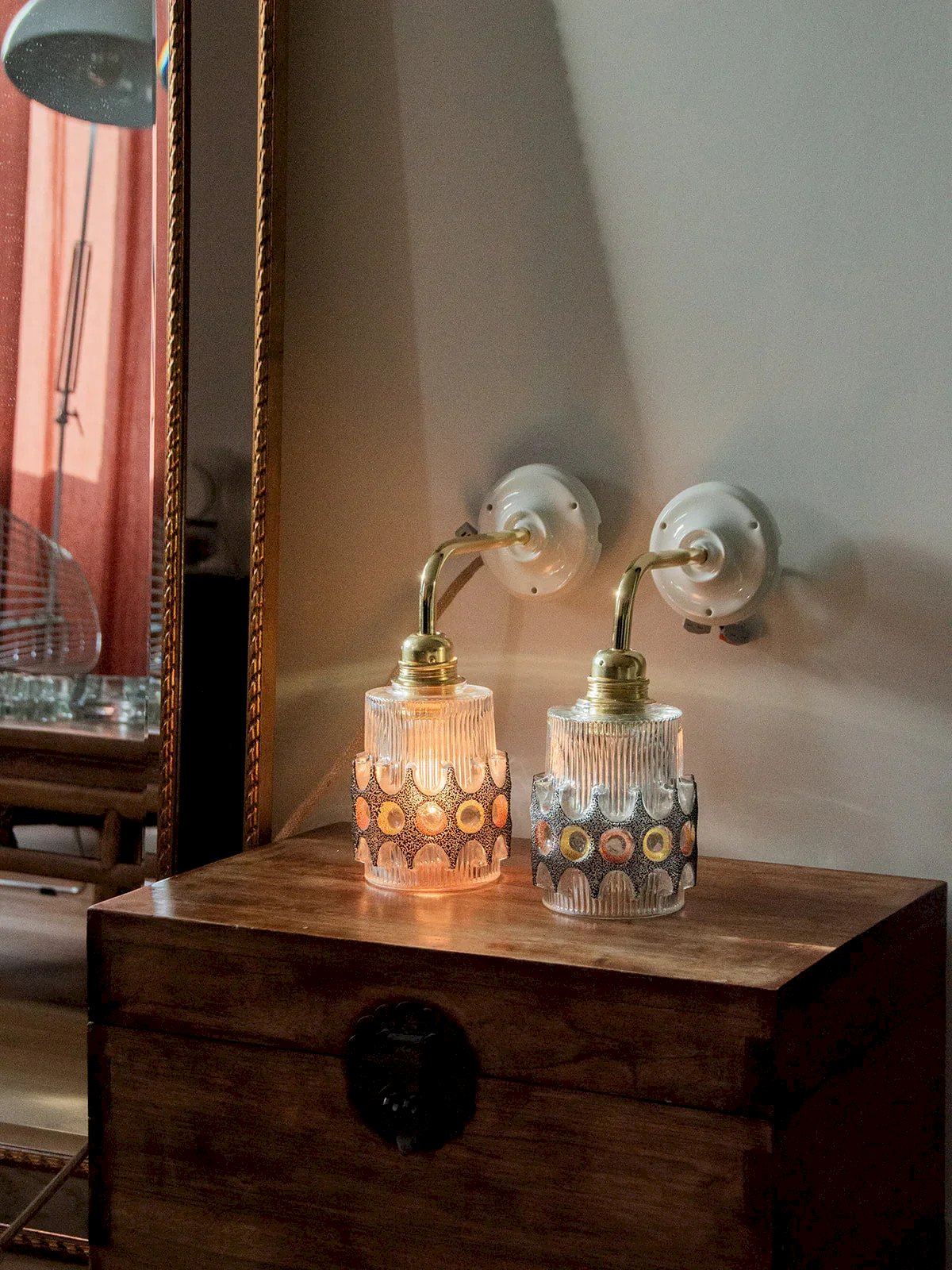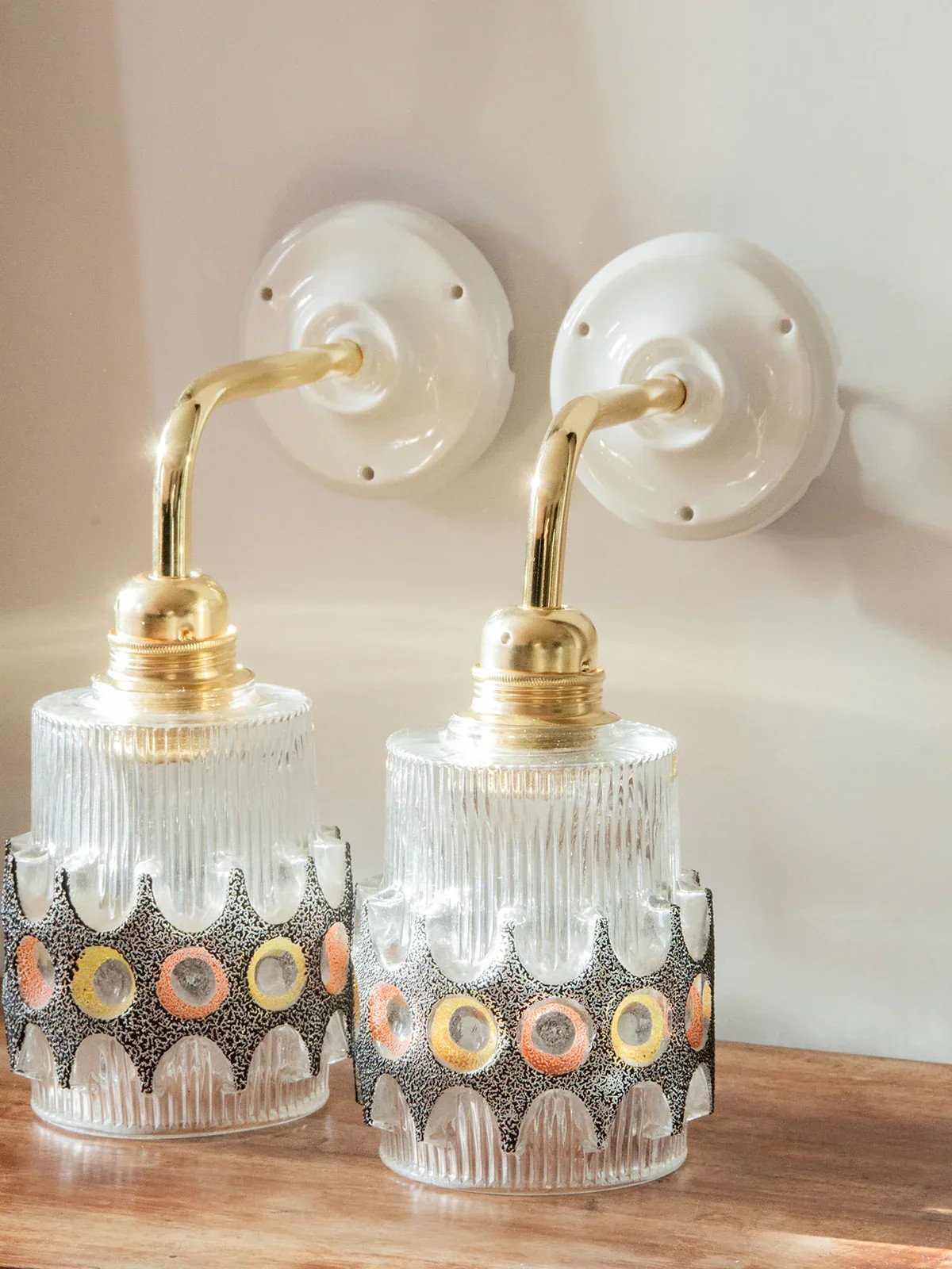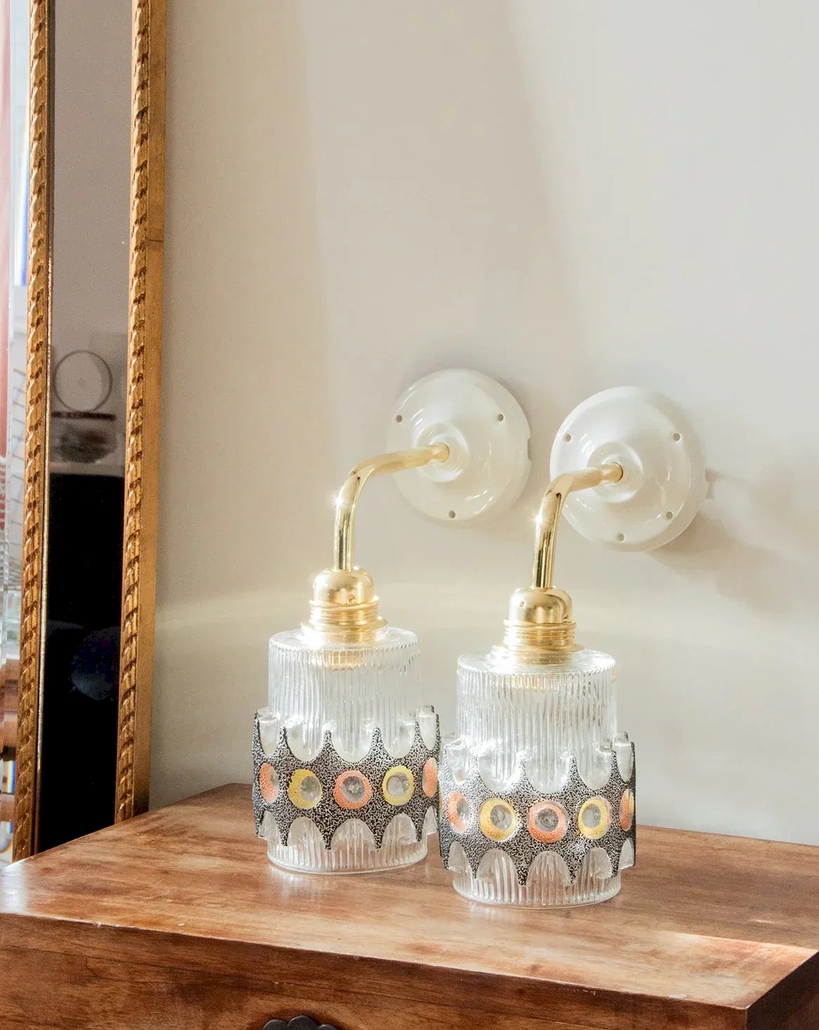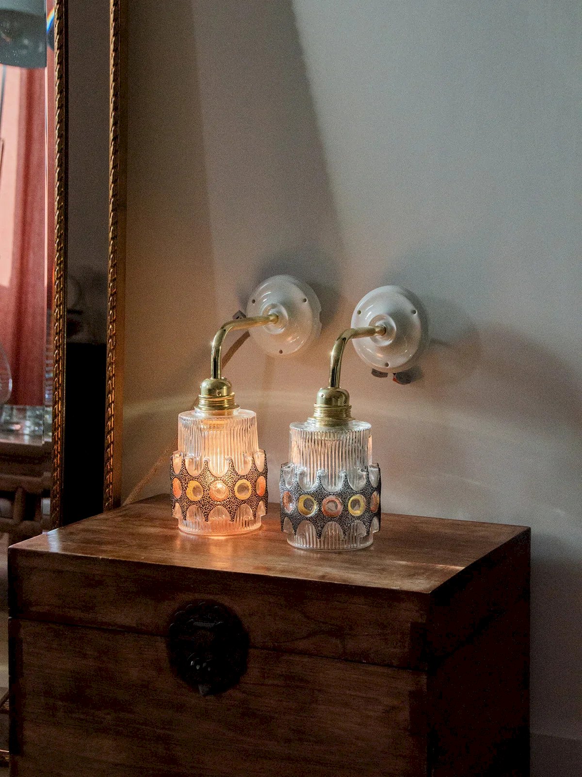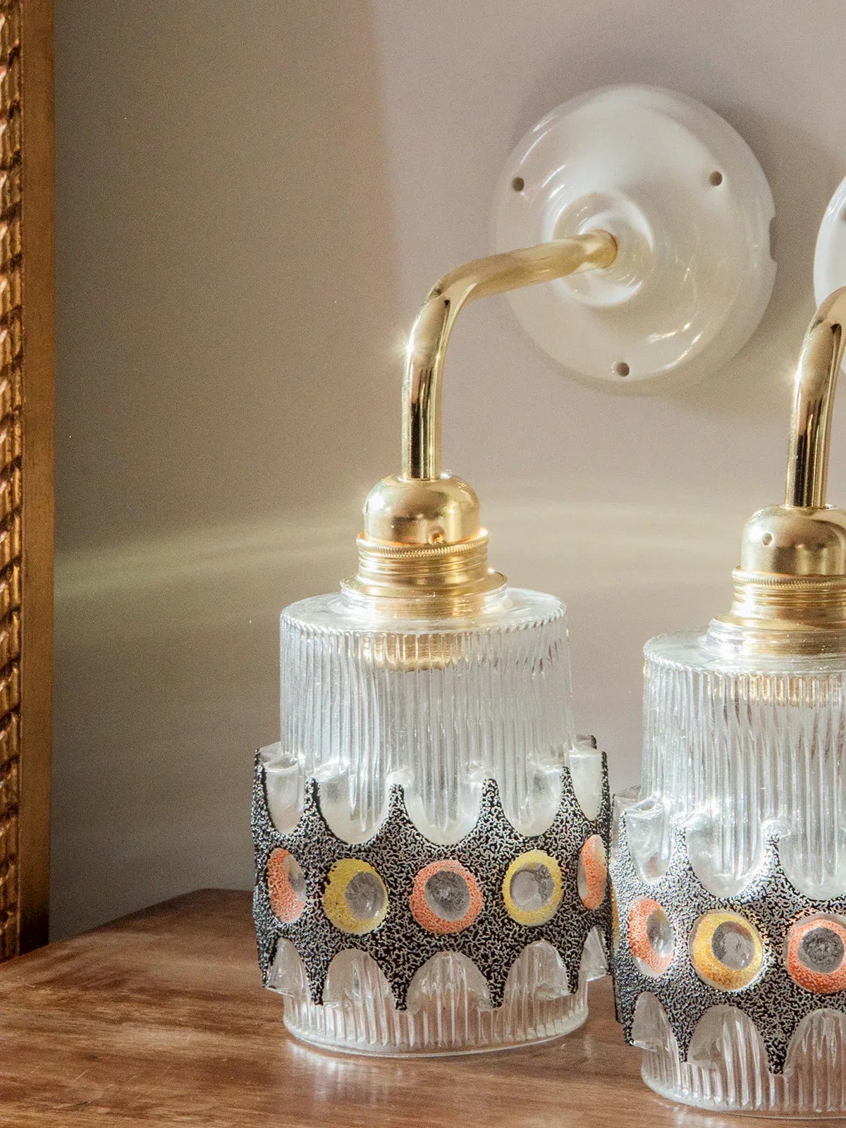 Suzette is the wall-mounted version of our Paulette! These wall lamps are made of a vintage glass globe. The perfect vintage and sophisticated touch to style a bedroom or living room. Each upcycled wall light is unique, handcrafted in France on a golden arm and a porcelain base that provides a refined finish. The E27 socket and connection wagon ensure a simple and secure installation. Compliant with CE standards, these wall lights are perfect for illuminating your space with style. We love these Suzette for their colorful patterned glass. Sold without a bulb. Online exclusive, the meeting will take place at your home! Width: 12 cm Height: 28 cm Depth: 23 cm Condition: Used: Item that has been used. Item showing some superficial signs of wear, fully operational and functioning correctly. It could be a demonstration model or an item returned to the store after a short period of use. Any imperfections. Brand: Debongout Type: Vintage product Style: Country Material: Glass Vintage: Yes