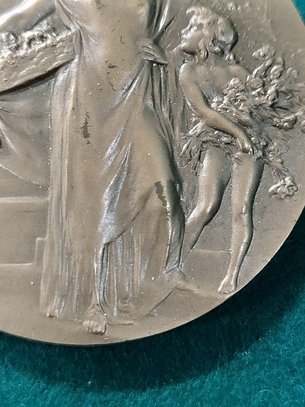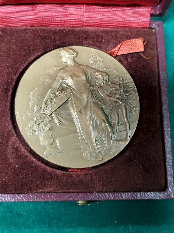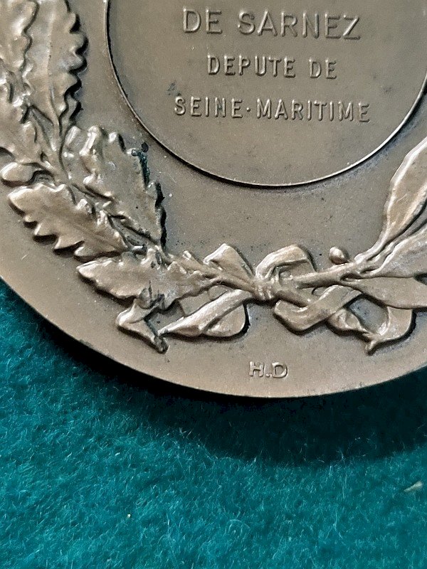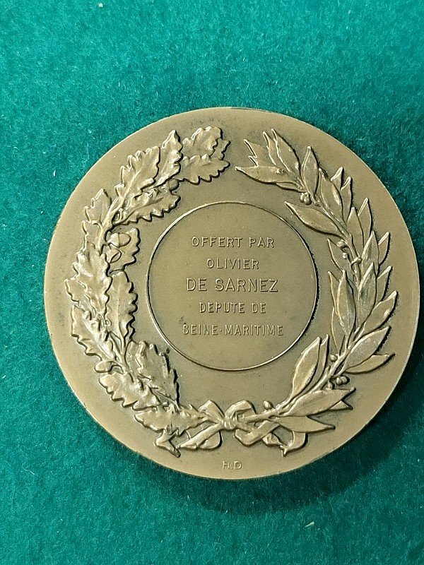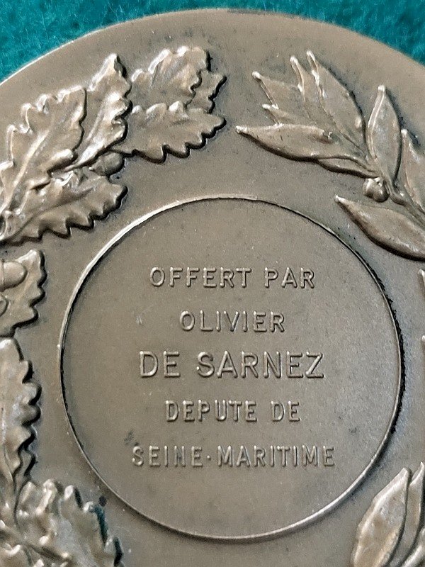 superb 1970 bronze table medal gifted by Olivier de Sarnez, Deputy of Seine Maritime. It is in very good condition and comes with its box. It is a very beautiful piece, marked "bronze" on the edge, and it is dated. Its weight is 80.95 grams, and it measures 5.2 cm in diameter. Country of origin: Metropolitan France. Subtype: TABLE MEDAL.