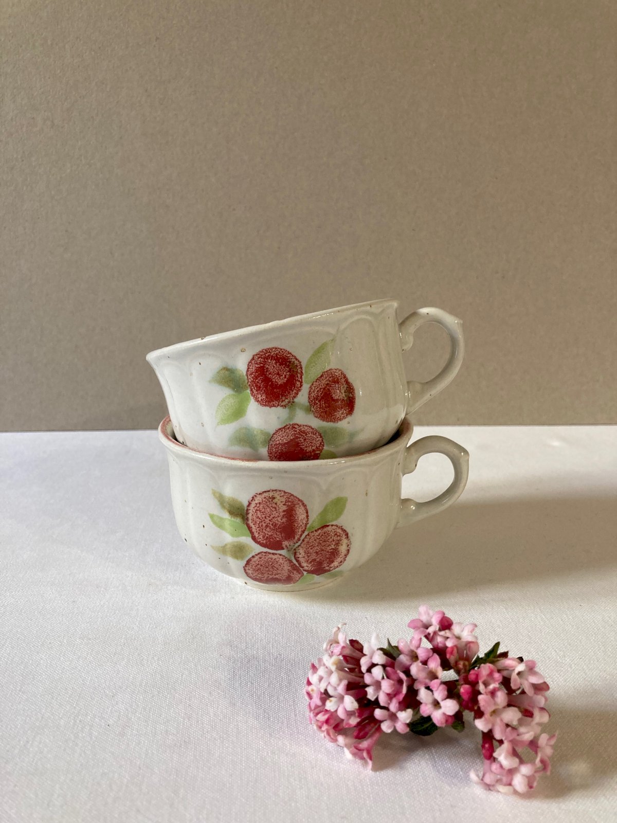 Romantic and rustic duo of earthenware cups from Salins-les-Bains. Red apple pattern. Perfect condition. Diameter (with handle): 11.5 cm / Height: 5.5 cm. Careful packaging. I answer all your questions about the items and their delivery. Feel free to explore my shop Bibelot & Co.