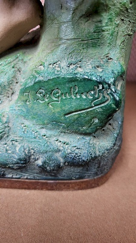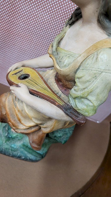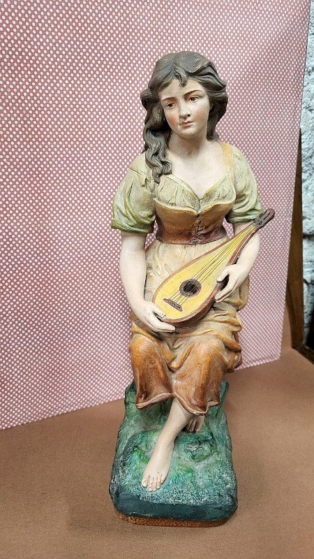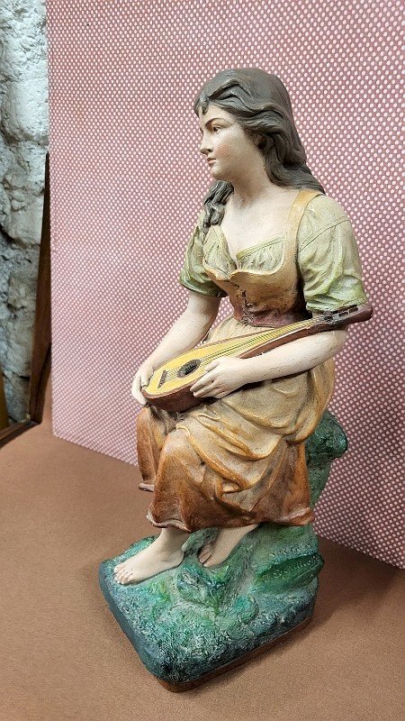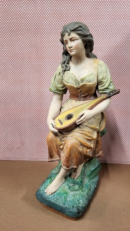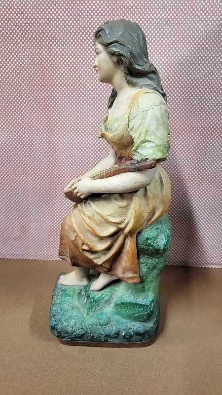 magnificent terracotta sculpture "The Lady Playing the Mandolin" by Joseph Le Guluche, it is in good condition with only the neck of the mandolin broken and glued (see photos) she is missing the thumb on her right hand, it is signed on the side with a stamp on the back with its number 343, it is truly a beautiful piece measuring 46 cm high, 13 cm wide, and 18 cm deep. Type: Statue, Sculpture Material: Terracotta Theme: Character