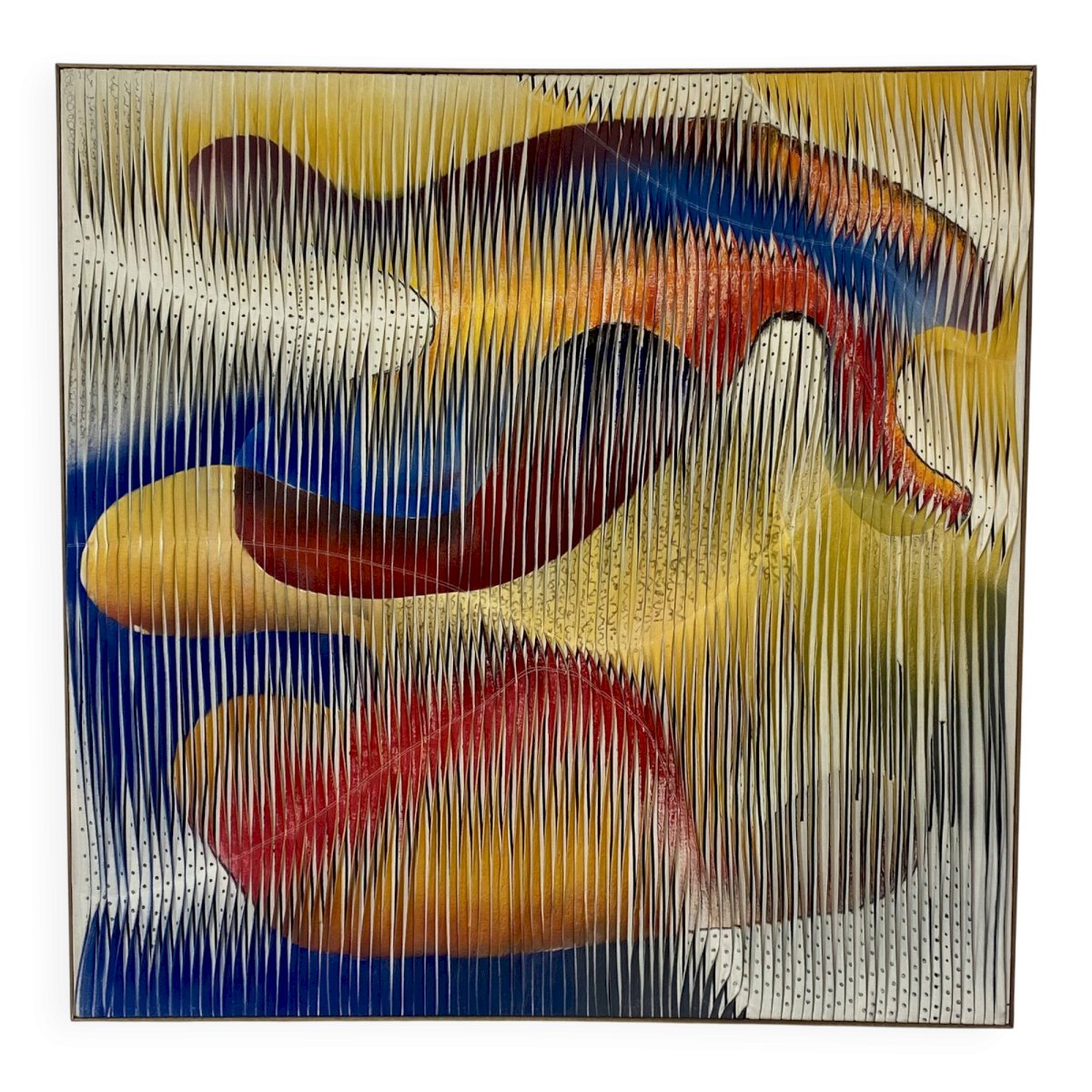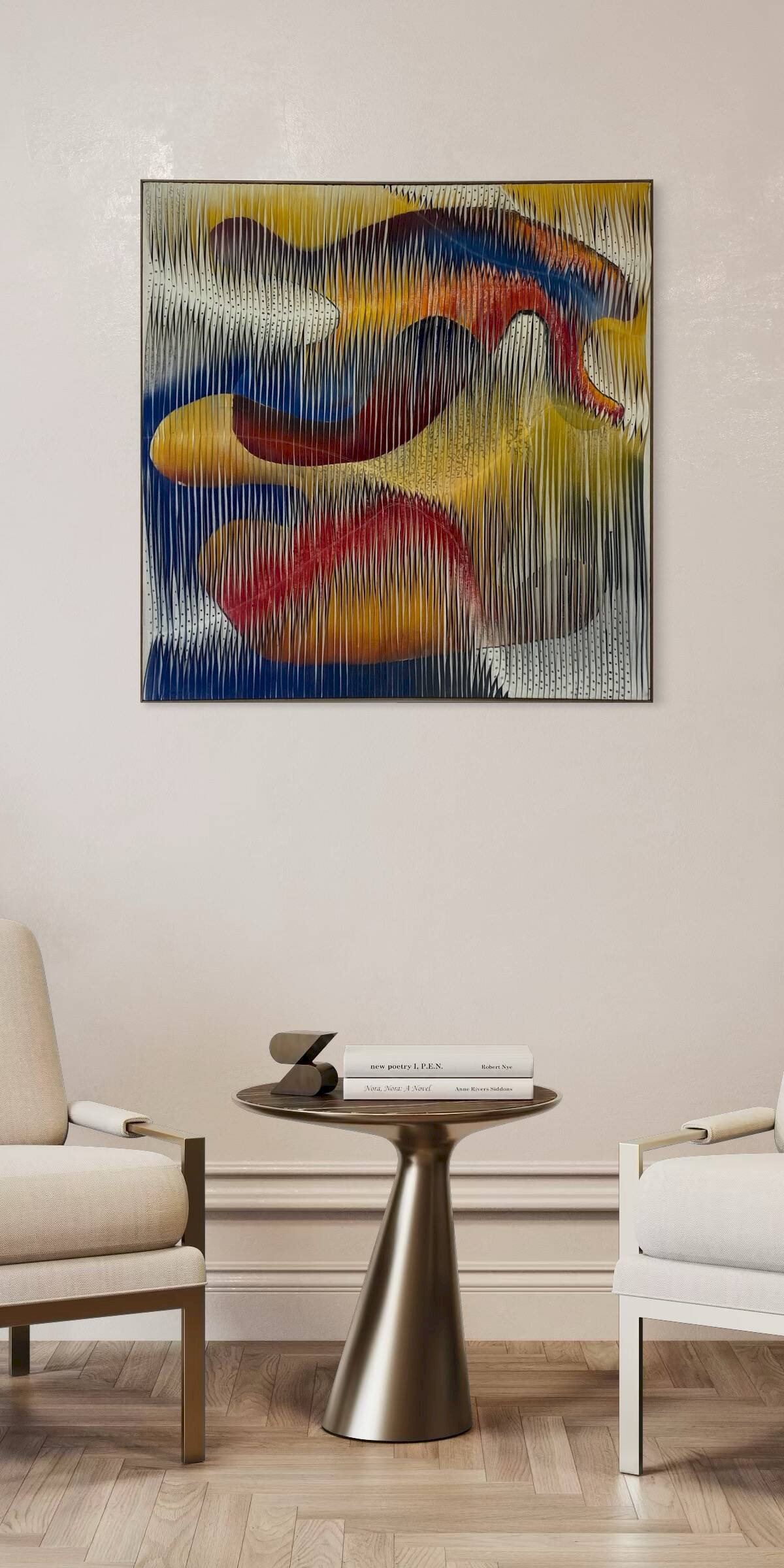 Created from a repeated folding, the work makes the surface of the canvas vibrate like a silent choreography. The shapes dance, the colors breathe, in a momentum that is both joyful and gentle. The folding sets the rhythm of the space, tracing horizontal lines and bringing forth abstract images that invite a visual stroll. The undulations, the play of light, and the colored nuances evoke a suspended moment — luminous, tranquil, almost magical. This work speaks of the fluidity of time, between tale and dream, where shapes and colors transform with the movements of the gaze and reflections. Each piece is unique, carrying a singular story. Technical characteristics: Canvas mounted on a wooden frame — 98 × 98 × 4 cm. Mixed technique: pleated textile, gold thread, ribbons, acrylic paint.