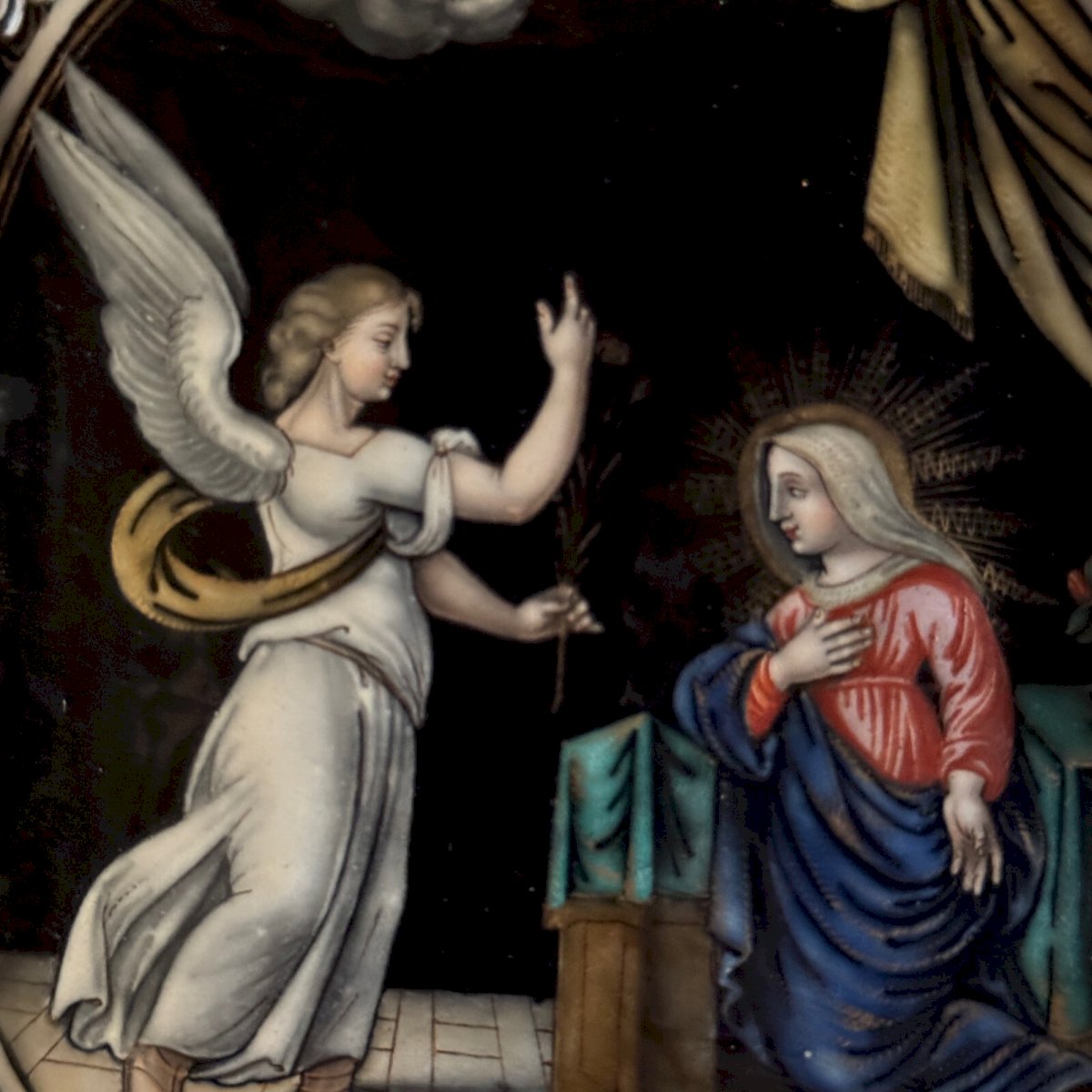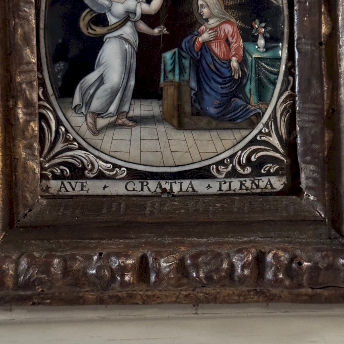 The Annunciation by Jacques Laudin 17th century rectangular enameled plaque A5703 This plaque is from the 17th century, it bears the inscription "Ave Gratia Plena" and a signature on the back "Jacques Laudin in the suburbs of Magnine in Limoges". You will note that the whole is faded and worn, yet one can still distinguish the signature. The frame is period, the enamel is of quality, finely executed. Regarding the condition, there are small missing areas on the frame, signs of wear due to time, and missing enamel especially at the bottom. Our photos allow you to appreciate the quality of the item. Please take the time to detail the photos. Do not hesitate to zoom in. The photos are an integral part of the description. Dimensions: - Frame Height: 20.8 cm Width: 18 cm Depth: 2.5 cm - Enamel Height: 13 cm Width: 11 cm P: 1584852 I remain at your disposal for any questions. Type: Showcase object, Decorative Height: 20.8 cm Length: cm Width: 18 cm