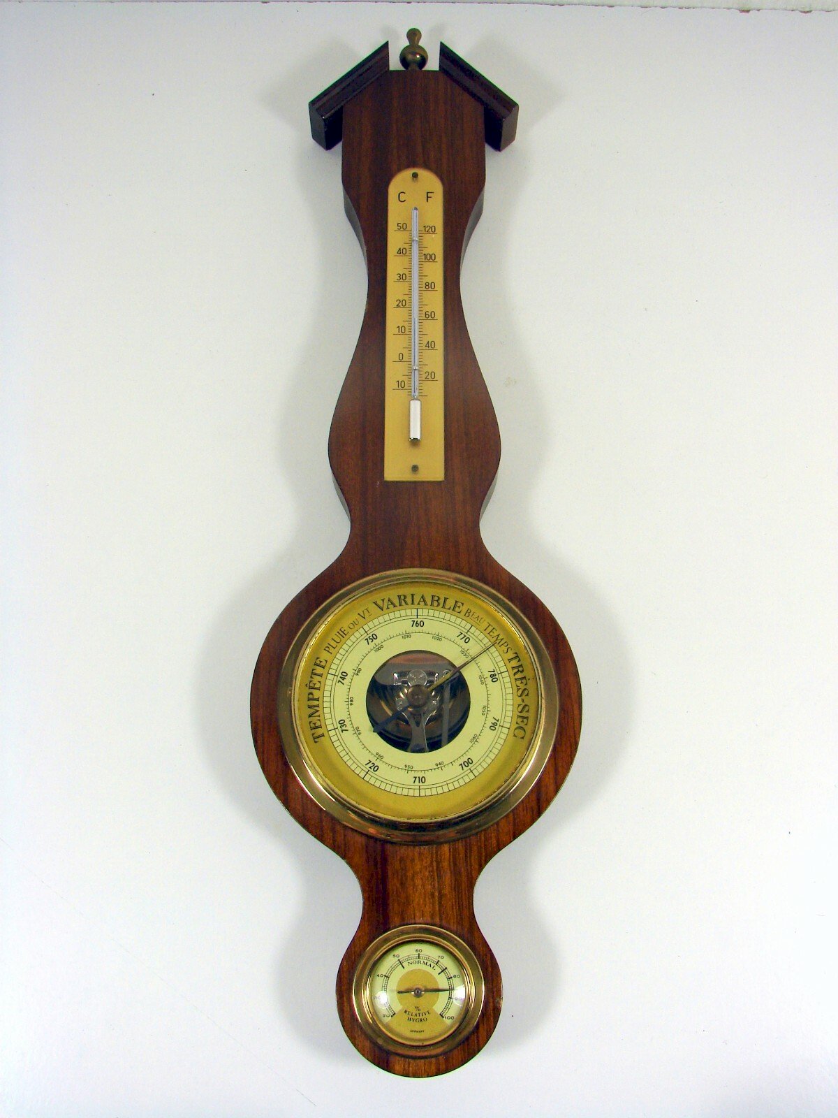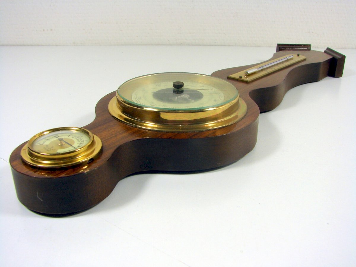Thermometer / Barometer / Hygrometer Vintage Wood and Brass. Item in very good overall condition, see photos. Dimensions: Length: 50 cm, Max width: 13.5 cm, Weight: 668 g.