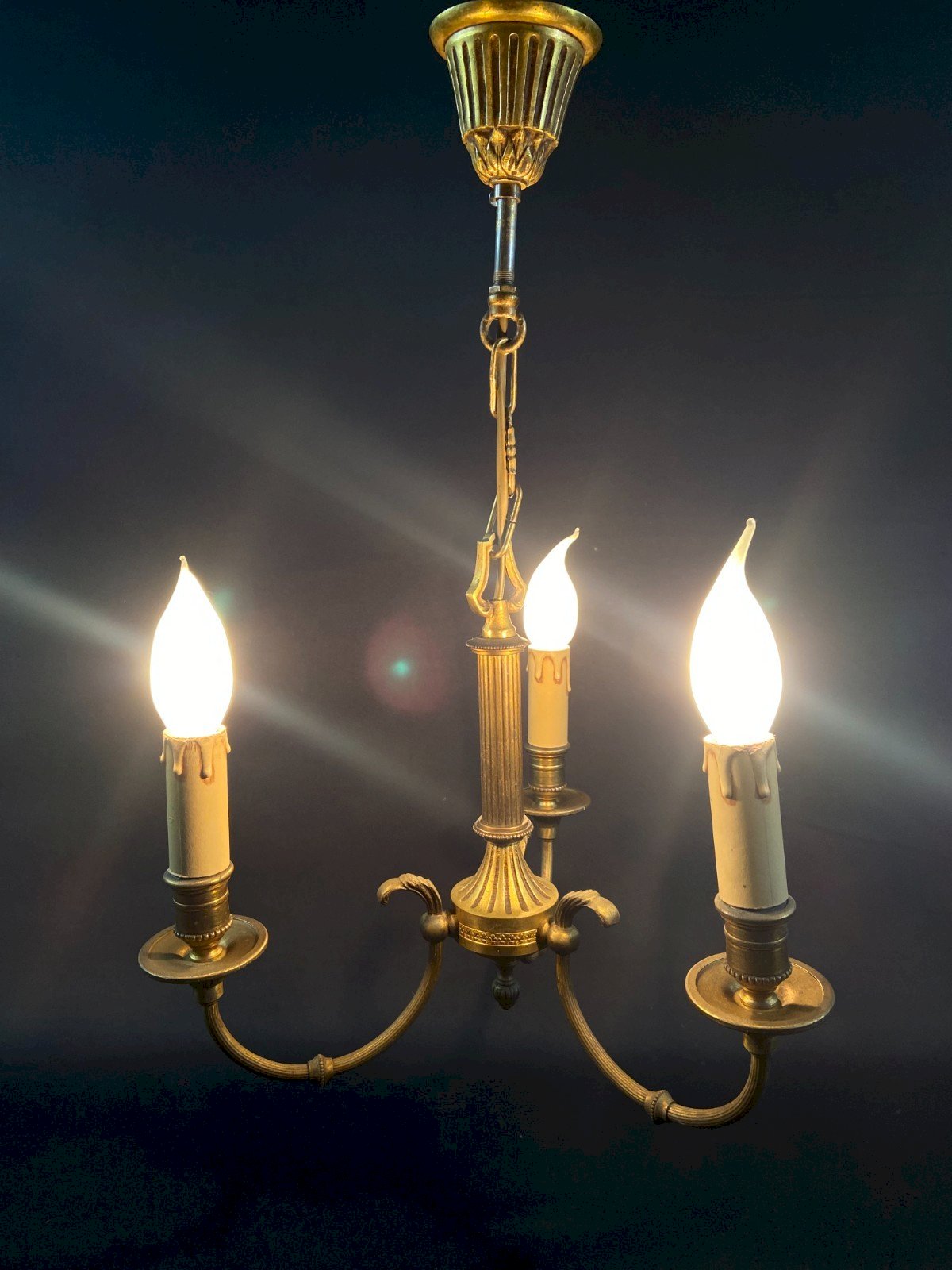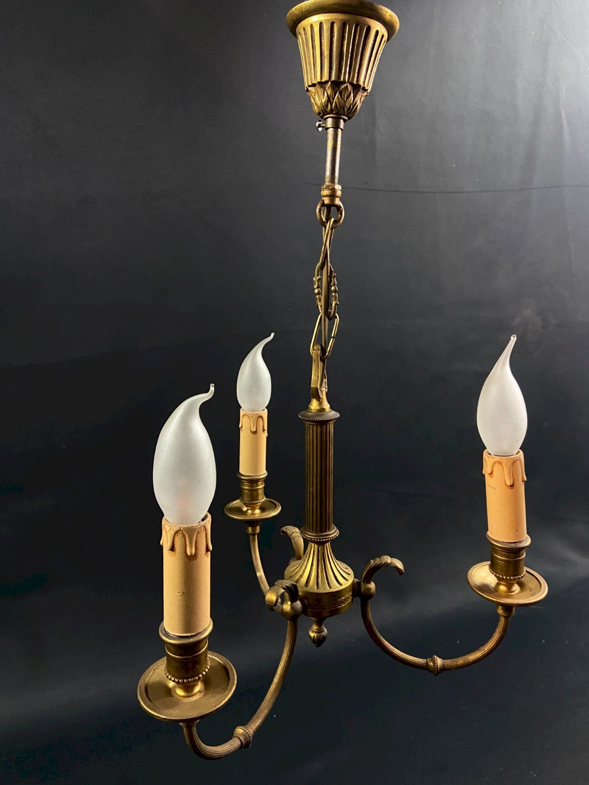 3-light bronze chandelier in Louis XVI style, 20th century. Maximum dimensions: Height 48 x span 31.2 cm. Weight: 1702 grams. Very good condition. Bulbs not included. Ultra secure shipping worldwide - Pickup of orders possible by appointment at 7 rue Notre-Dame 18000 Bourges. - Possibility of grouping within the same package: please contact me in advance so I can calculate your optimized shipping costs. Type: Suspension, Chandelier. Period: 19th century and earlier. Country of origin: France. Subtype: Interior. Material: Bronze. Style: Louis XVI. Type of lighting: Standard. Features: Screw fitting.