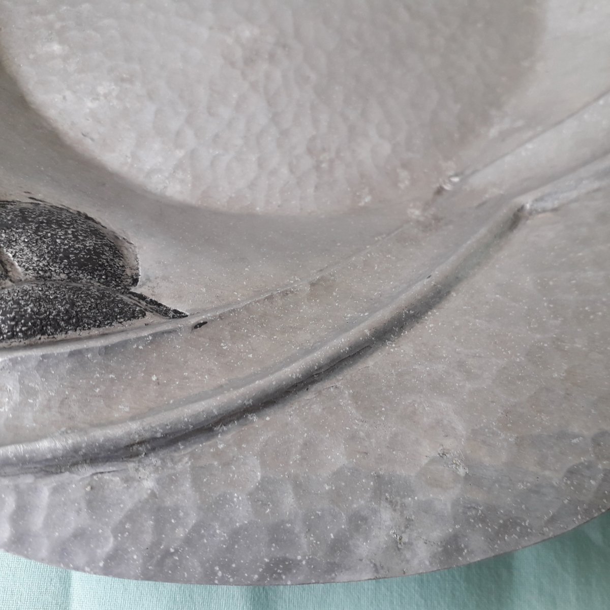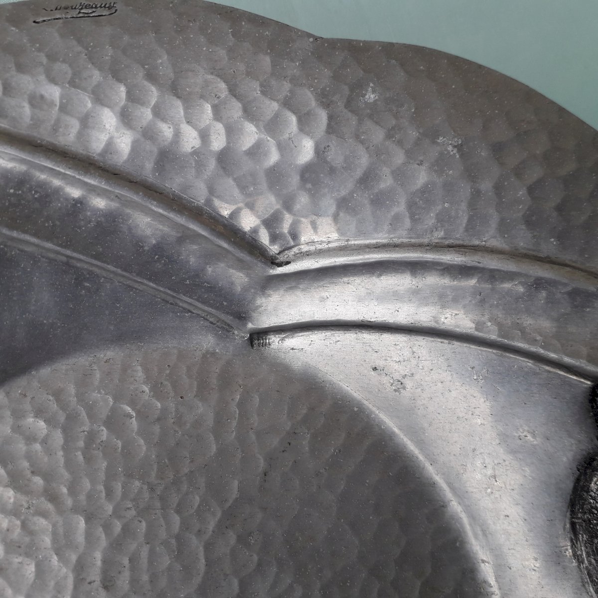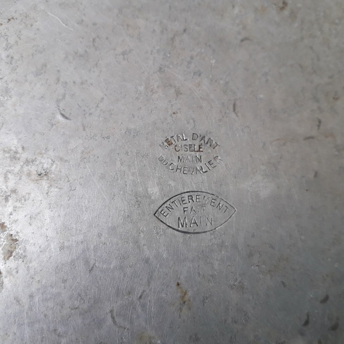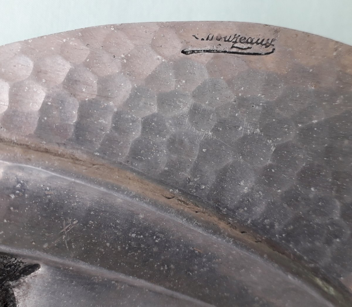 Antique hammered tin dish, signed "L. Houzeaux", Art Deco, marks on the back "Hand-chiseled art metal by the knight", and "Completely handmade". Good overall condition, no breakage or deformation, just needs cleaning. Dimensions: height 4 cm, diameter approximately 28 cm. Weight 0.3 kg. Please feel free to contact me for any further information and/or to make your offers. See my other items for sale.
