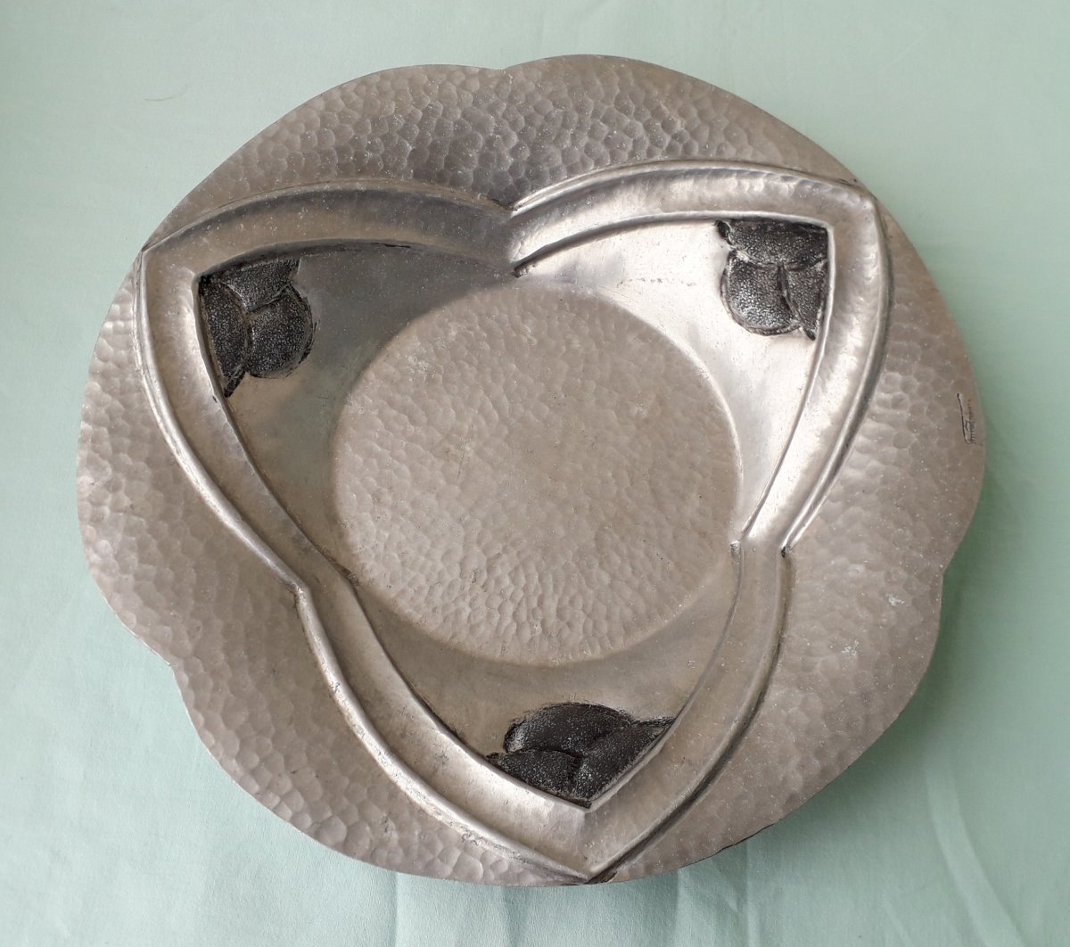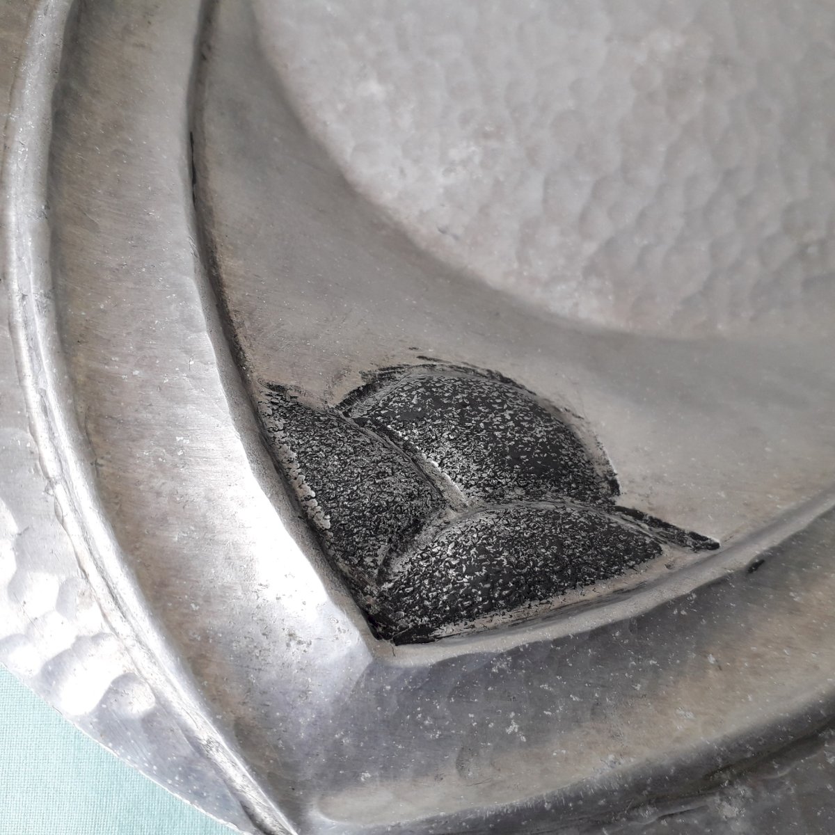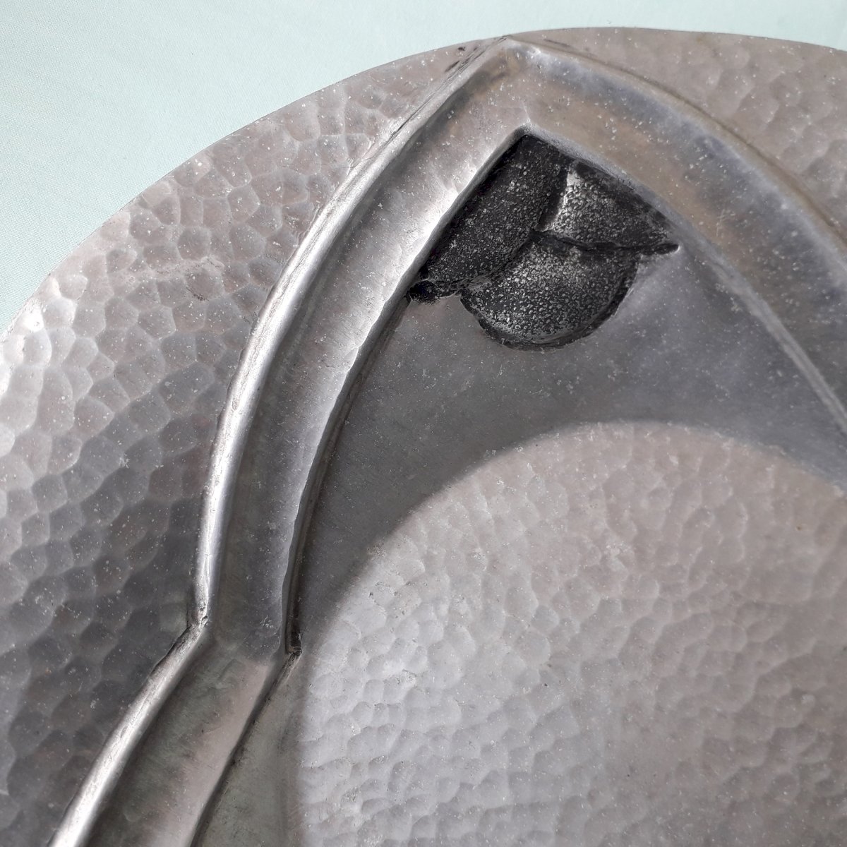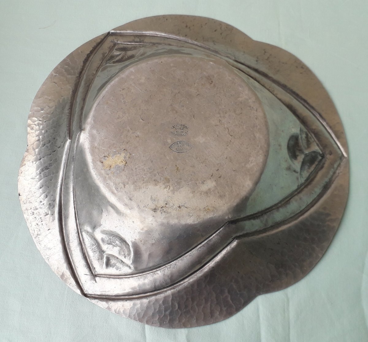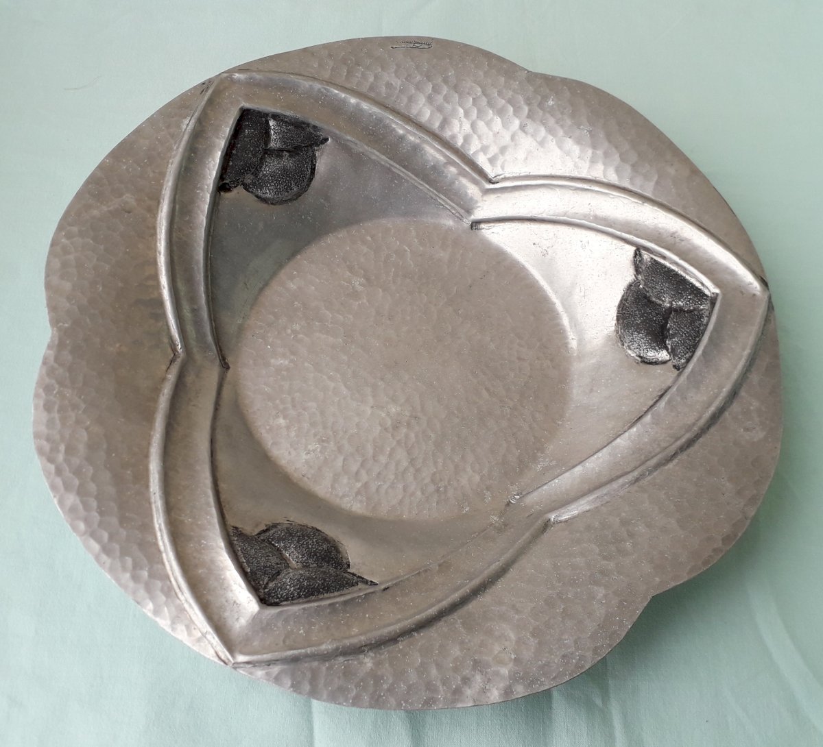Antique hammered tin dish, signed "L. Houzeaux", Art Deco, marks on the back "Hand-chiseled art metal by the knight", and "Completely handmade". Good overall condition, no breakage or deformation, just needs cleaning. Dimensions: height 4 cm, diameter approximately 28 cm. Weight 0.3 kg. Please feel free to contact me for any further information and/or to make your offers. See my other items for sale.