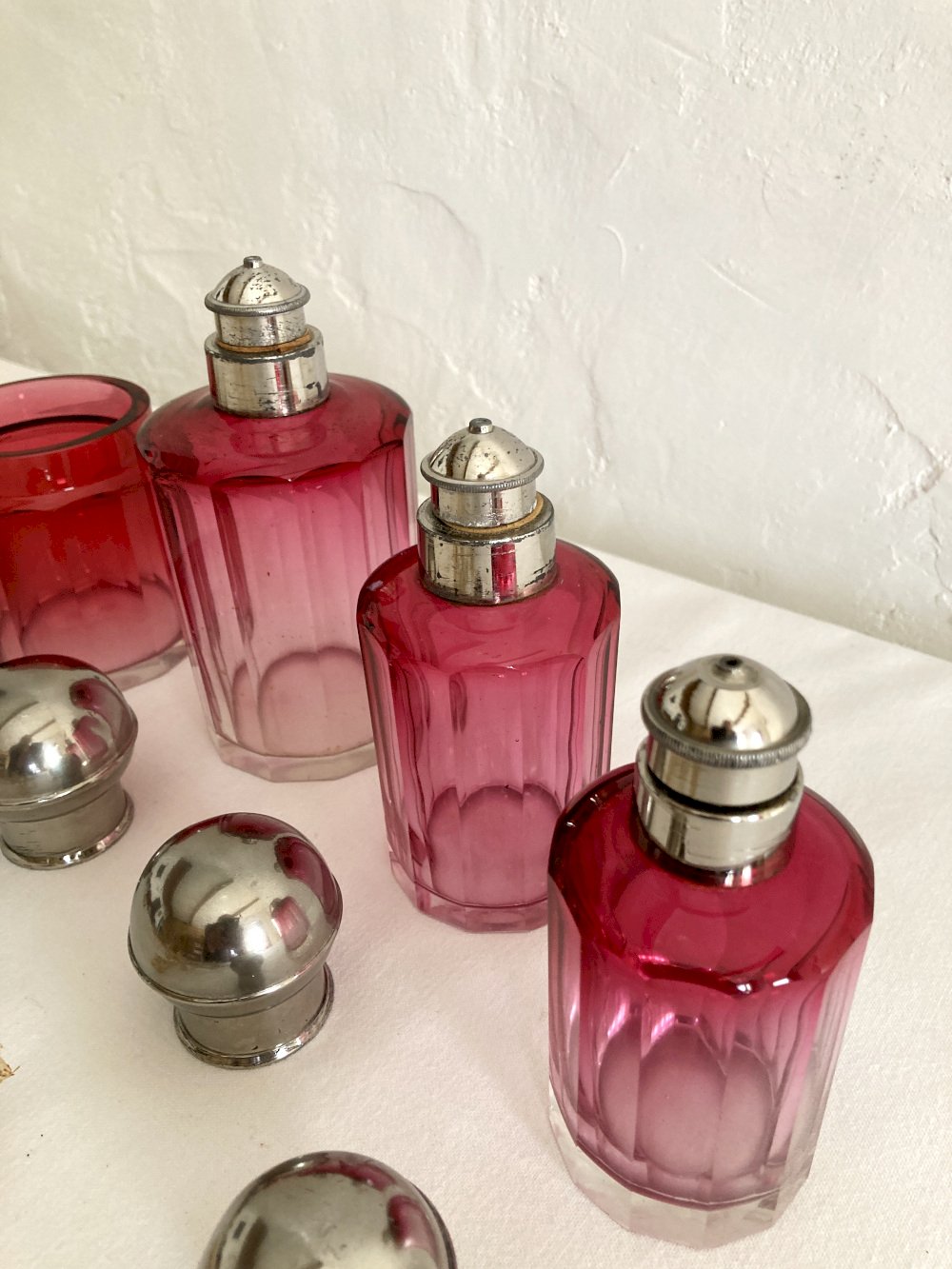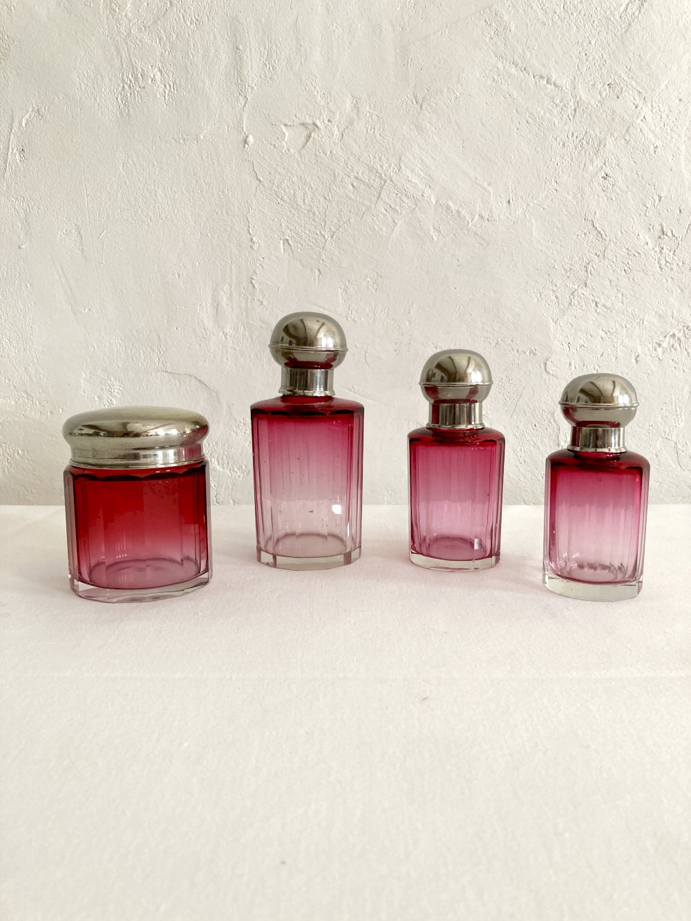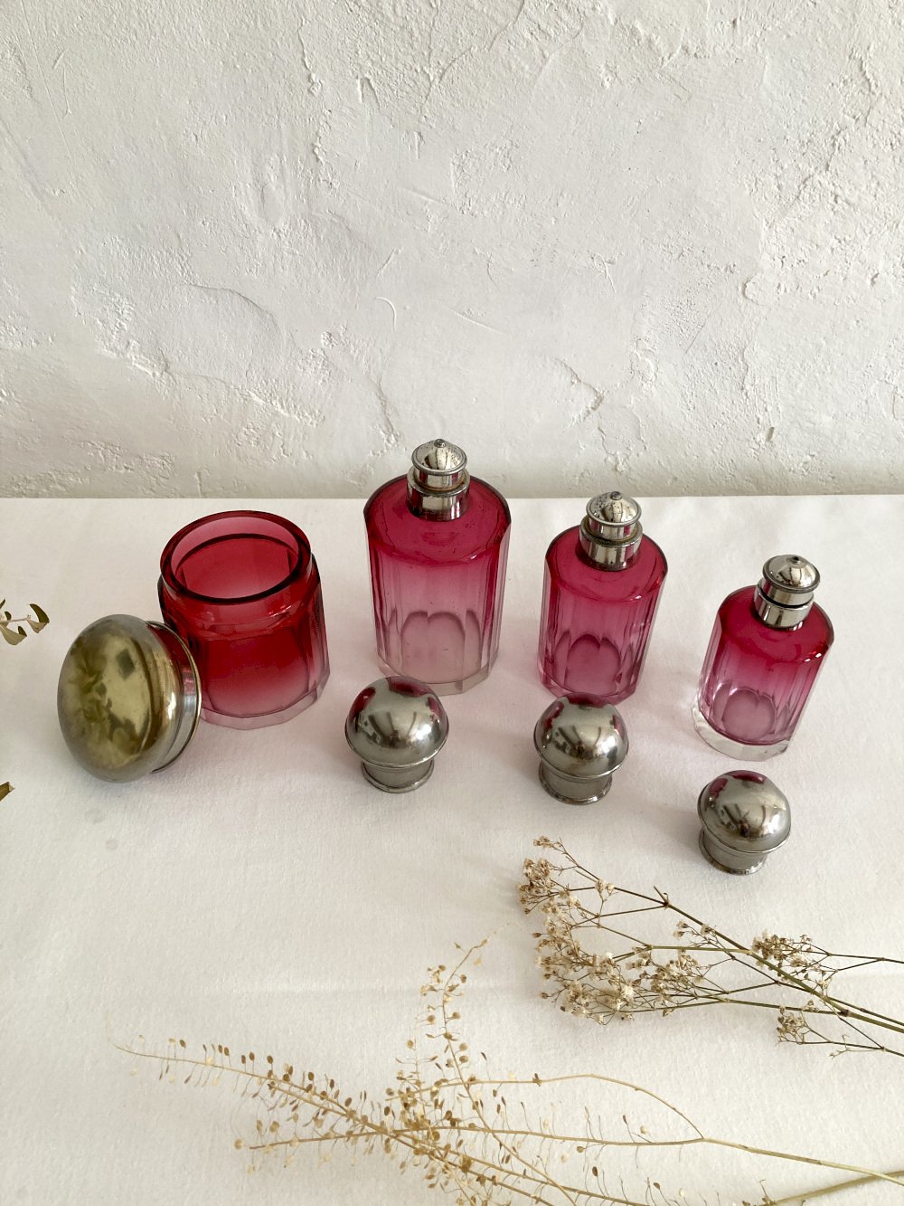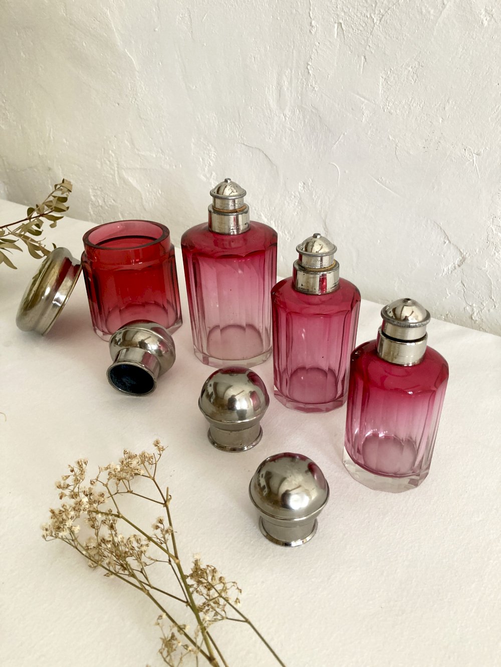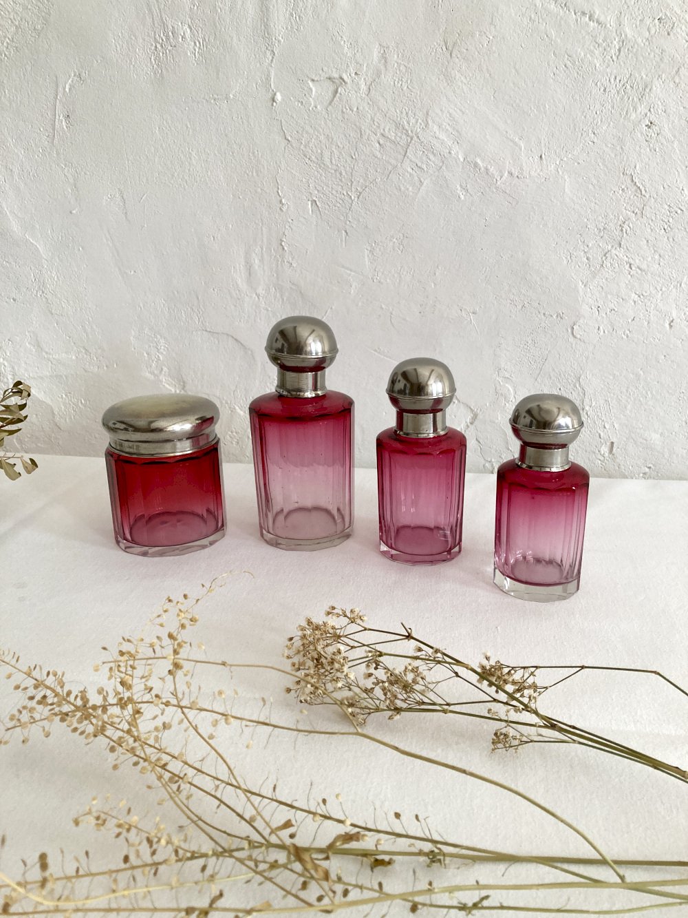 Old and delicate pink tinted crystal vanity set from the 1920s. It consists of a powder compact and three bottles for perfume and eau de toilette. The sprayers are missing from all three bottles. They are fitted with silver-plated caps that cover a small screw cabochon. In good condition for its advanced age, this set has a few small chips on its silver parts as well as on the lower edges of two bottles, one of which is relatively significant (as shown in the photo). There are also a couple of insignificant small dents on the caps. All are leak-proof.
