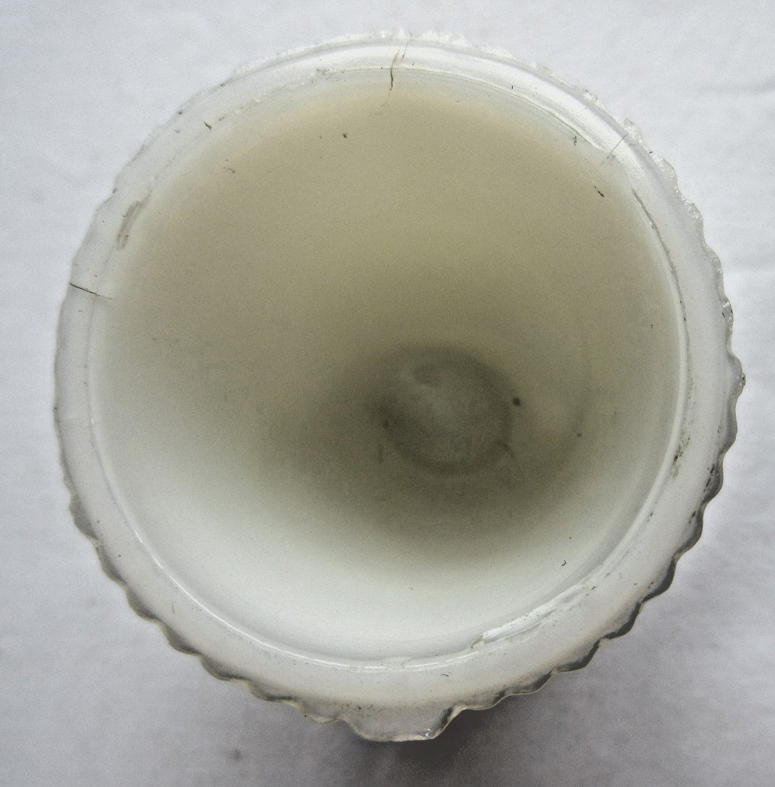 Toothpick holder, white opaline egg cup: Container in one hand, Portieux?